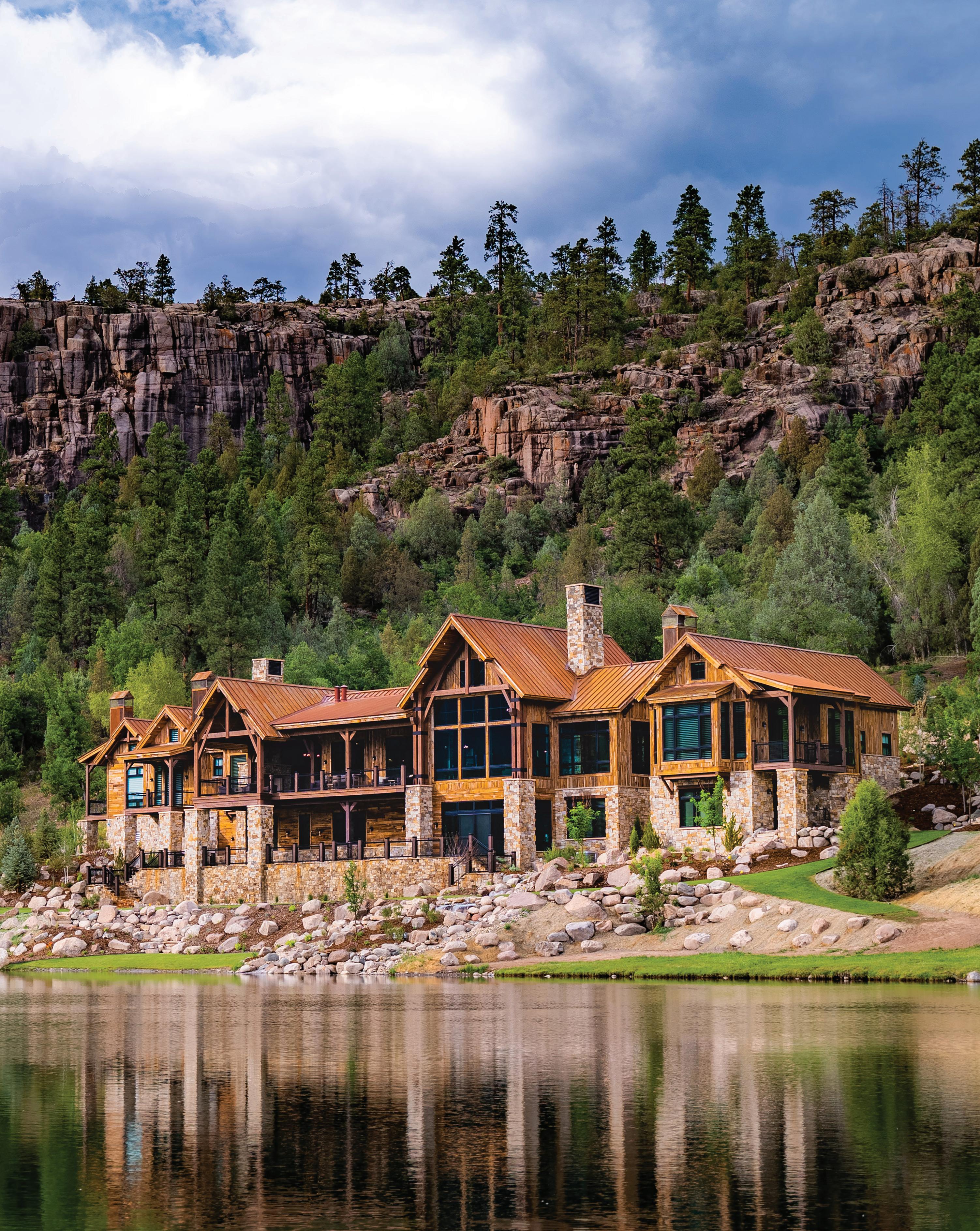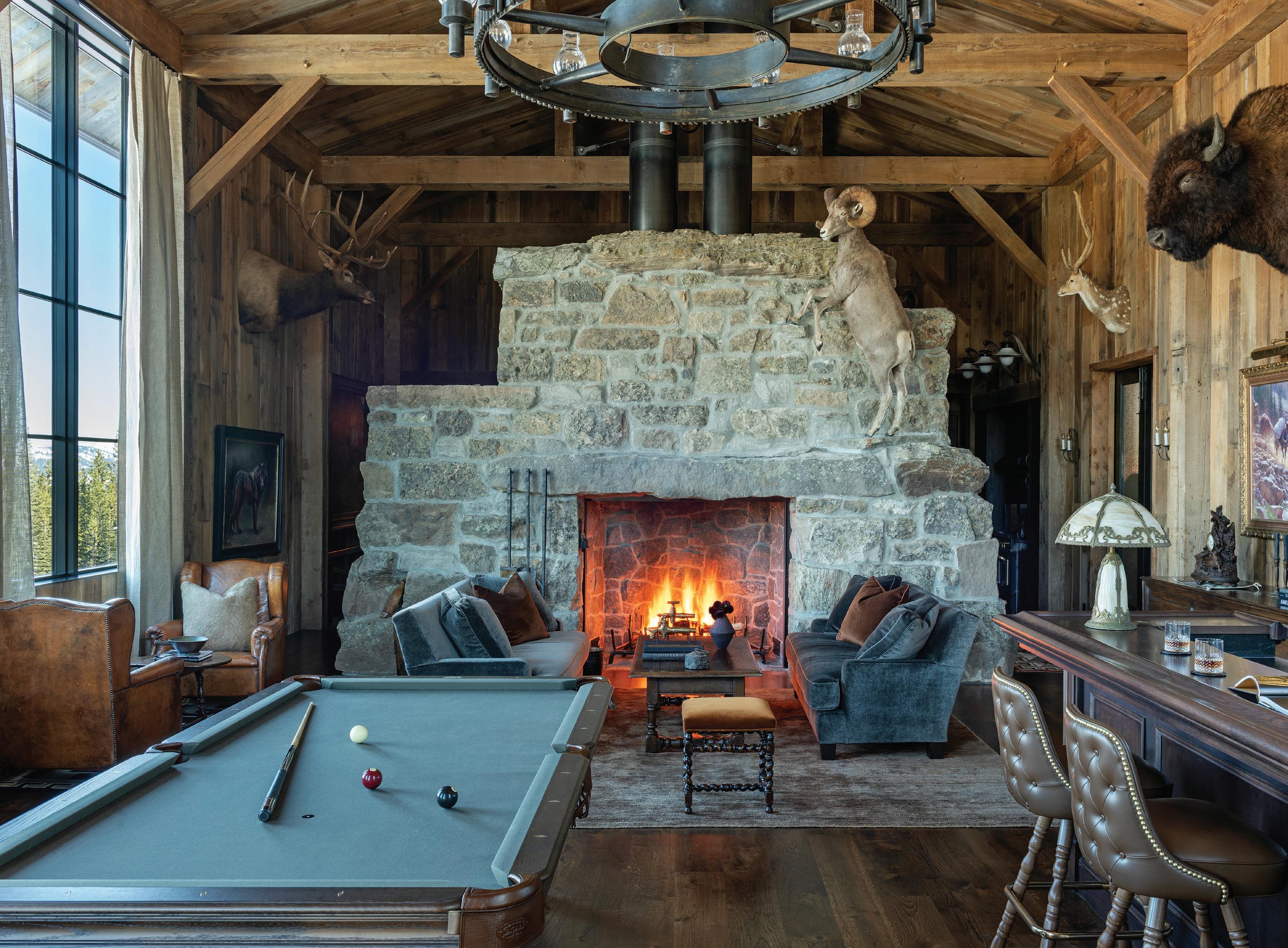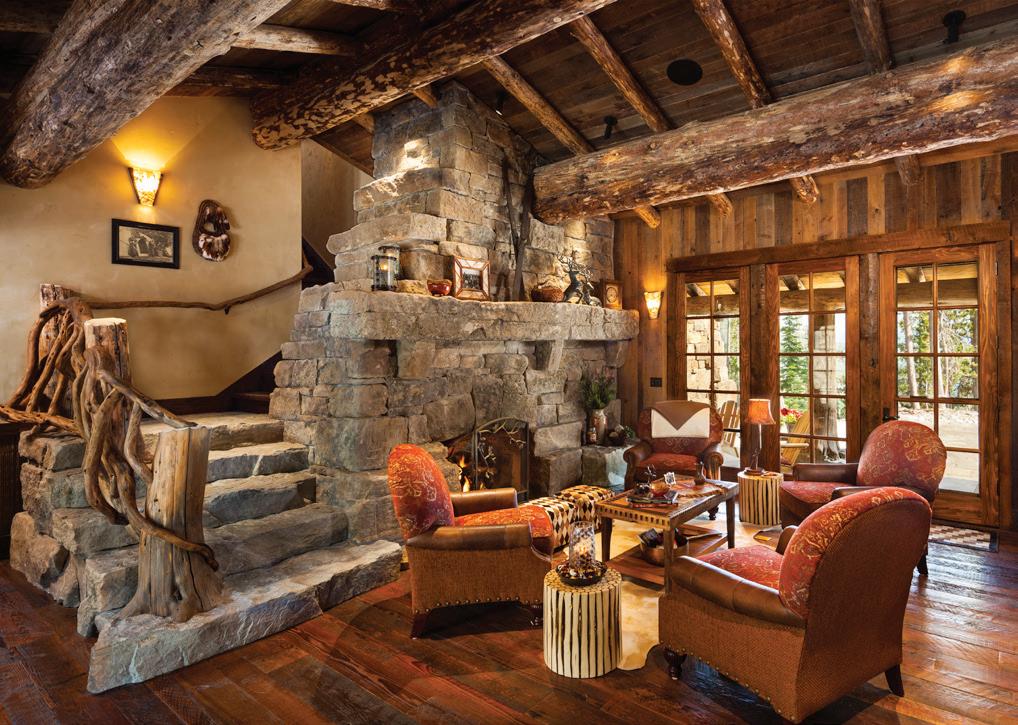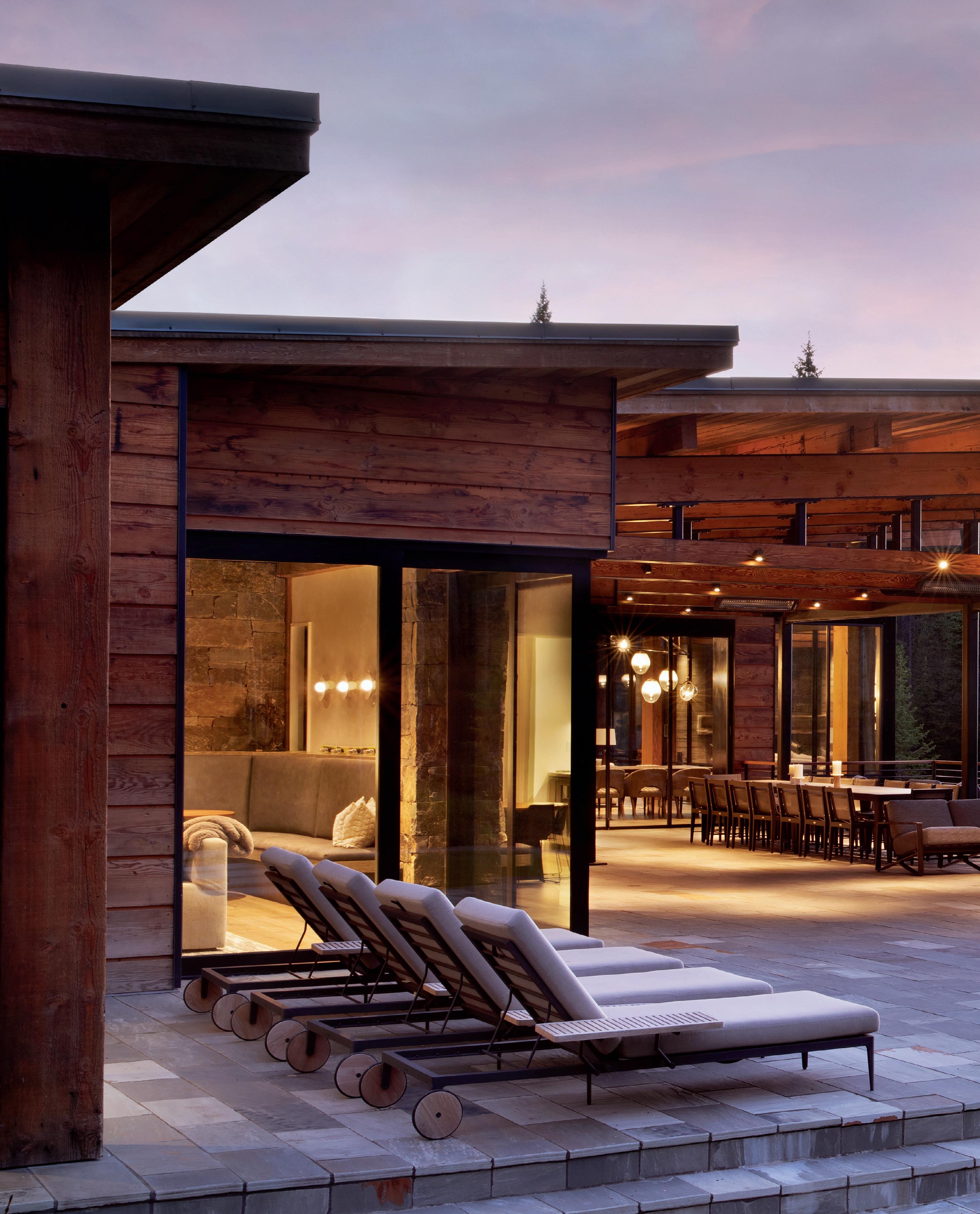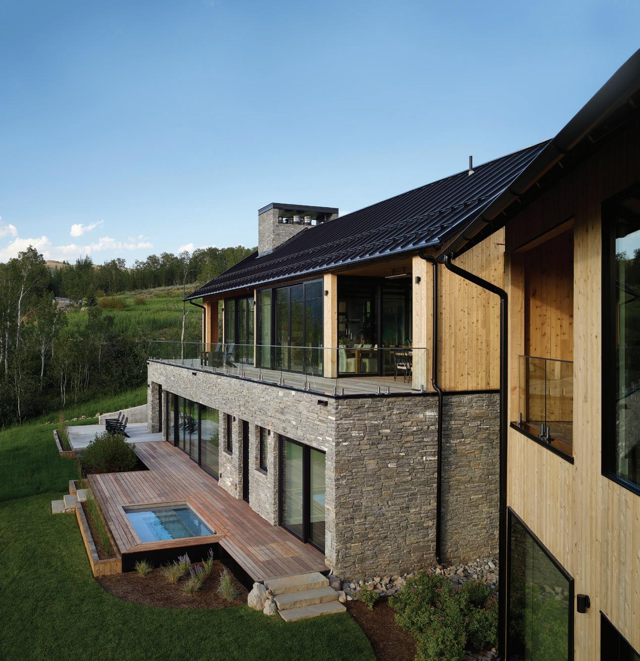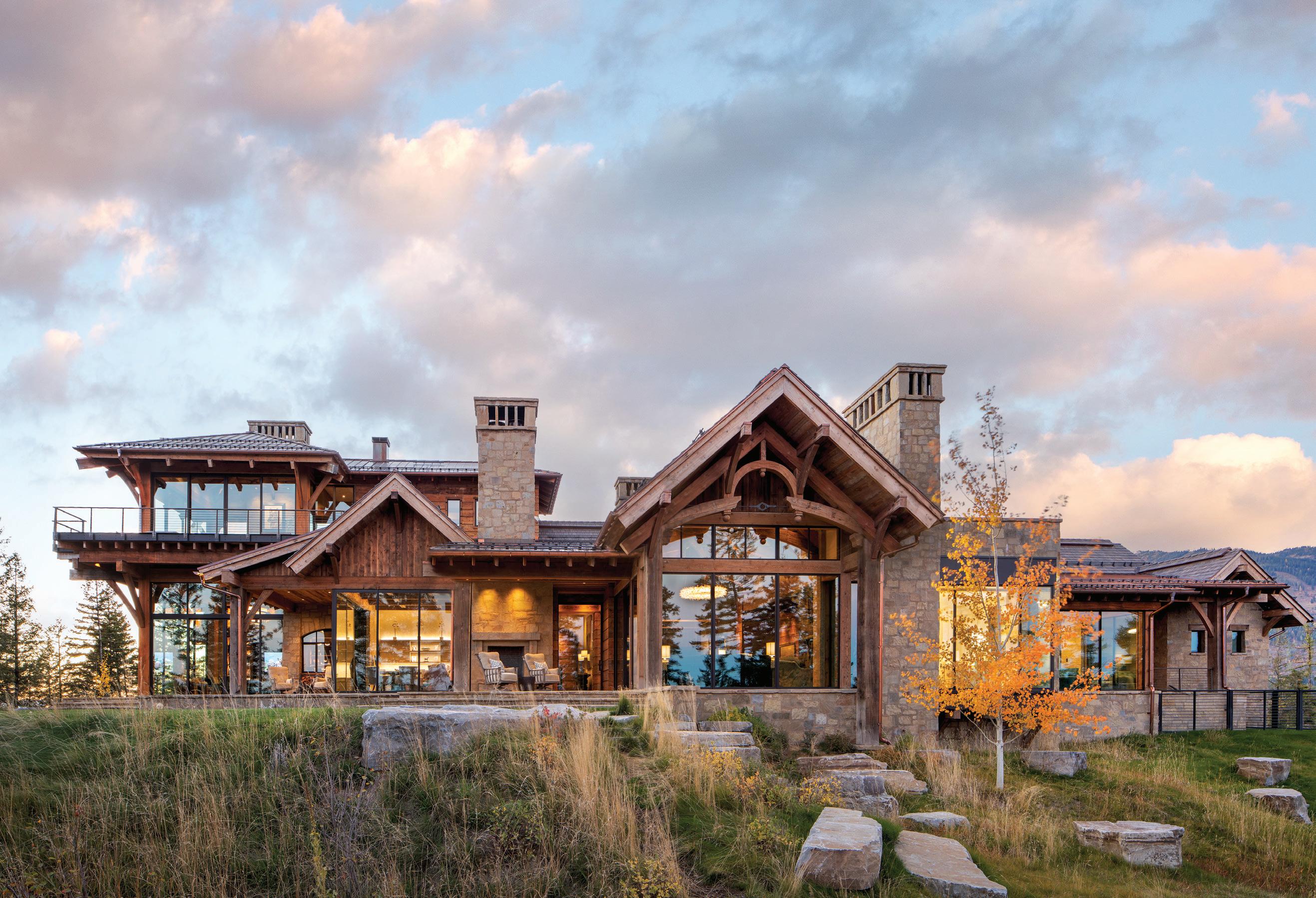 The inspiration for this R o cky Mountain retreat was rooted in nature. The interior design balances scale with intimacy, ensuring the home feels welcoming rather than overwhelming. • Locati Architects designed the home to facilitate enjoyment of the outdoors for multiple generations. A pool house with three-story waterslides does the trick for the grandchildren during the summertime.