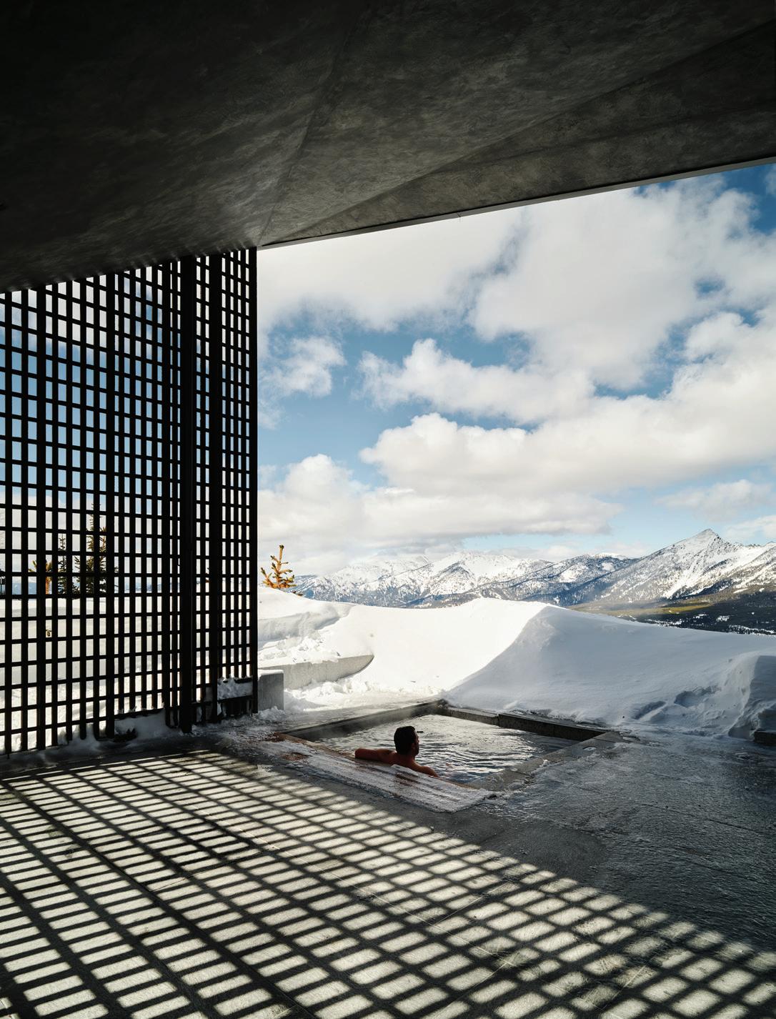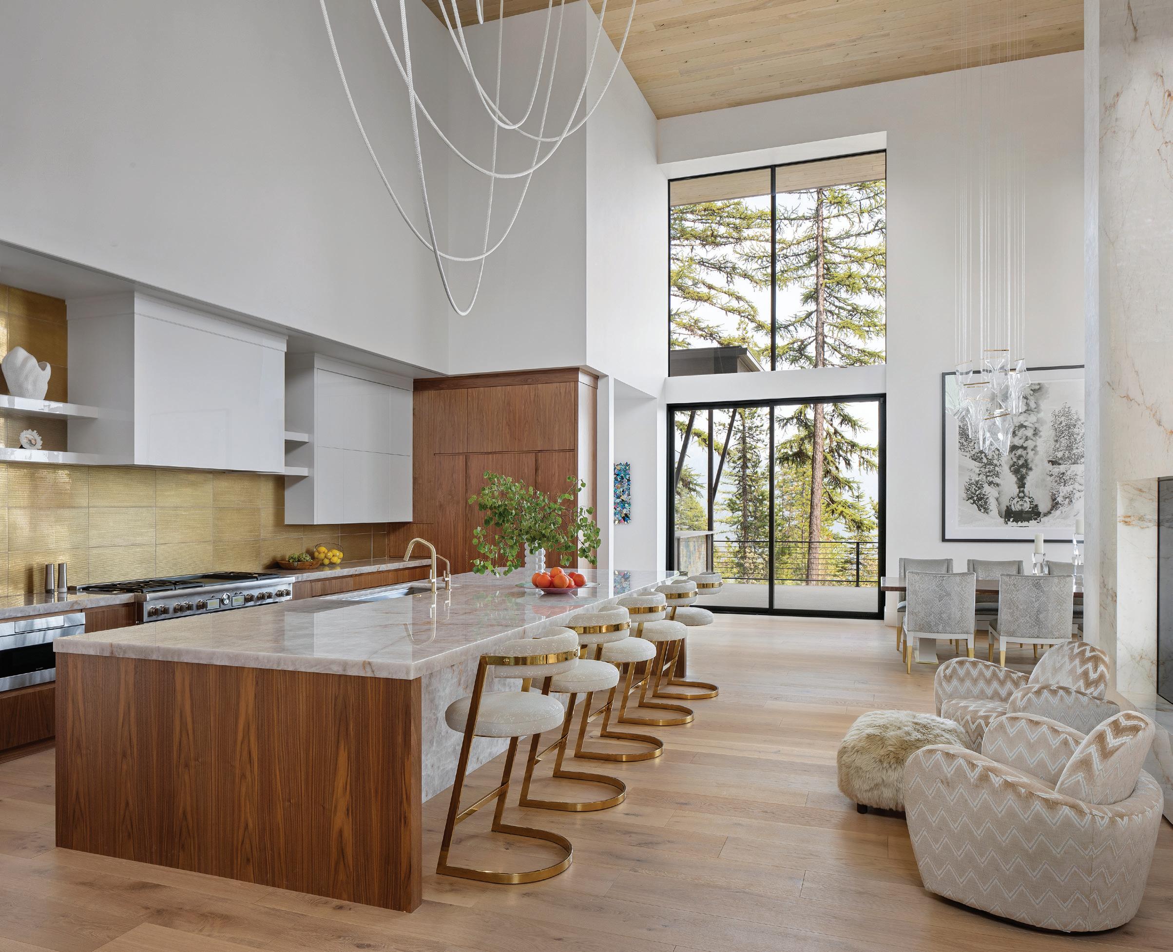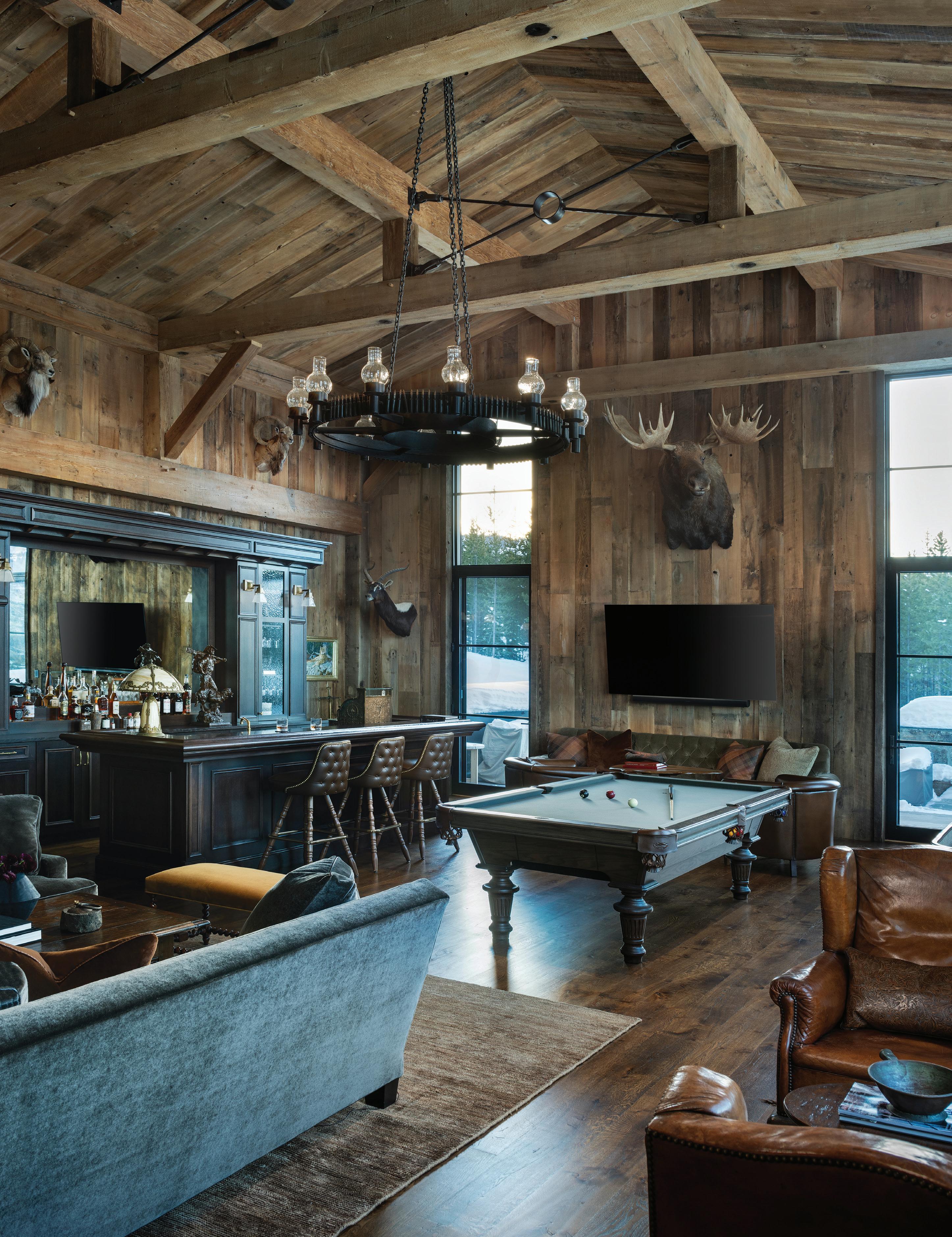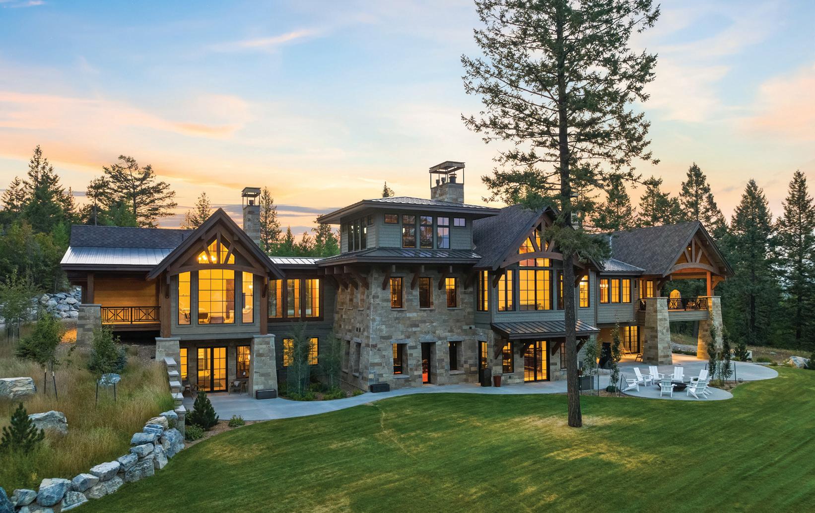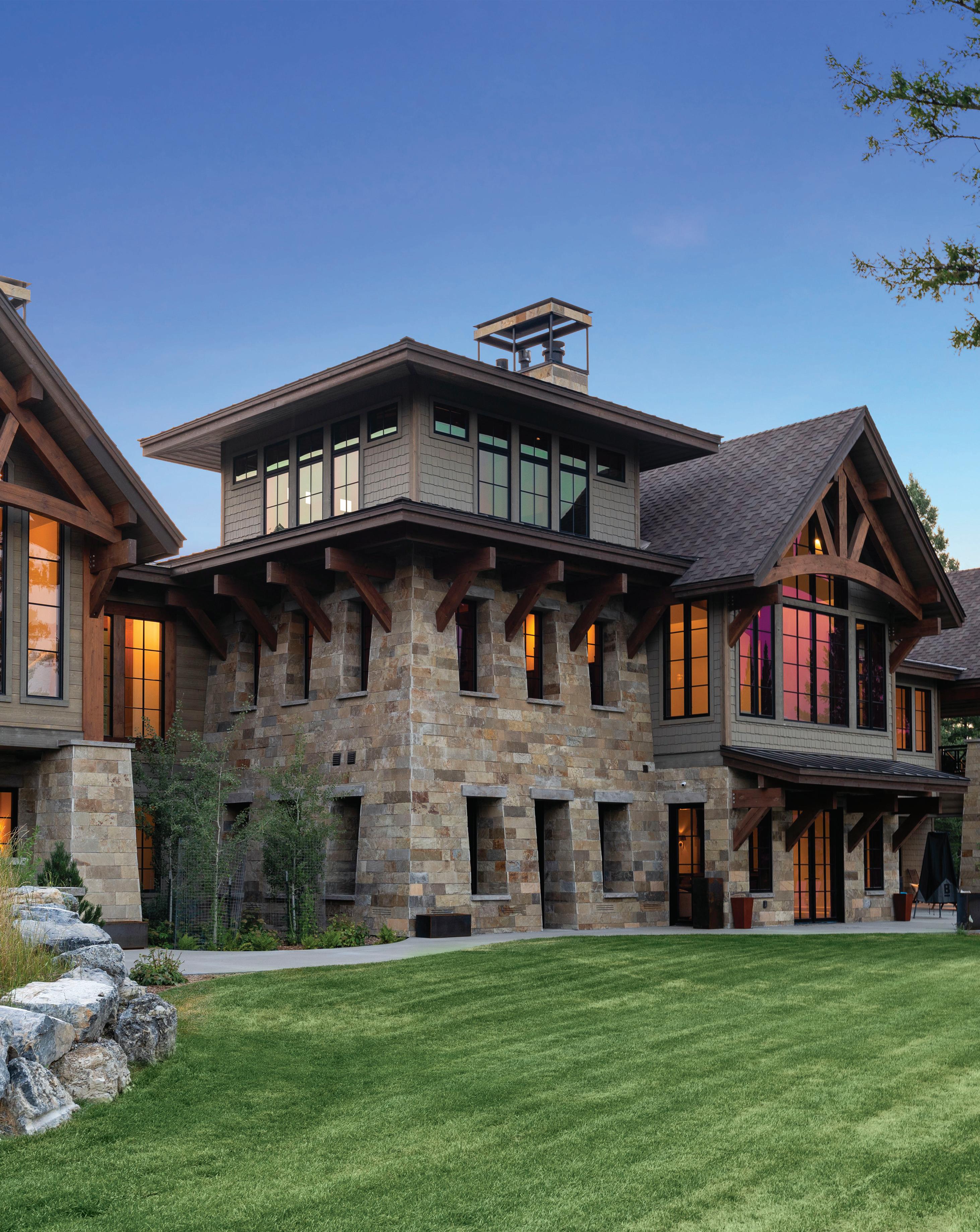 The inspiration for this R o cky Mountain retreat was rooted in nature. The interior design balances scale with intimacy, ensuring the home feels welcoming rather than overwhelming. • Locati Architects designed the home to facilitate enjoyment of the outdoors for multiple generations. A pool house with three-story waterslides does the trick for the grandchildren during the summertime.