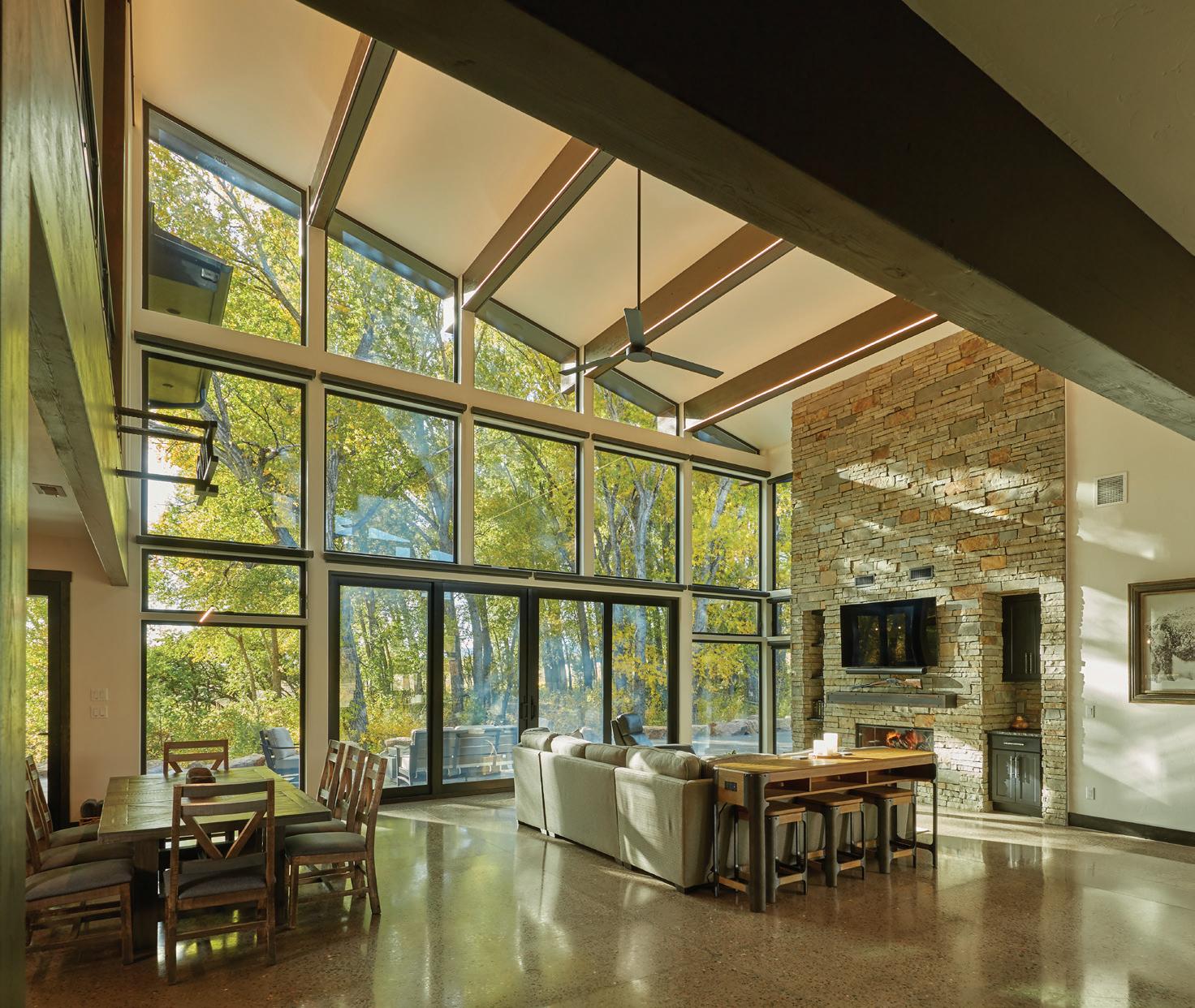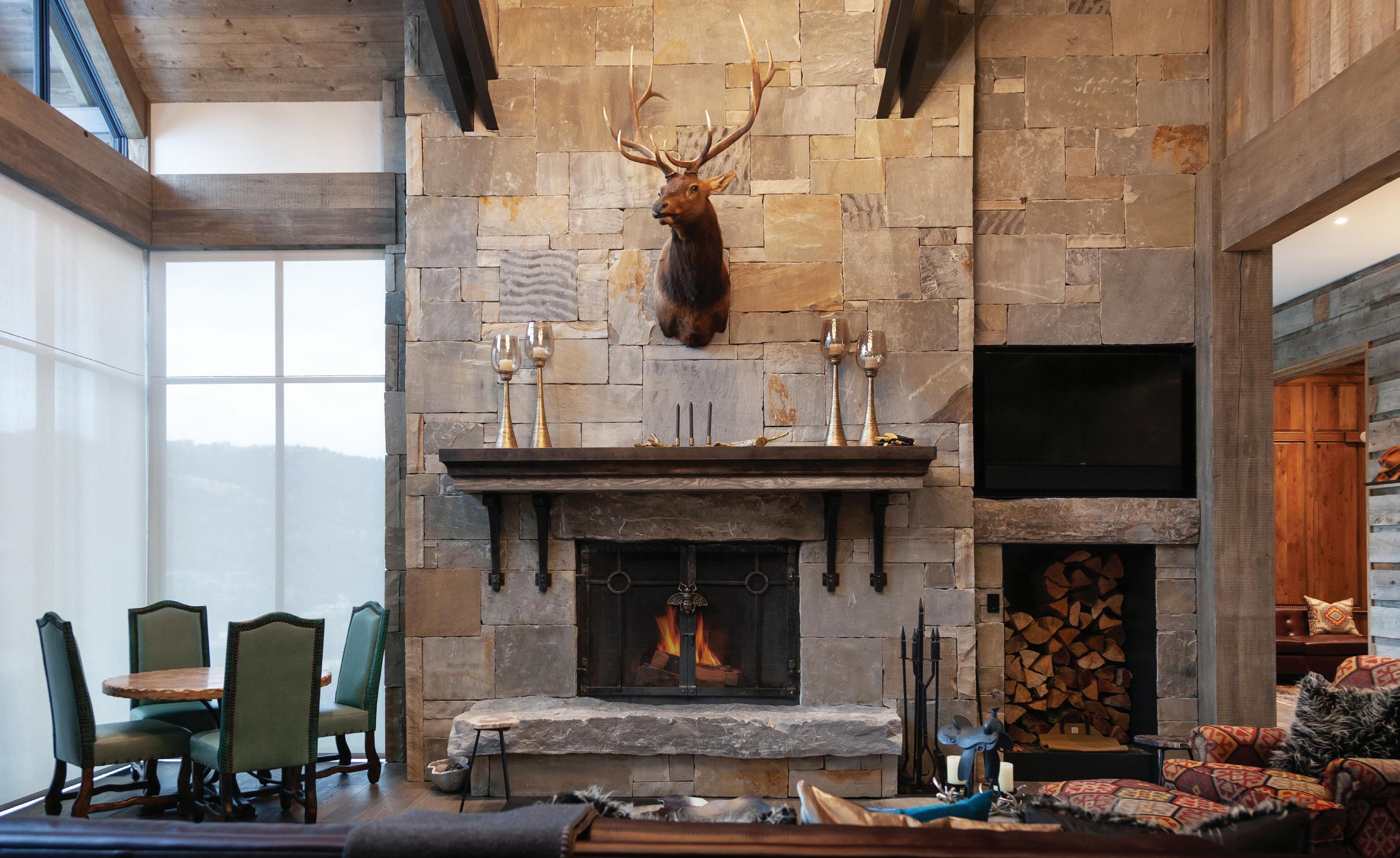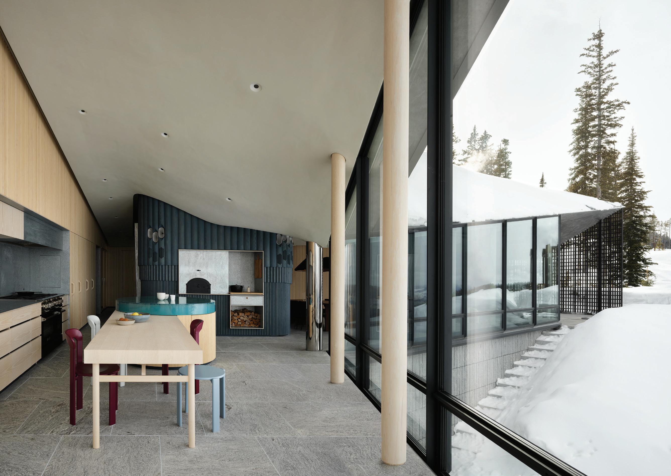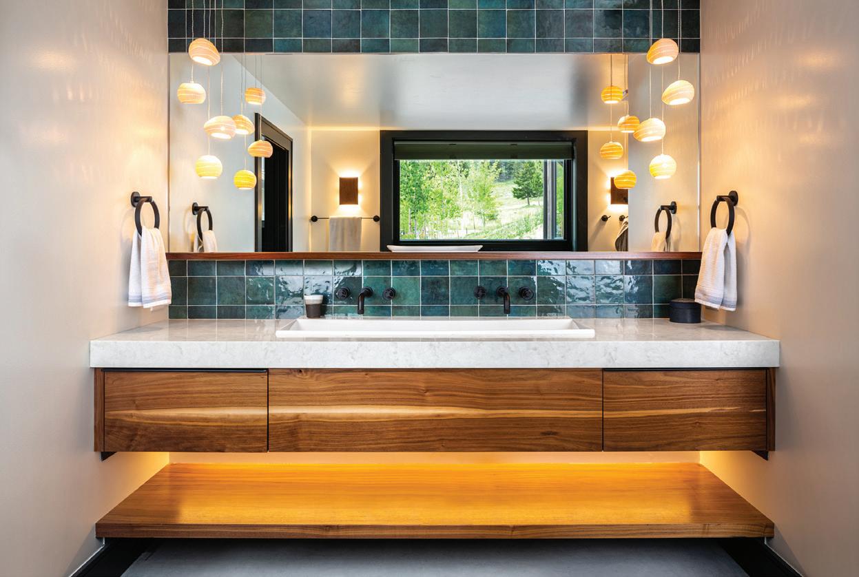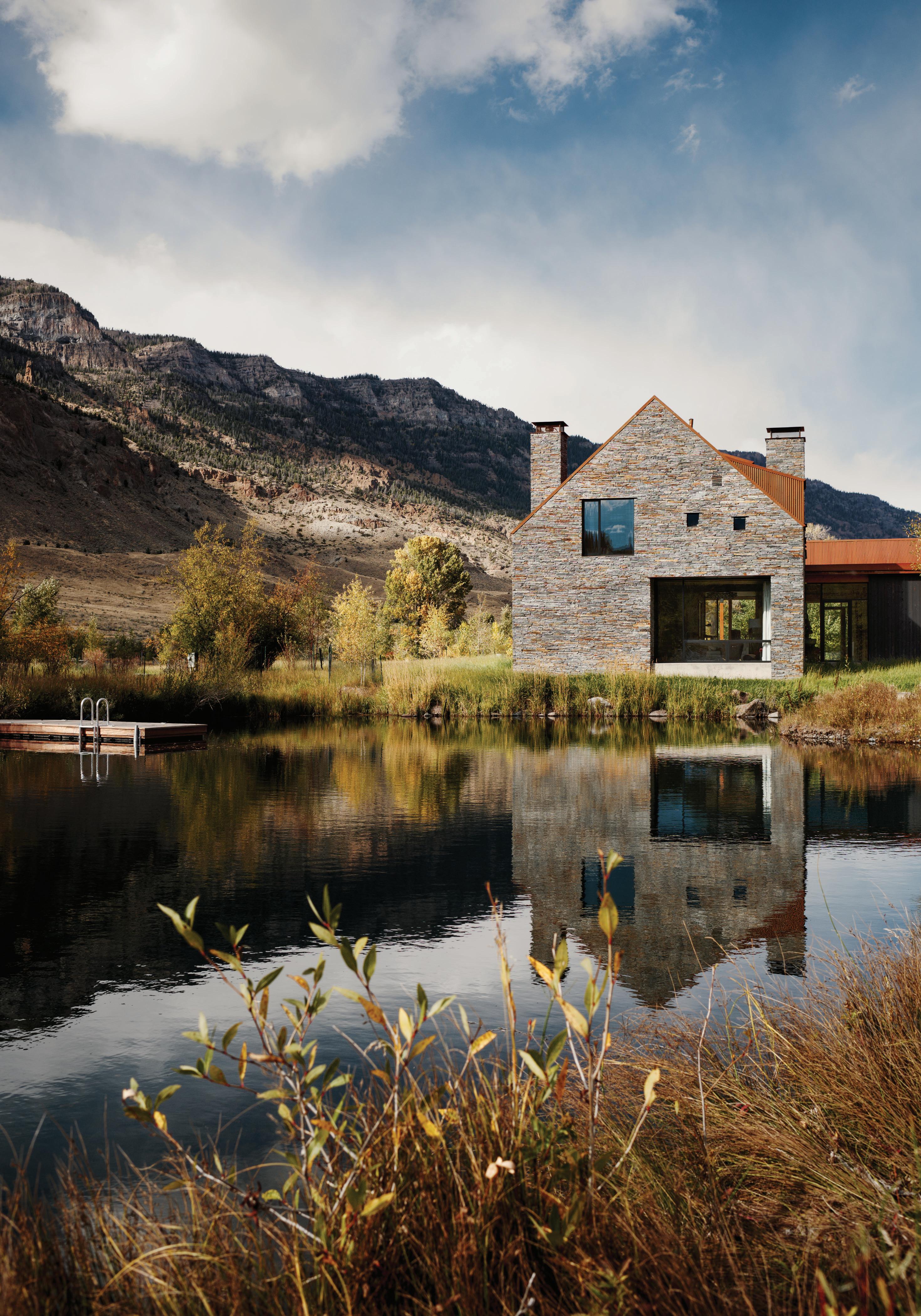 The inspiration for this R o cky Mountain retreat was rooted in nature. The interior design balances scale with intimacy, ensuring the home feels welcoming rather than overwhelming. • Locati Architects designed the home to facilitate enjoyment of the outdoors for multiple generations. A pool house with three-story waterslides does the trick for the grandchildren during the summertime.