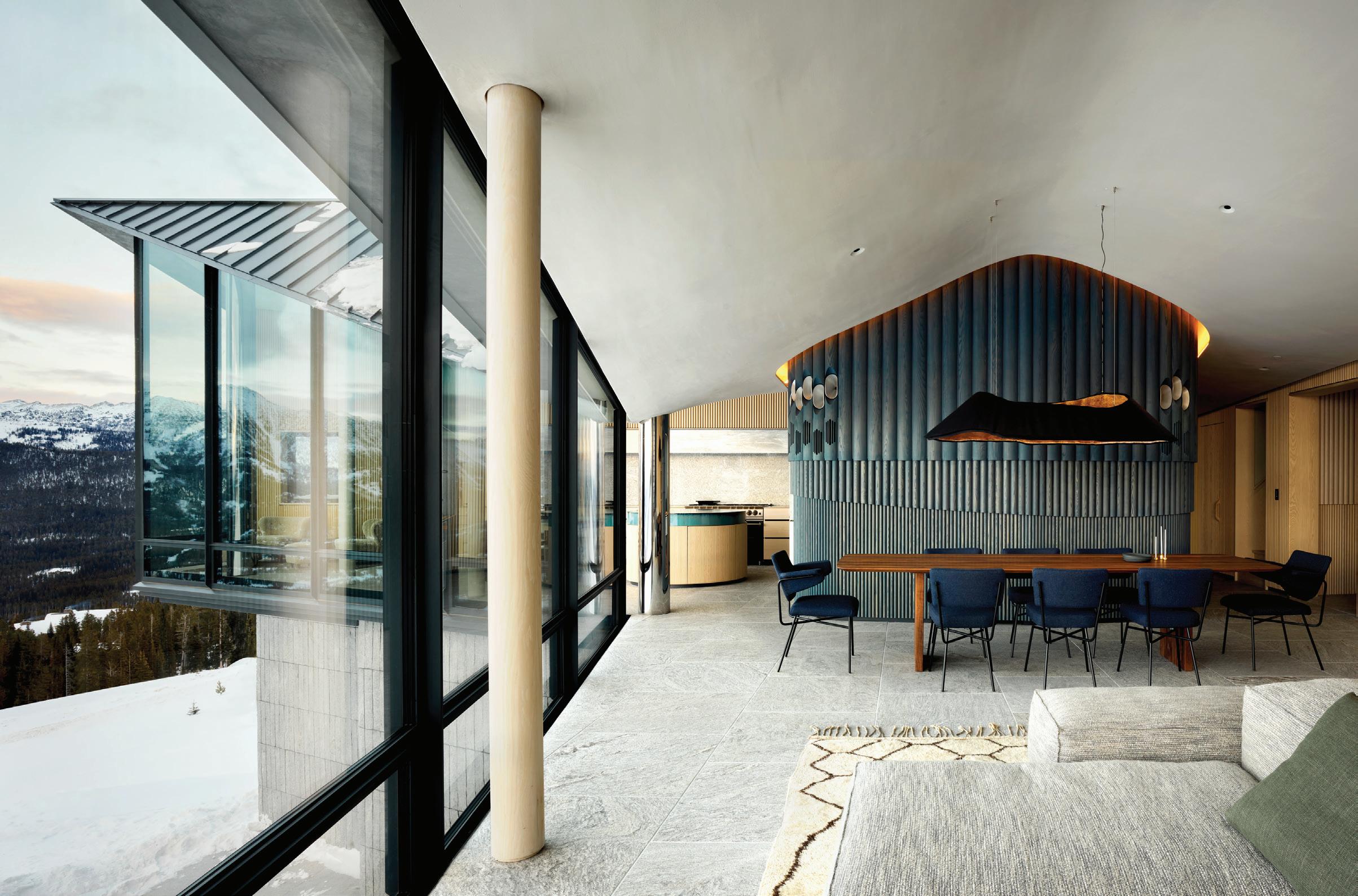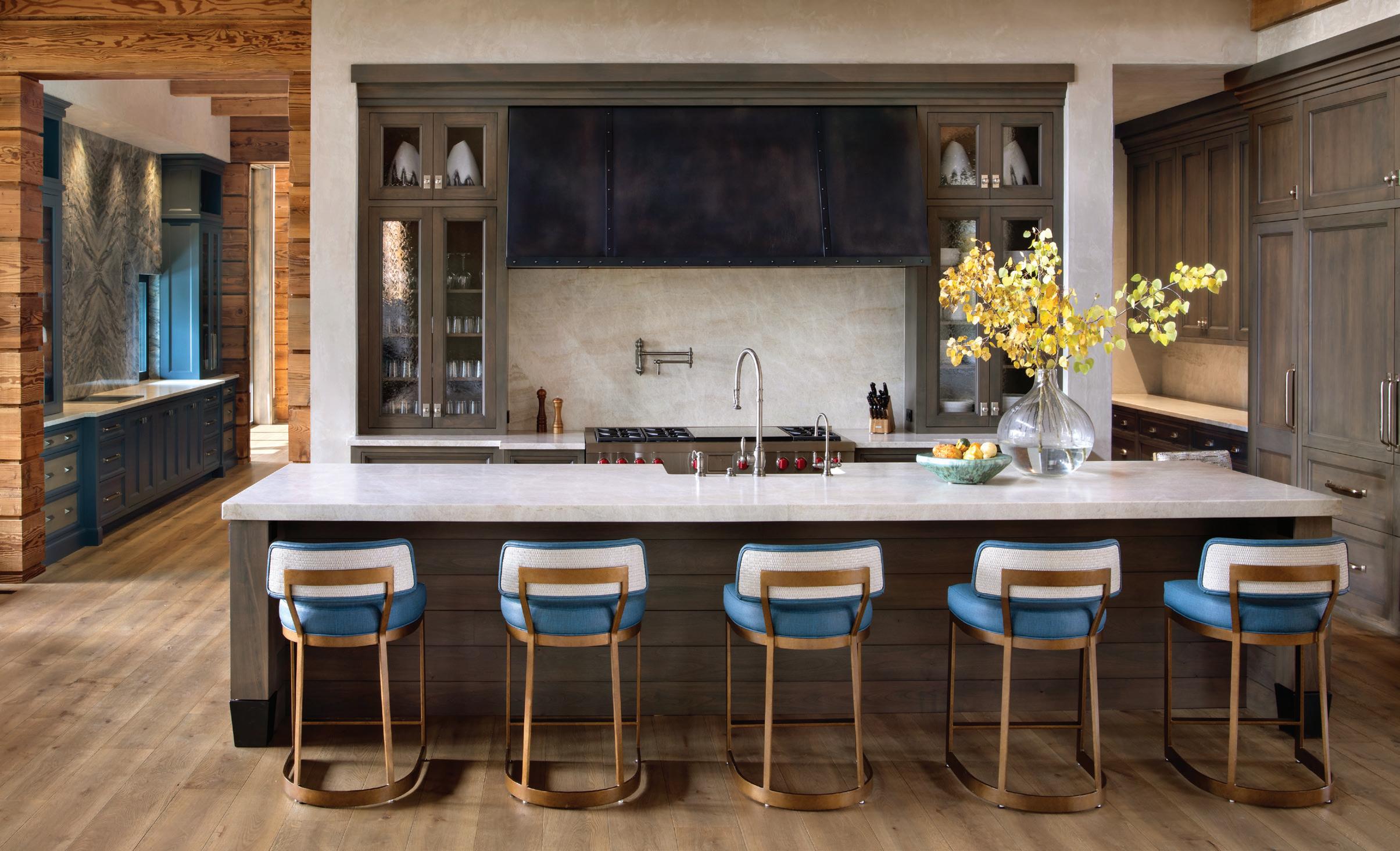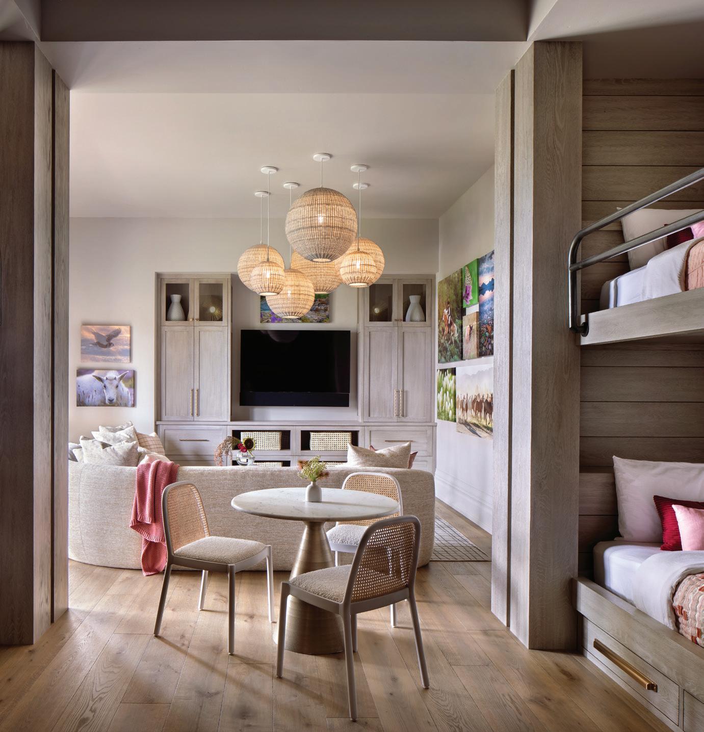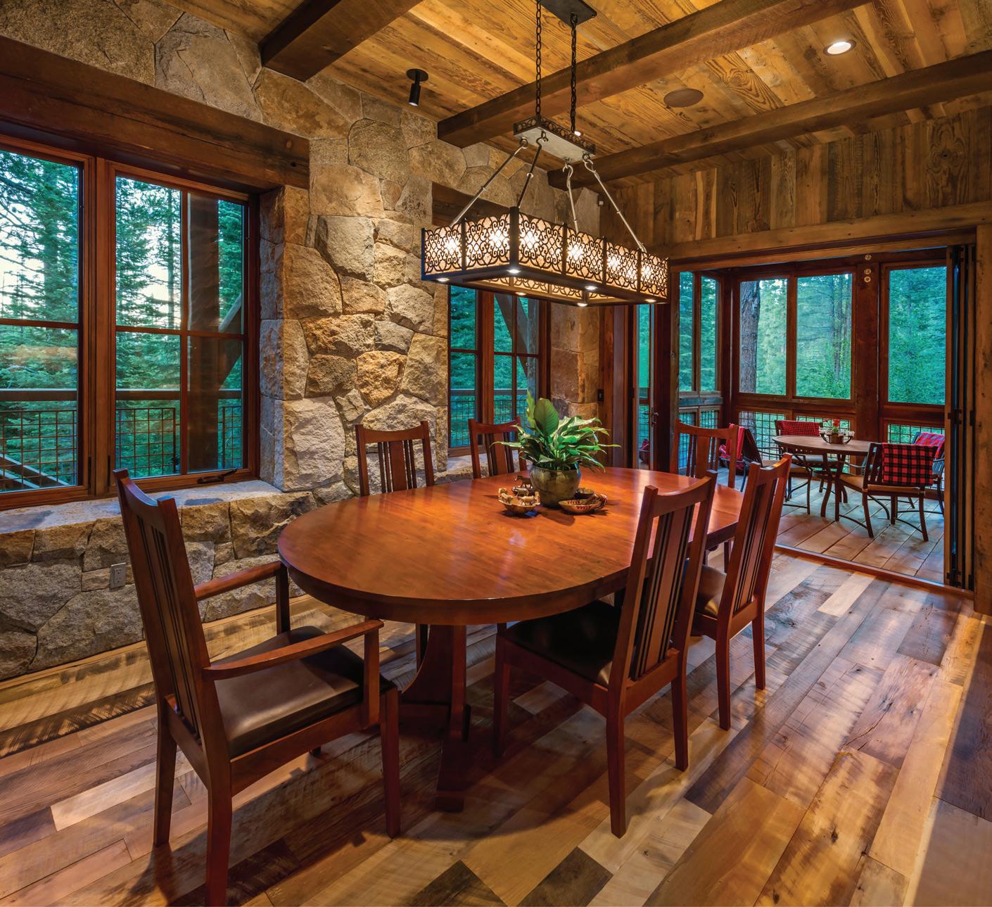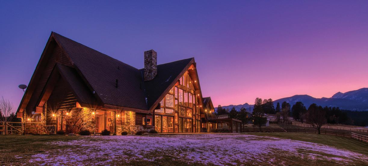 The inspiration for this R o cky Mountain retreat was rooted in nature. The interior design balances scale with intimacy, ensuring the home feels welcoming rather than overwhelming. • Locati Architects designed the home to facilitate enjoyment of the outdoors for multiple generations. A pool house with three-story waterslides does the trick for the grandchildren during the summertime.