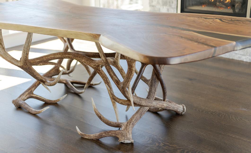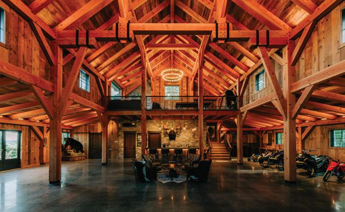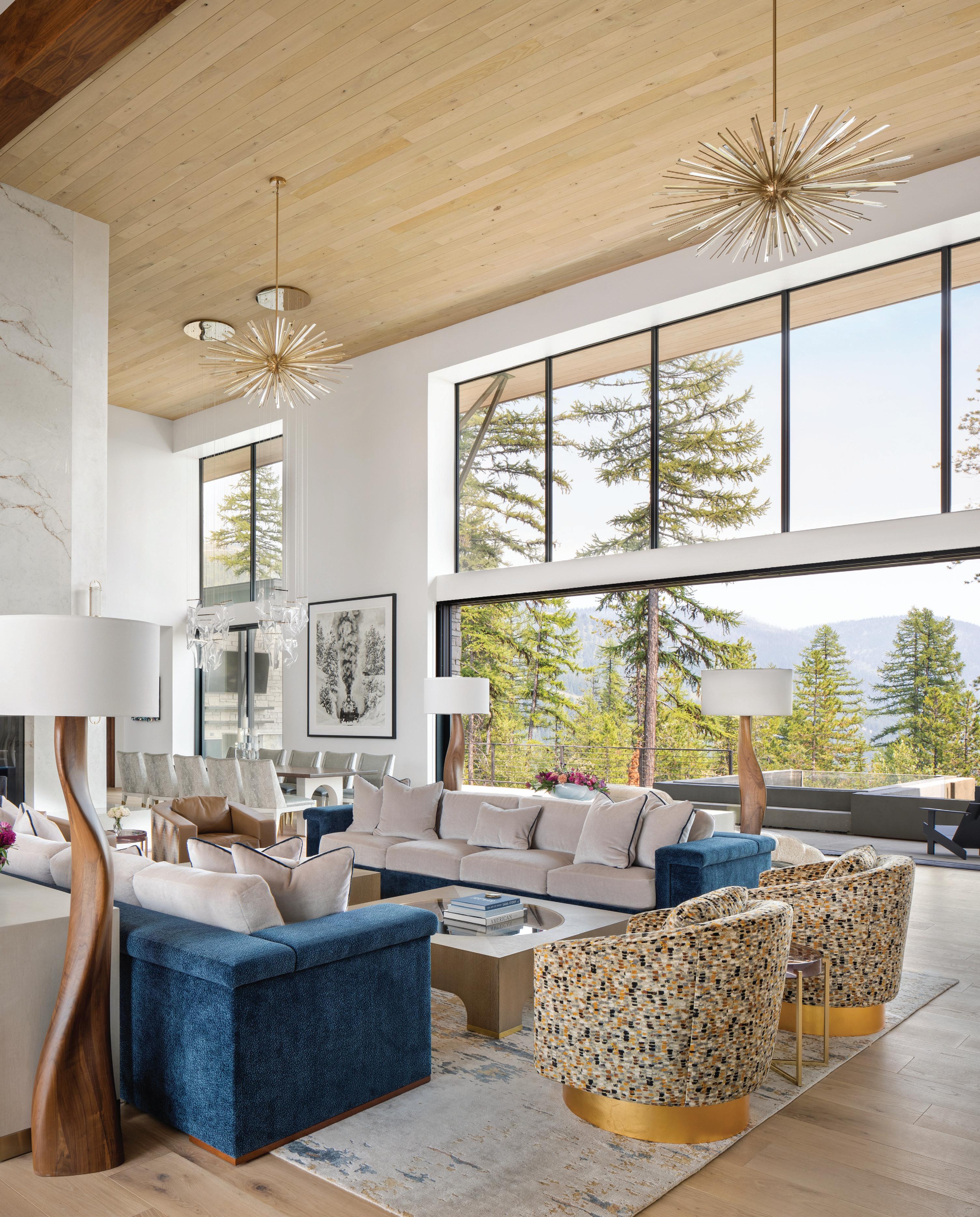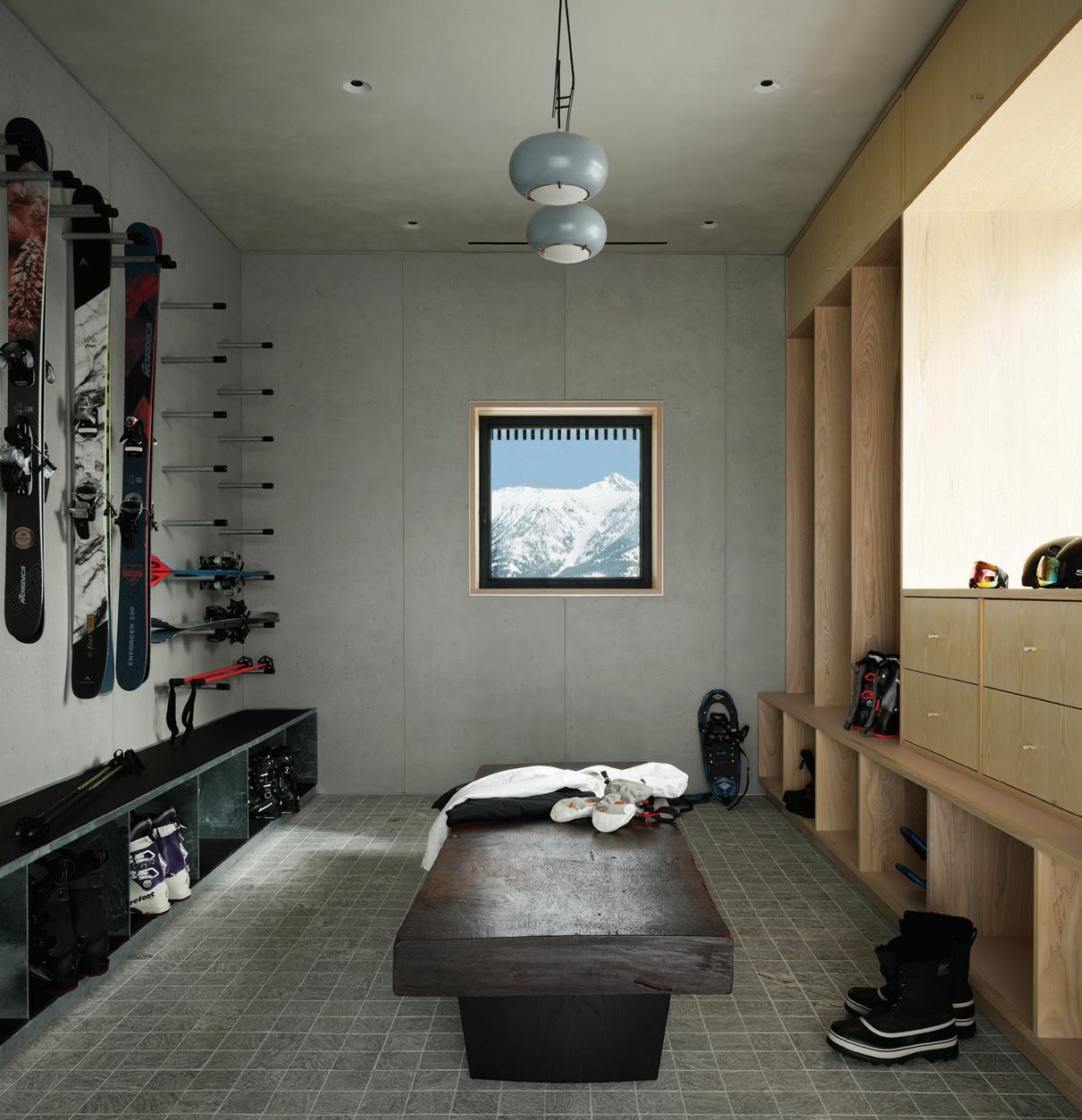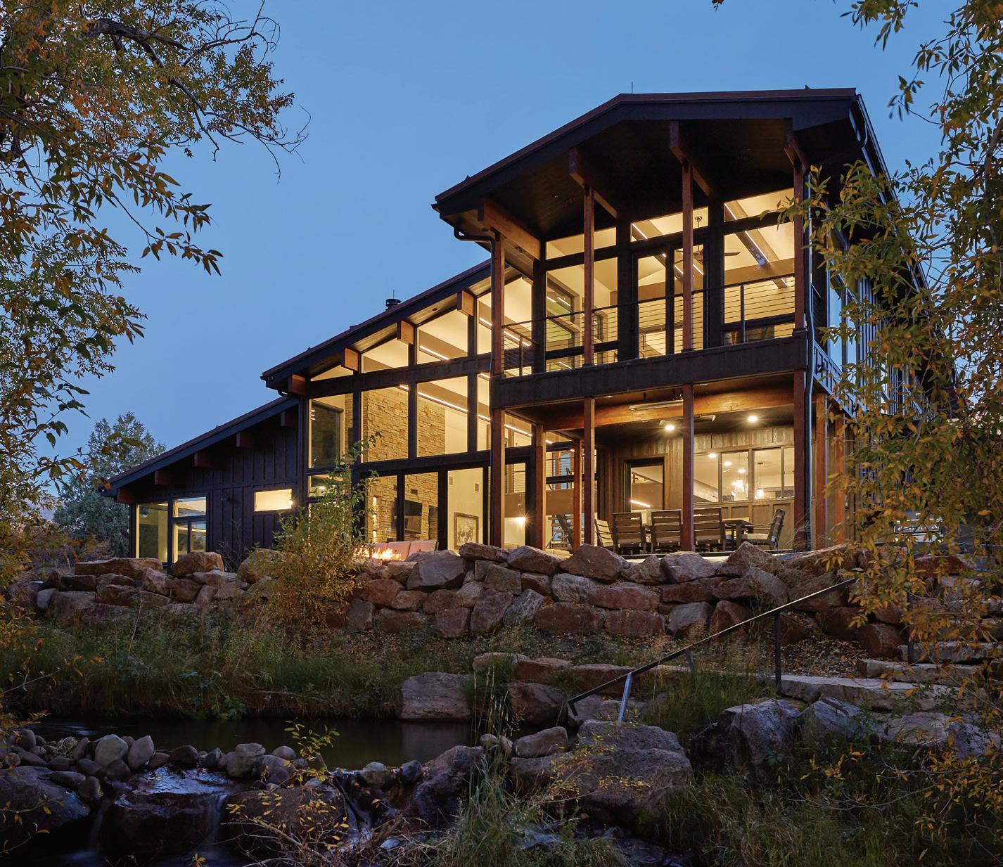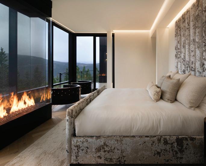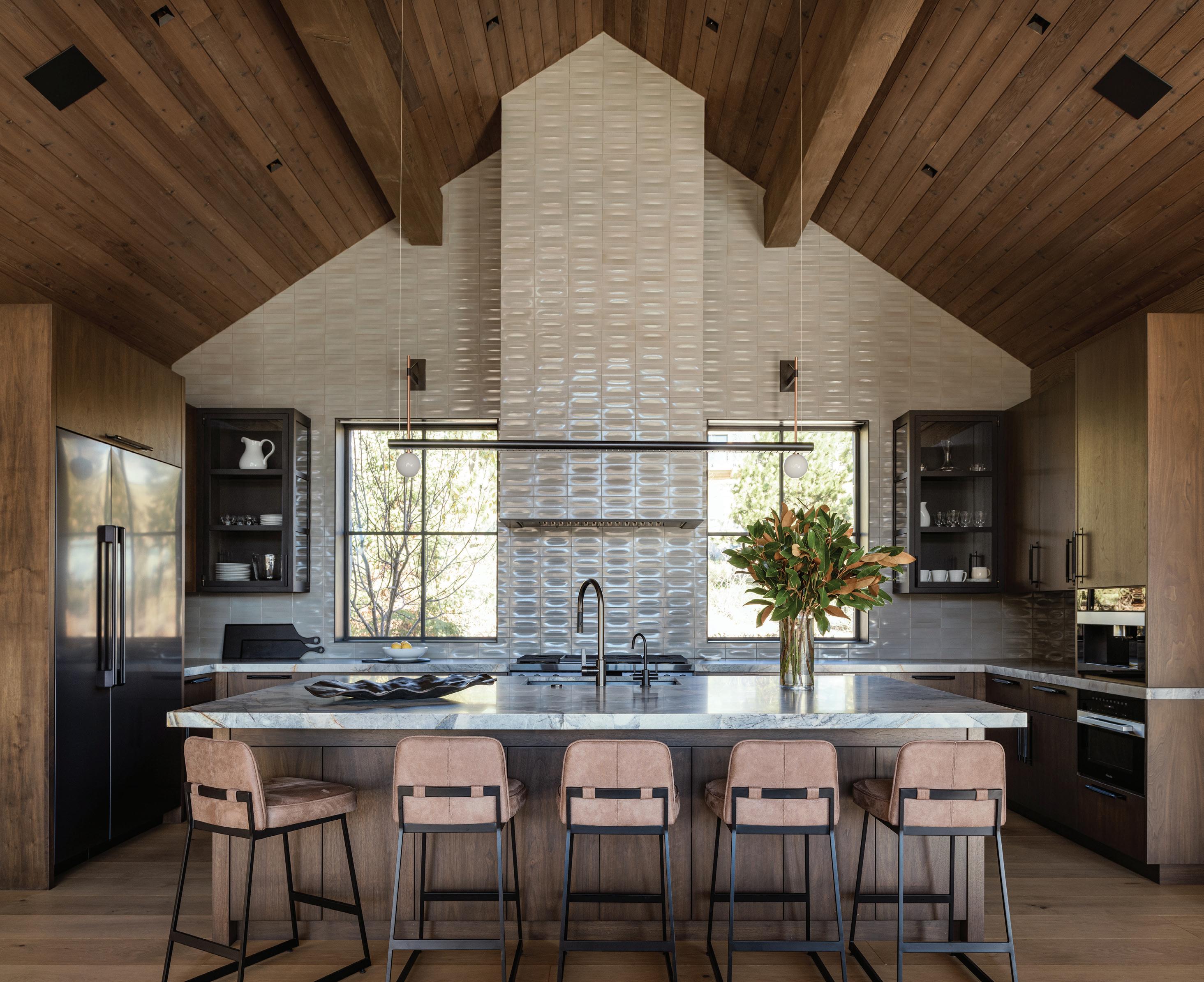 The inspiration for this R o cky Mountain retreat was rooted in nature. The interior design balances scale with intimacy, ensuring the home feels welcoming rather than overwhelming. • Locati Architects designed the home to facilitate enjoyment of the outdoors for multiple generations. A pool house with three-story waterslides does the trick for the grandchildren during the summertime.