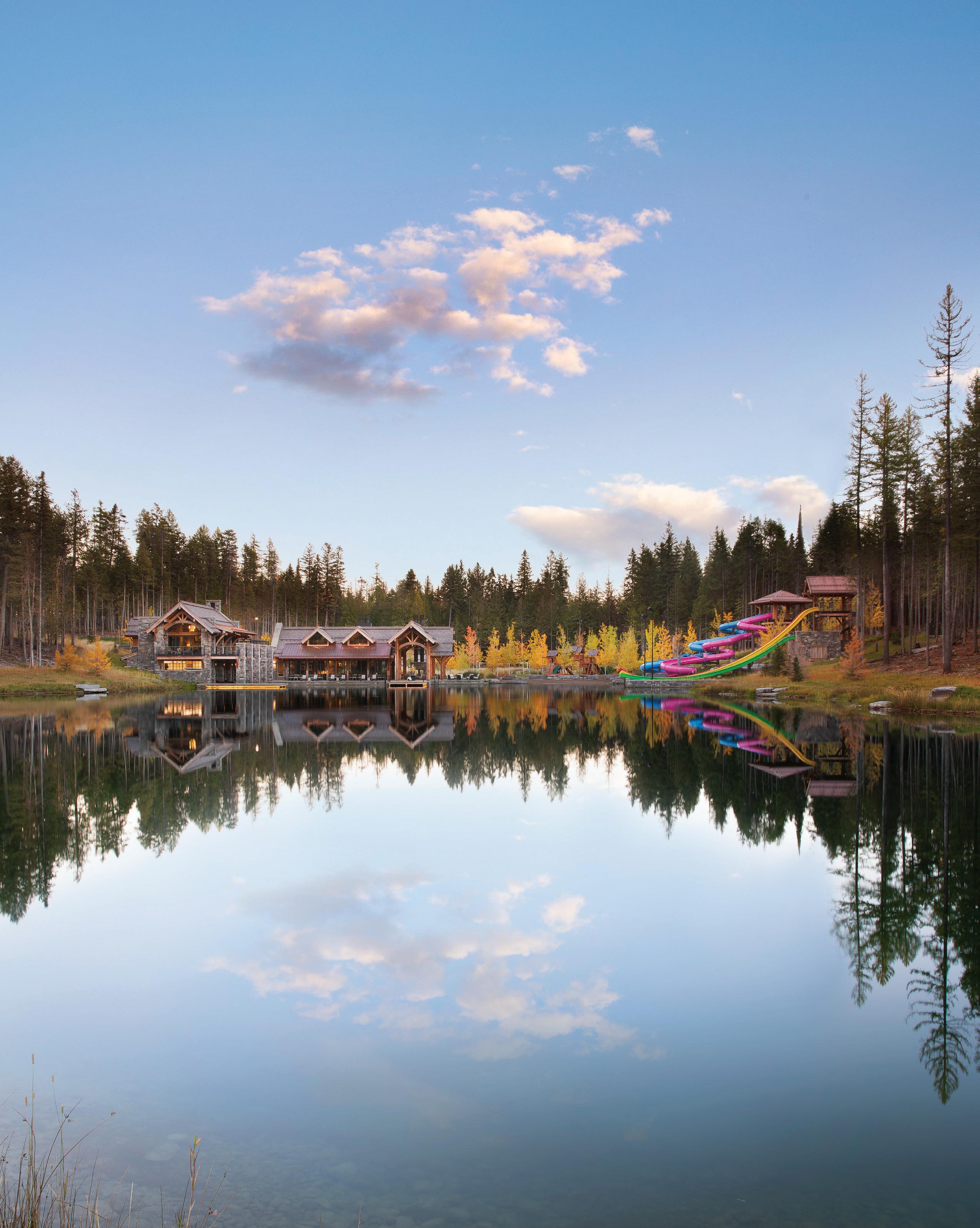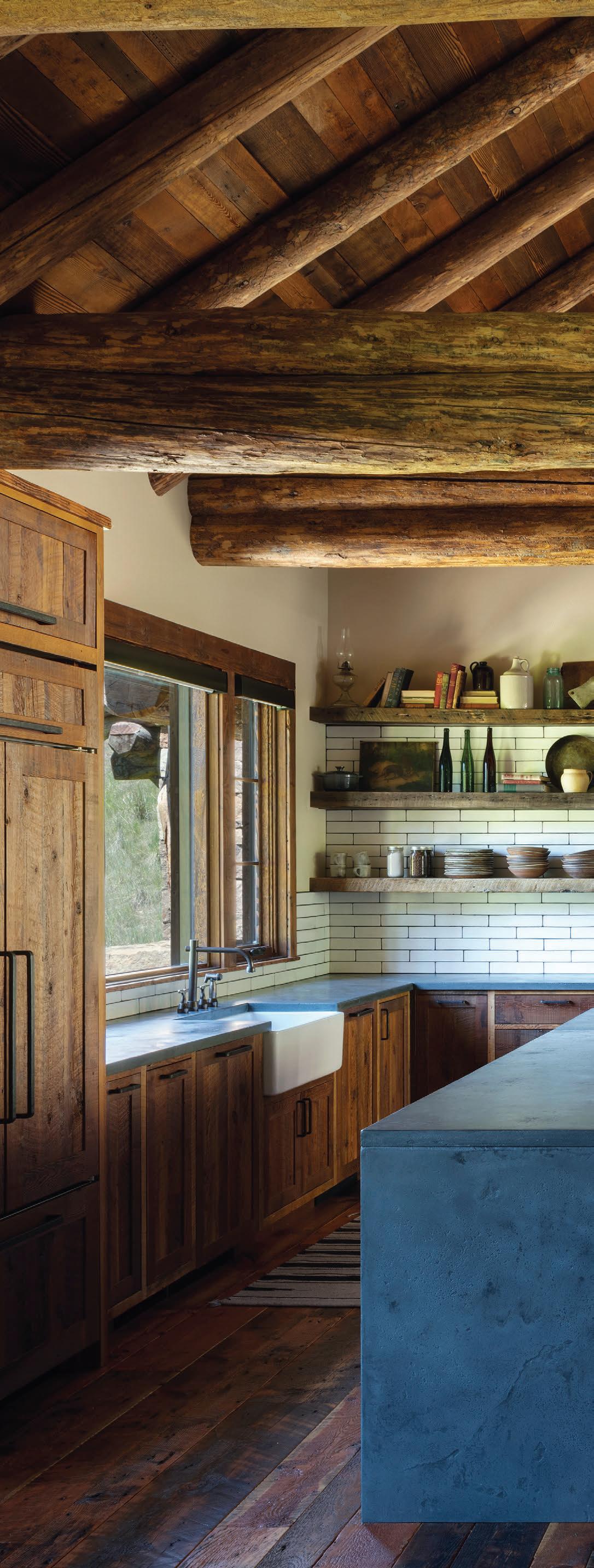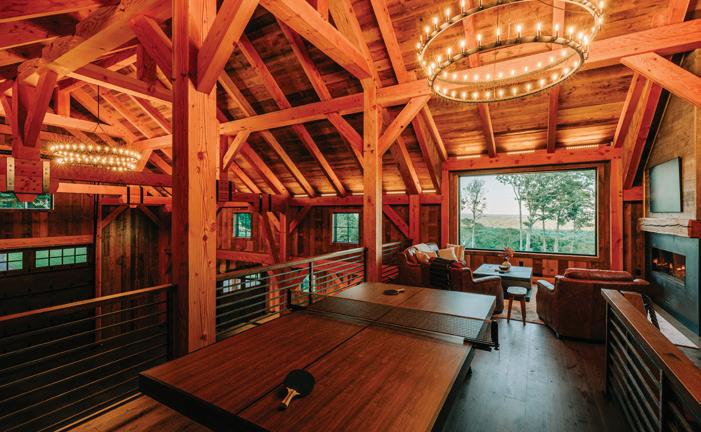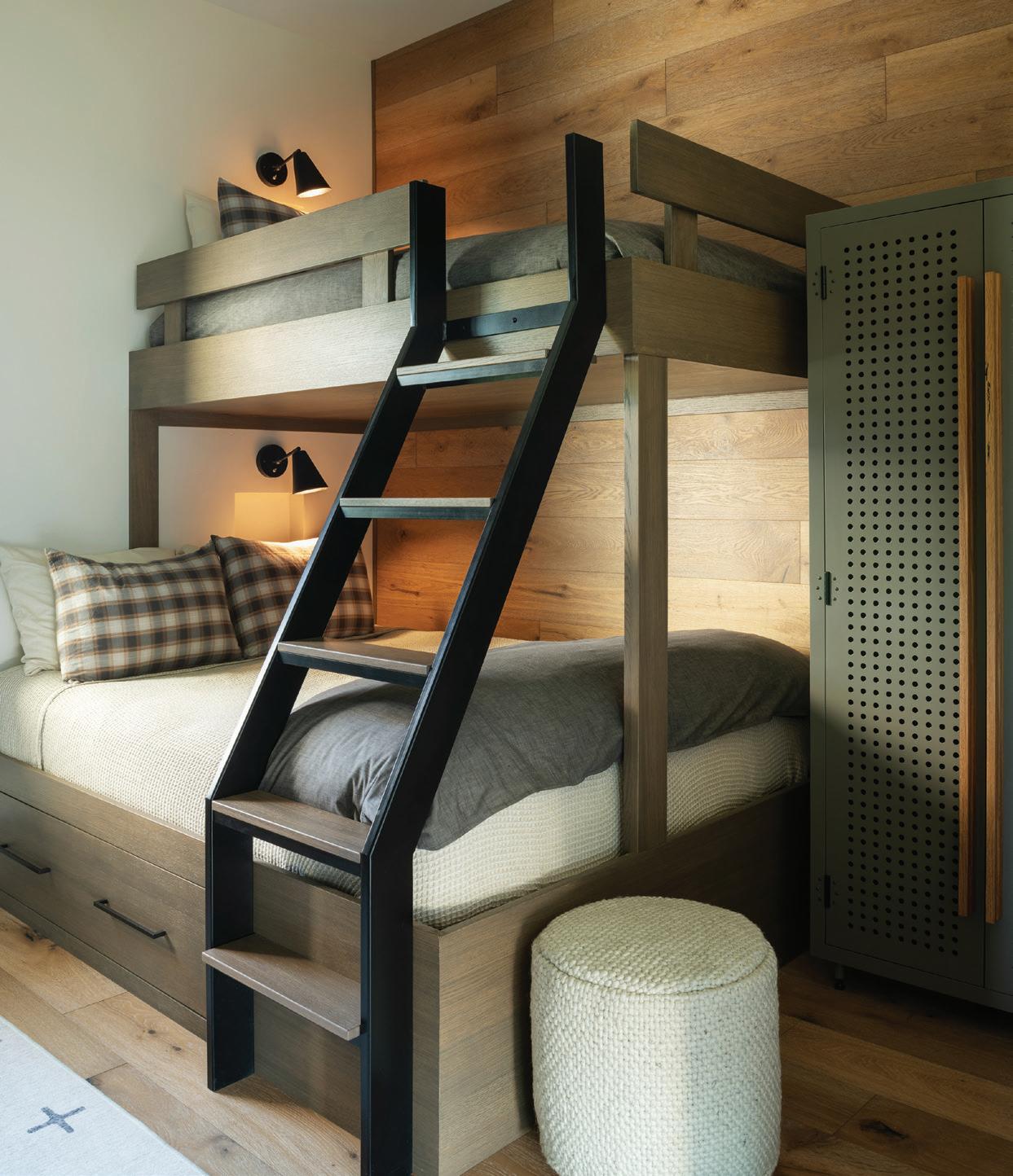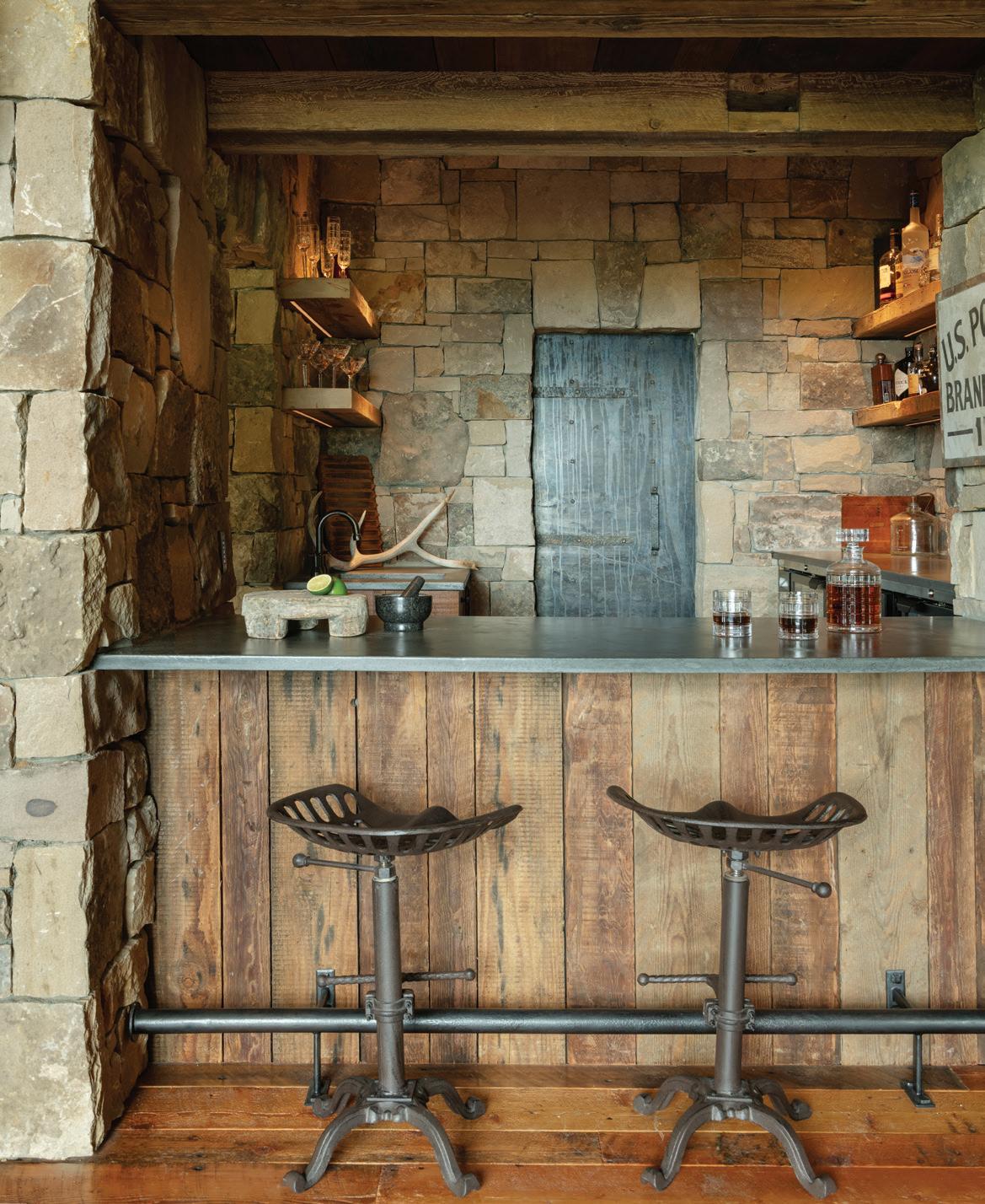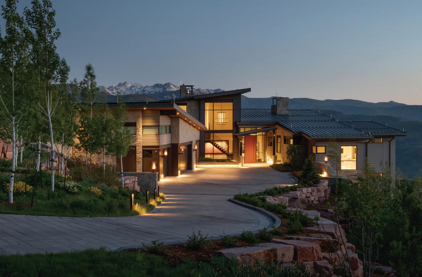 The inspiration for this R o cky Mountain retreat was rooted in nature. The interior design balances scale with intimacy, ensuring the home feels welcoming rather than overwhelming. • Locati Architects designed the home to facilitate enjoyment of the outdoors for multiple generations. A pool house with three-story waterslides does the trick for the grandchildren during the summertime.