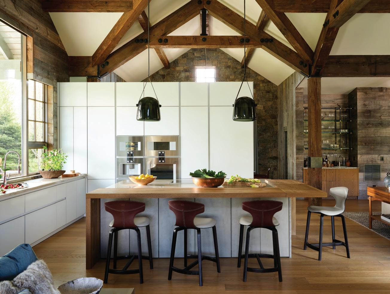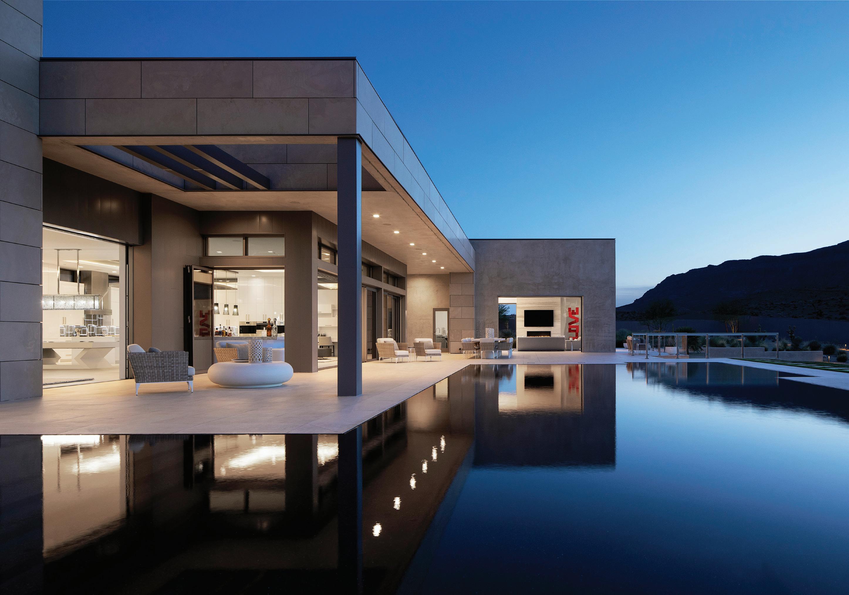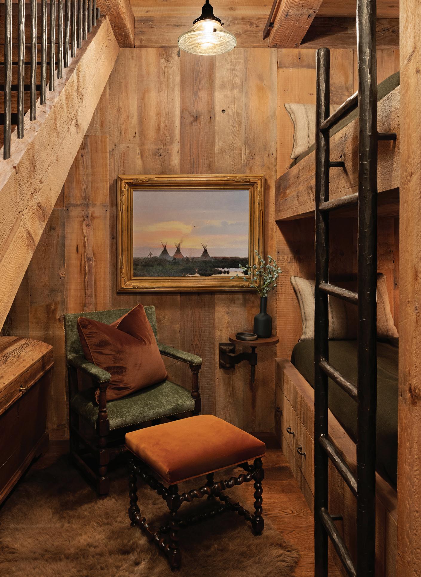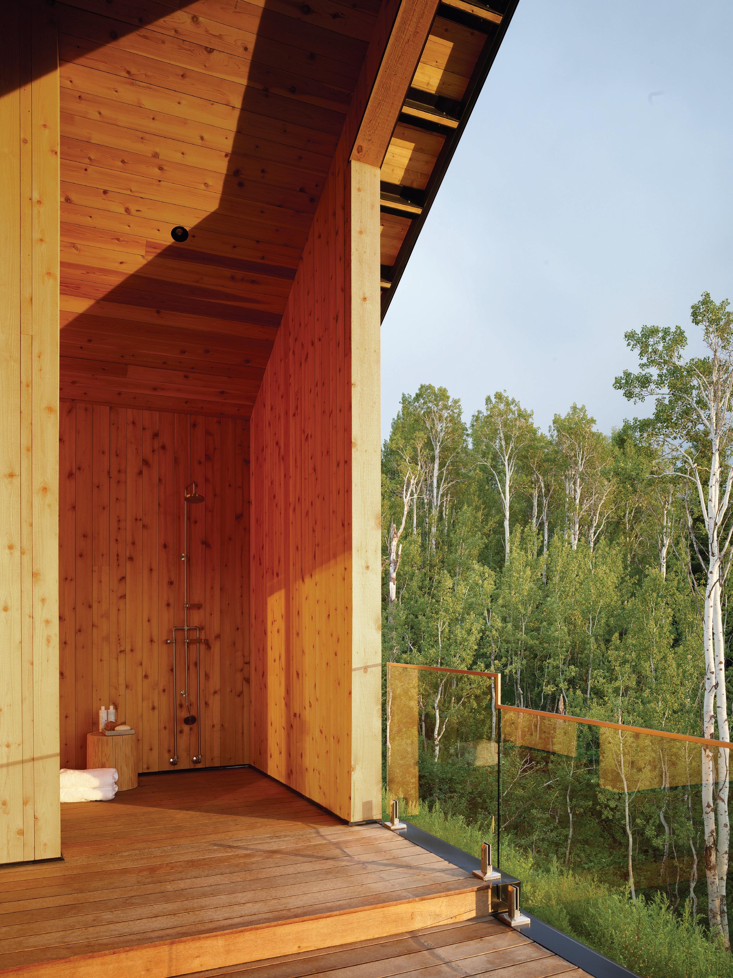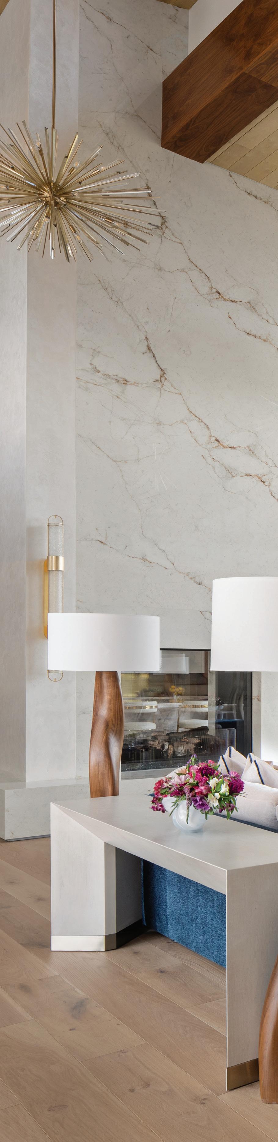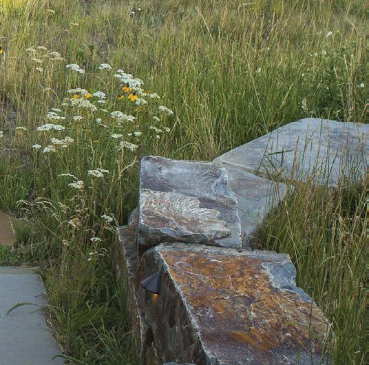 The inspiration for this R o cky Mountain retreat was rooted in nature. The interior design balances scale with intimacy, ensuring the home feels welcoming rather than overwhelming. • Locati Architects designed the home to facilitate enjoyment of the outdoors for multiple generations. A pool house with three-story waterslides does the trick for the grandchildren during the summertime.