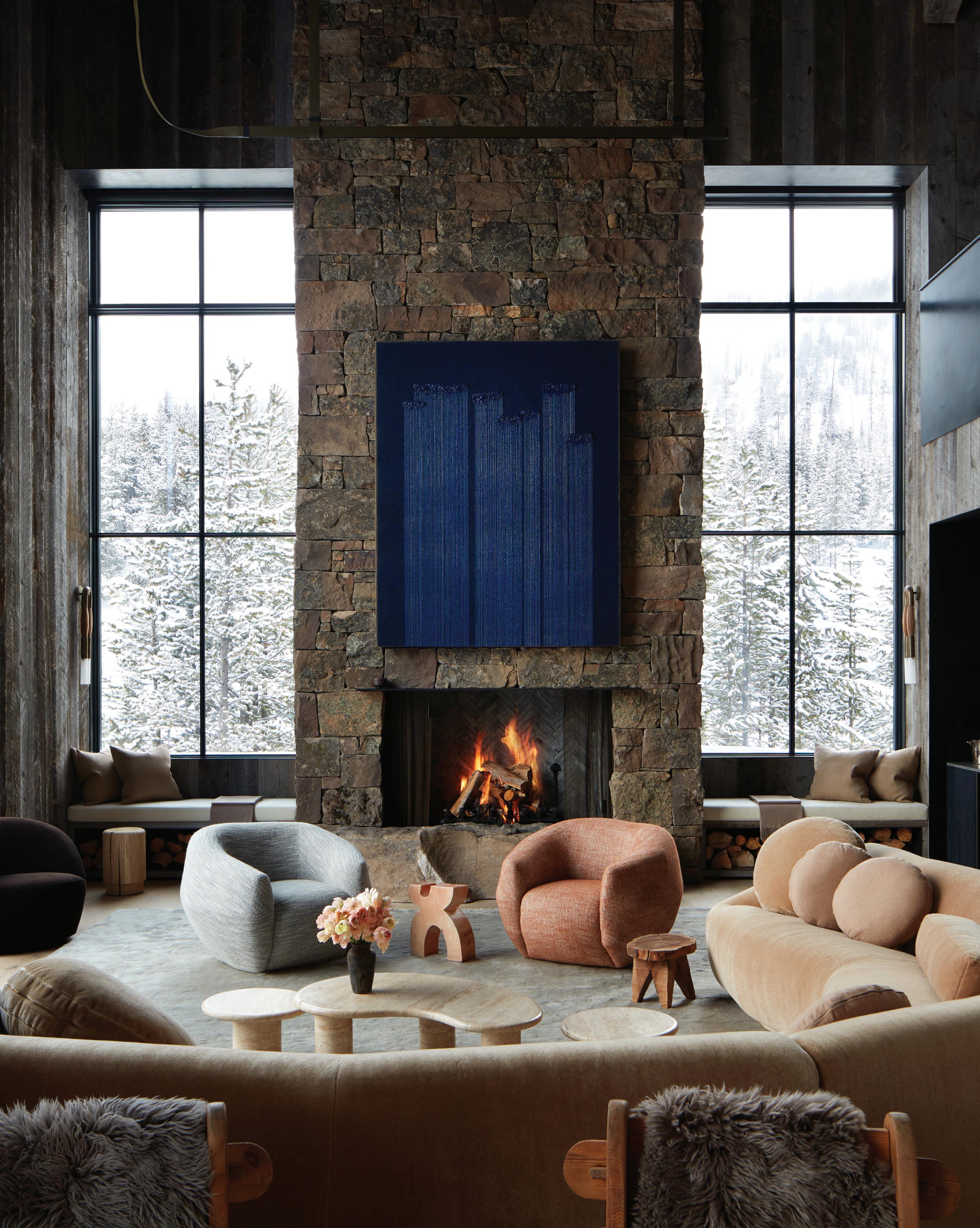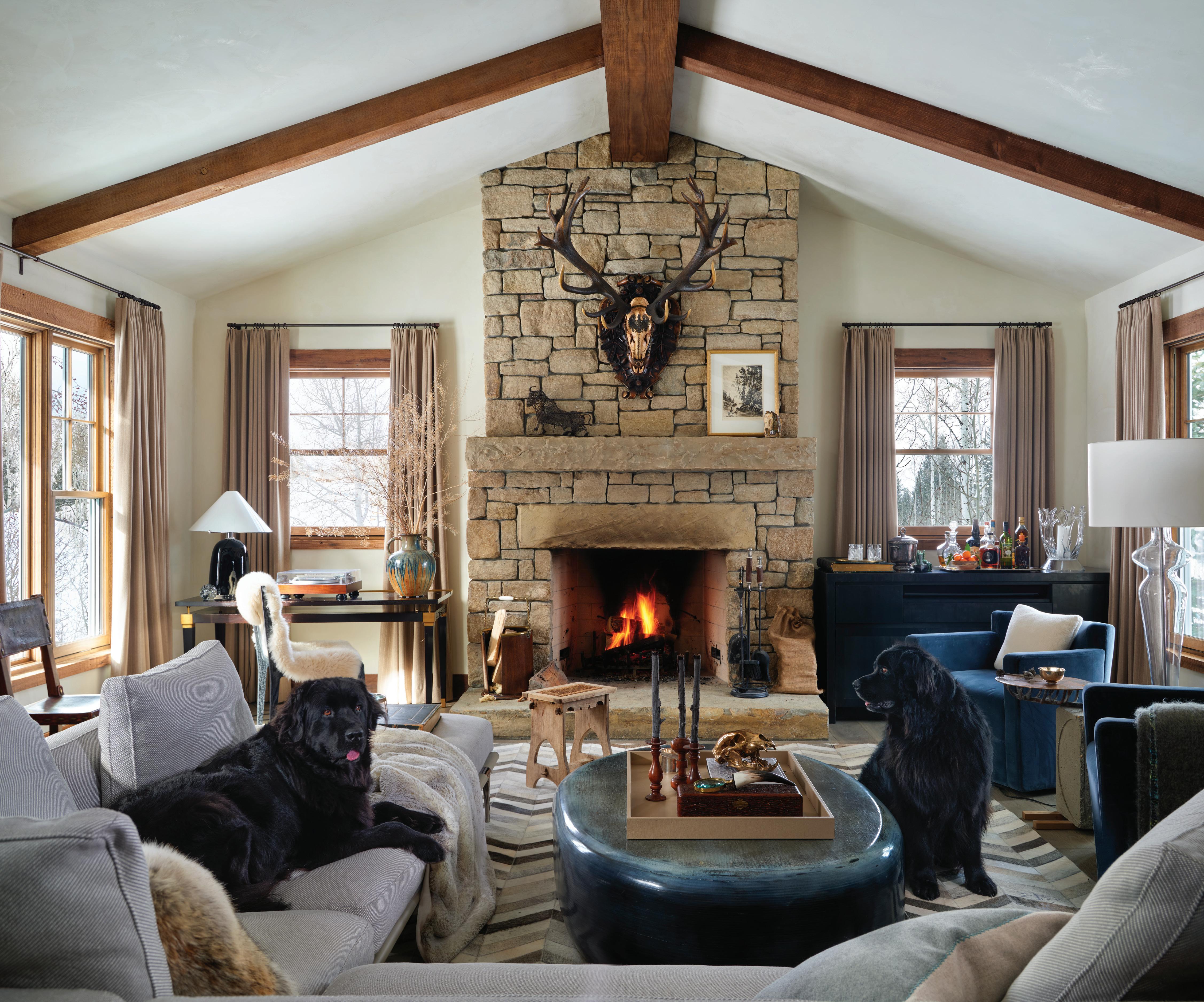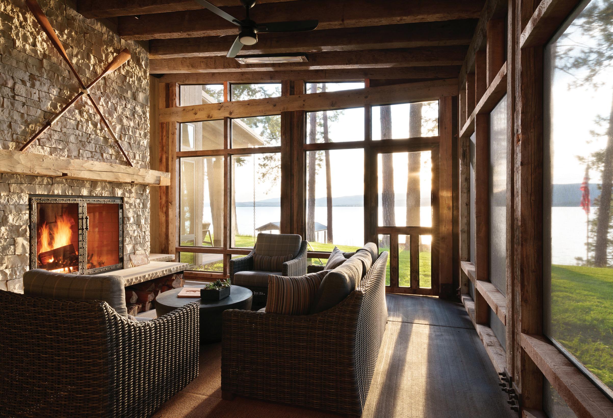 With a nod to its rustic roots, the home is still up-to-the-minute modern, with a Lutron automation system that seamlessly operates the window shades, audio-visual components, and lighting. Other efficiencies include extra insulation and triple-pane windows, which help create an airtight building envelope. “The big windows, coupled with cozy fireplaces, are heavenly,” Mumford says of the three interior and one exterior fireplaces and expansive windows in almost every room.