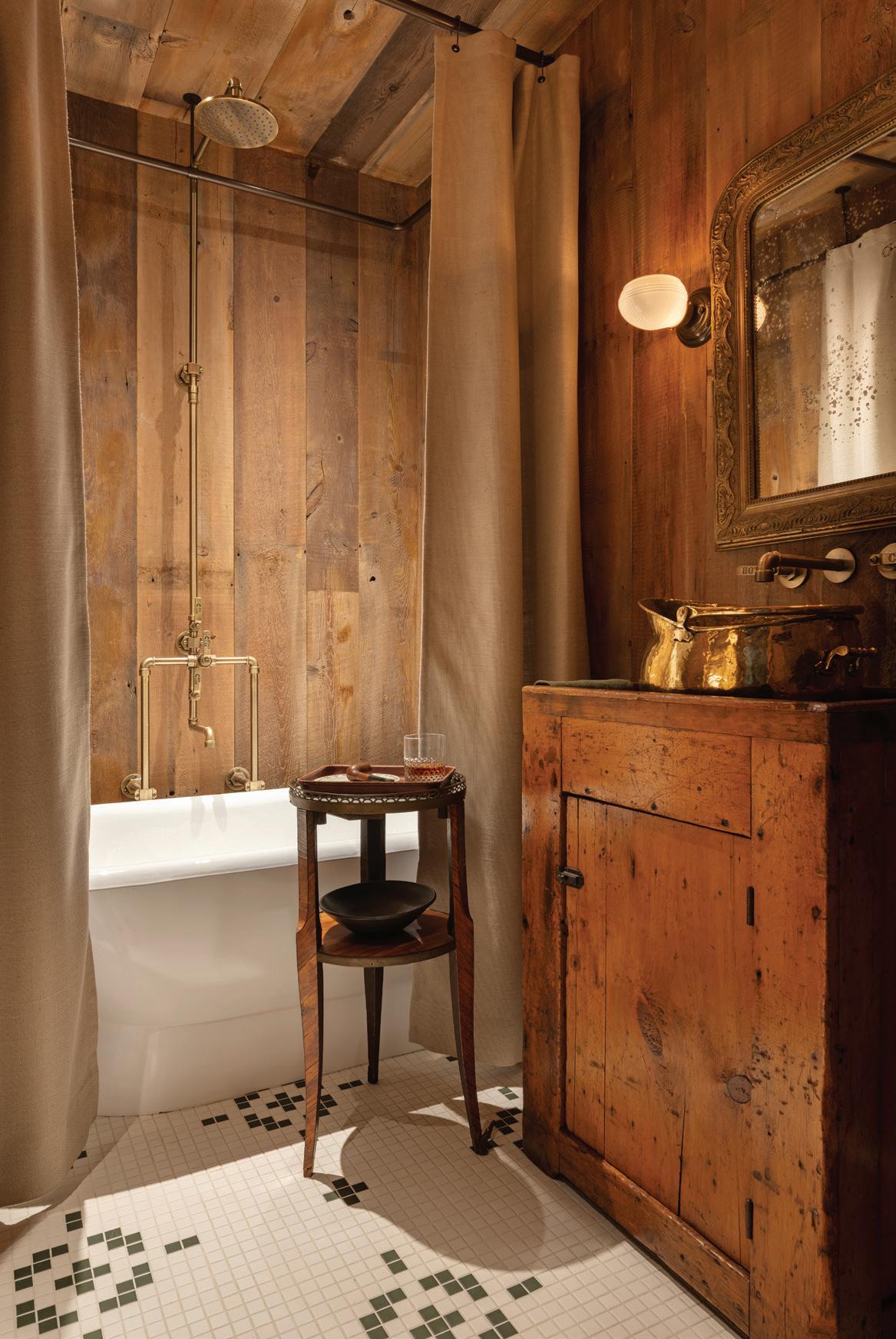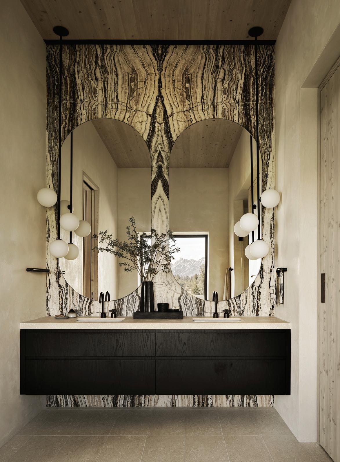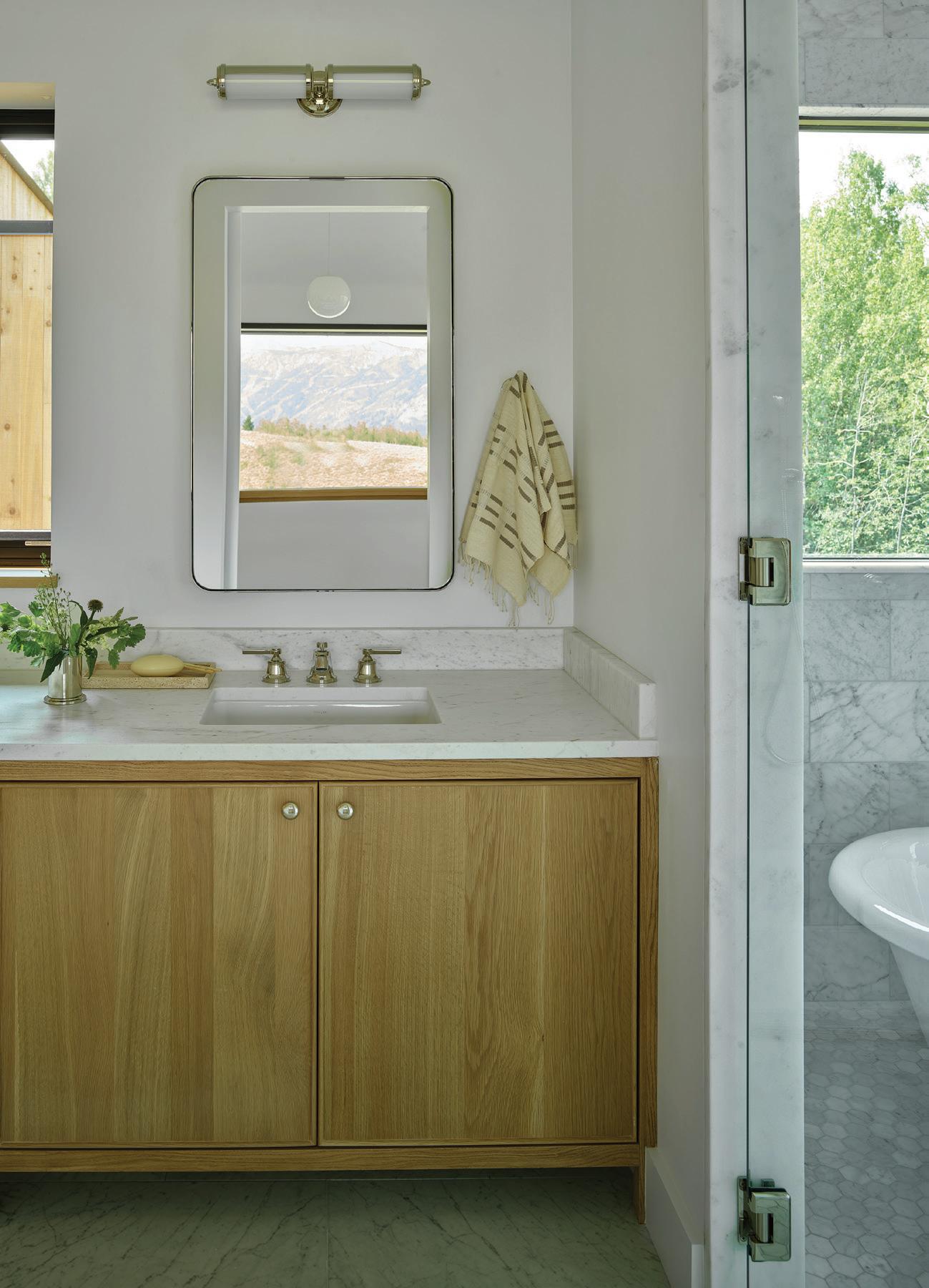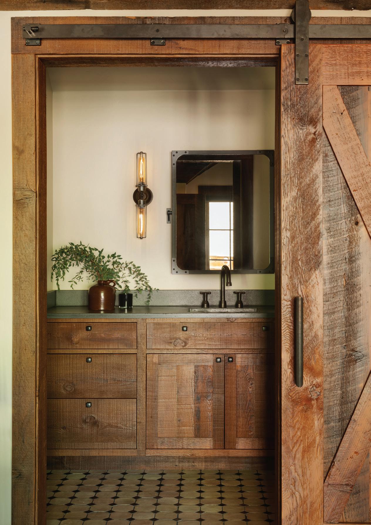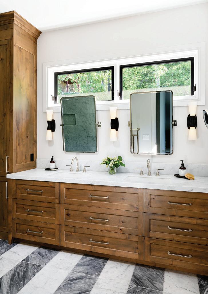 Each of TJHCo’s projects has bespoke details created by the company’s artist-in-residence, Fitzhugh Karol. In this home, Karol c a rved custom mantels for the indoor fireplaces in the great room and primary bedroom. He also carved distinctive wooden handles for interior barn doors. A medicine cabinet he customized in the primary bathroom is unique but still highly functional. “I like to add at le ast two or three touchpoints in every home we design. It provides a chance for us to enhance the basics with sculptural elements,” says Karol. “It’s nice to have a touch of handmade in a mostly manufactured environment, and ties into our overall ethos of bringing timeless materials into the homes we design.”