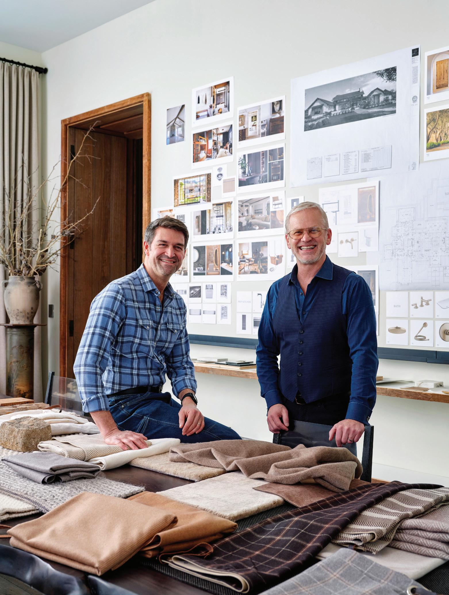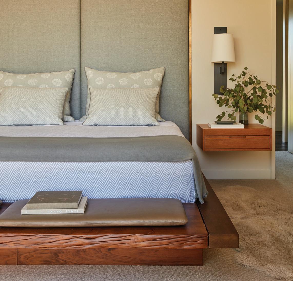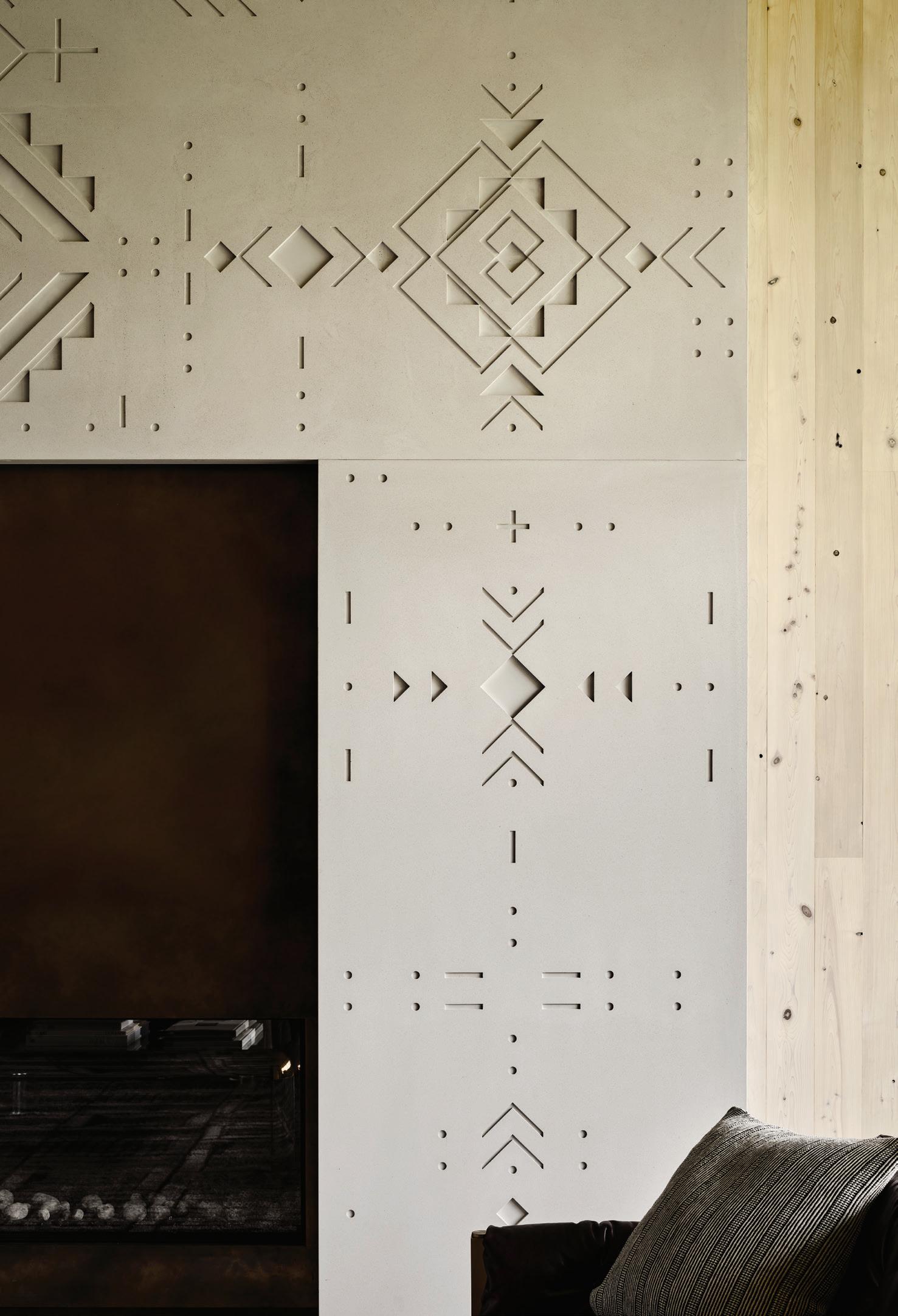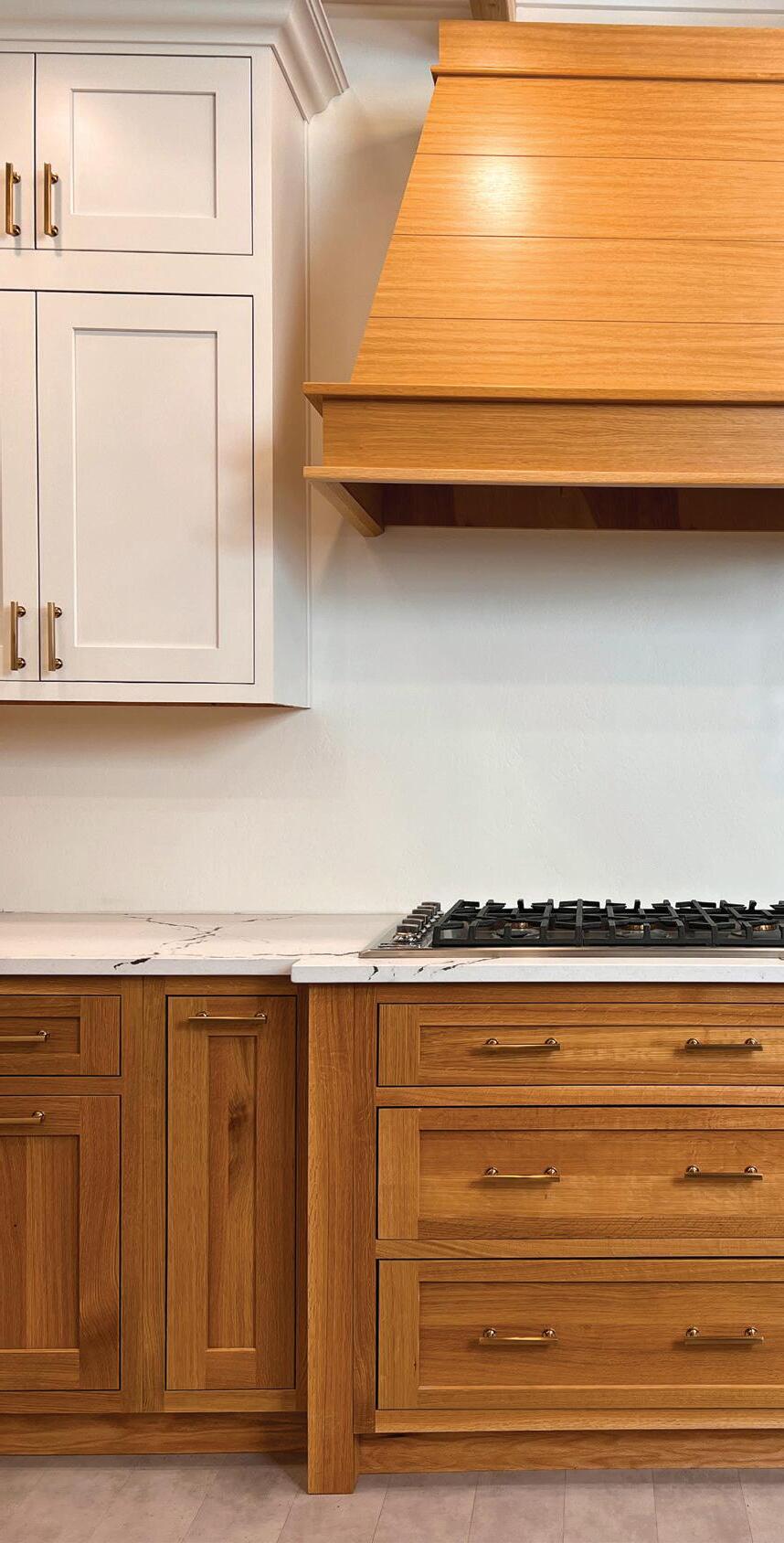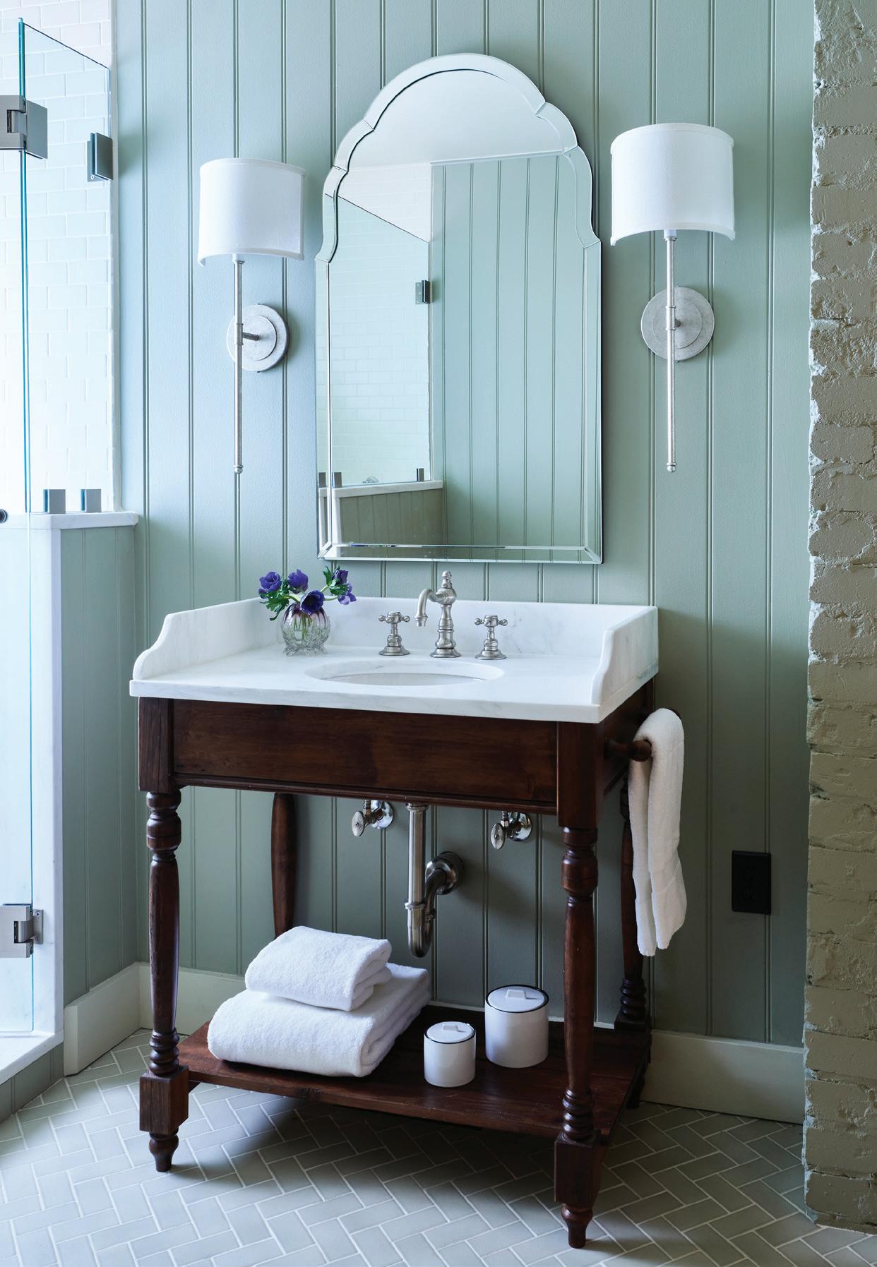 Each of TJHCo’s projects has bespoke details created by the company’s artist-in-residence, Fitzhugh Karol. In this home, Karol c a rved custom mantels for the indoor fireplaces in the great room and primary bedroom. He also carved distinctive wooden handles for interior barn doors. A medicine cabinet he customized in the primary bathroom is unique but still highly functional. “I like to add at le ast two or three touchpoints in every home we design. It provides a chance for us to enhance the basics with sculptural elements,” says Karol. “It’s nice to have a touch of handmade in a mostly manufactured environment, and ties into our overall ethos of bringing timeless materials into the homes we design.”