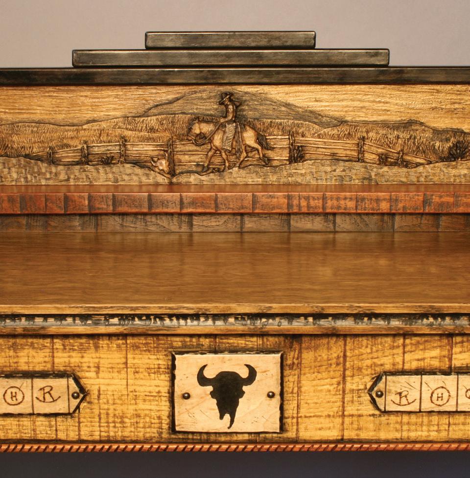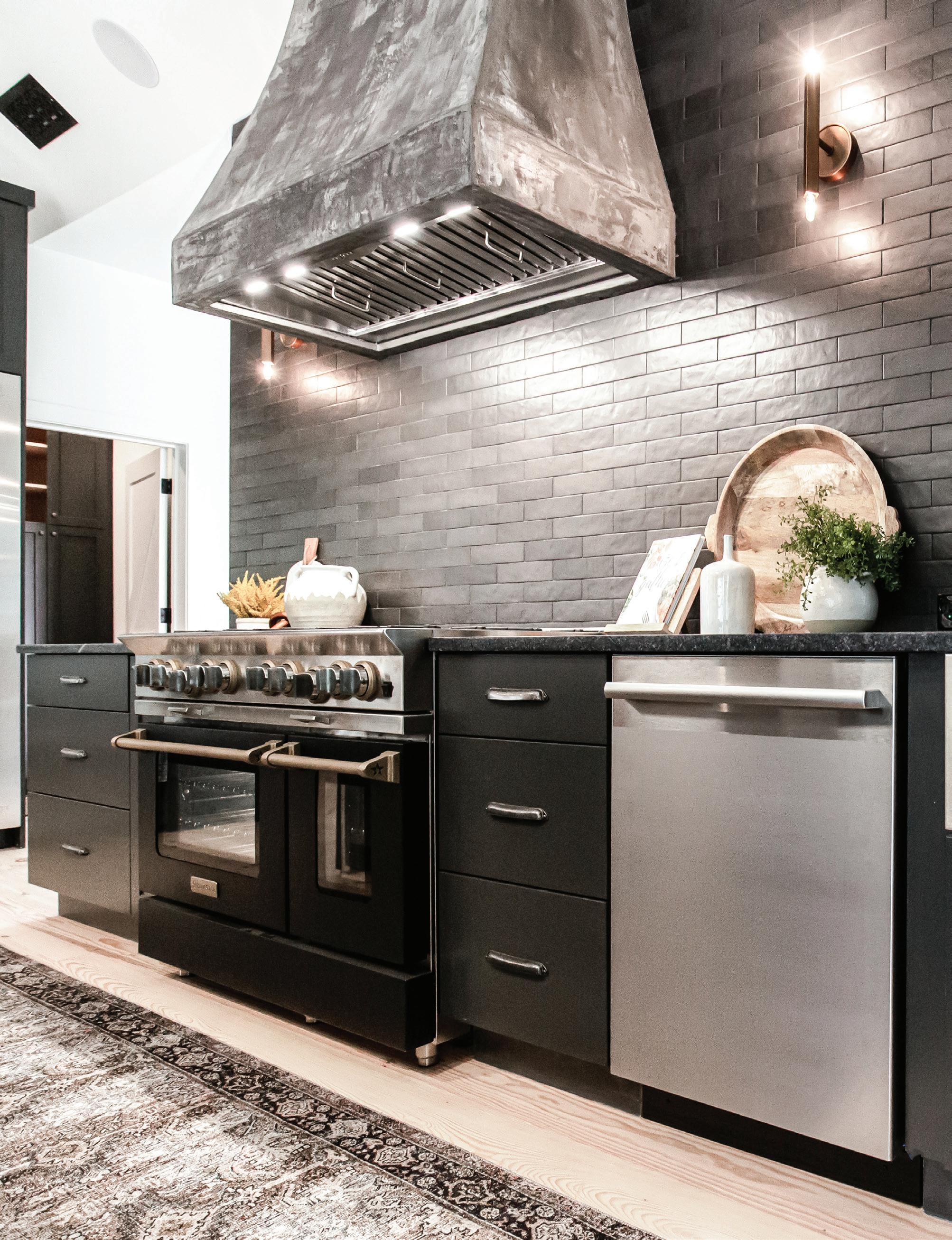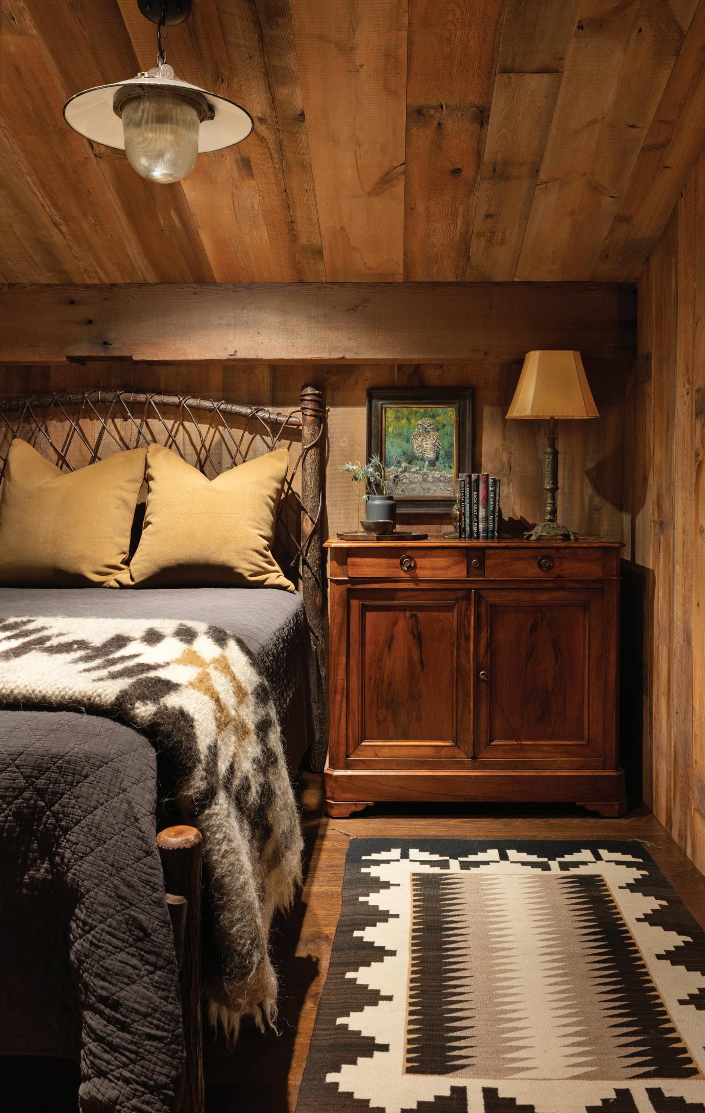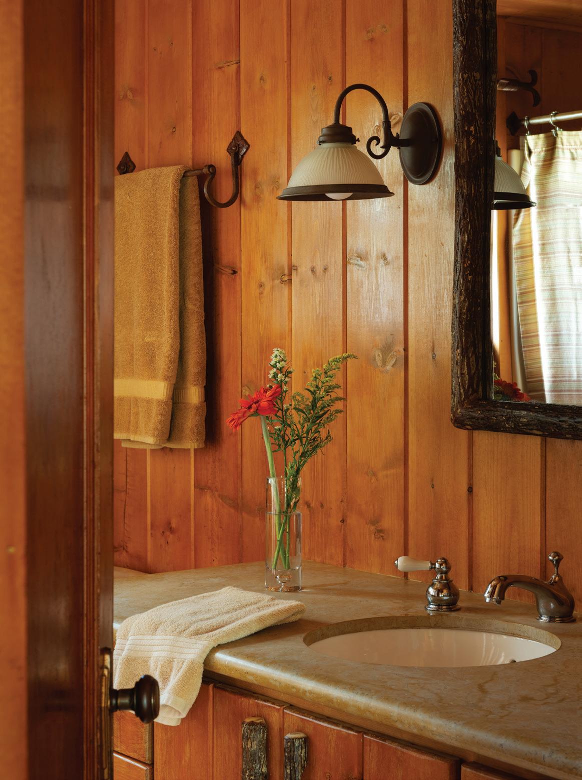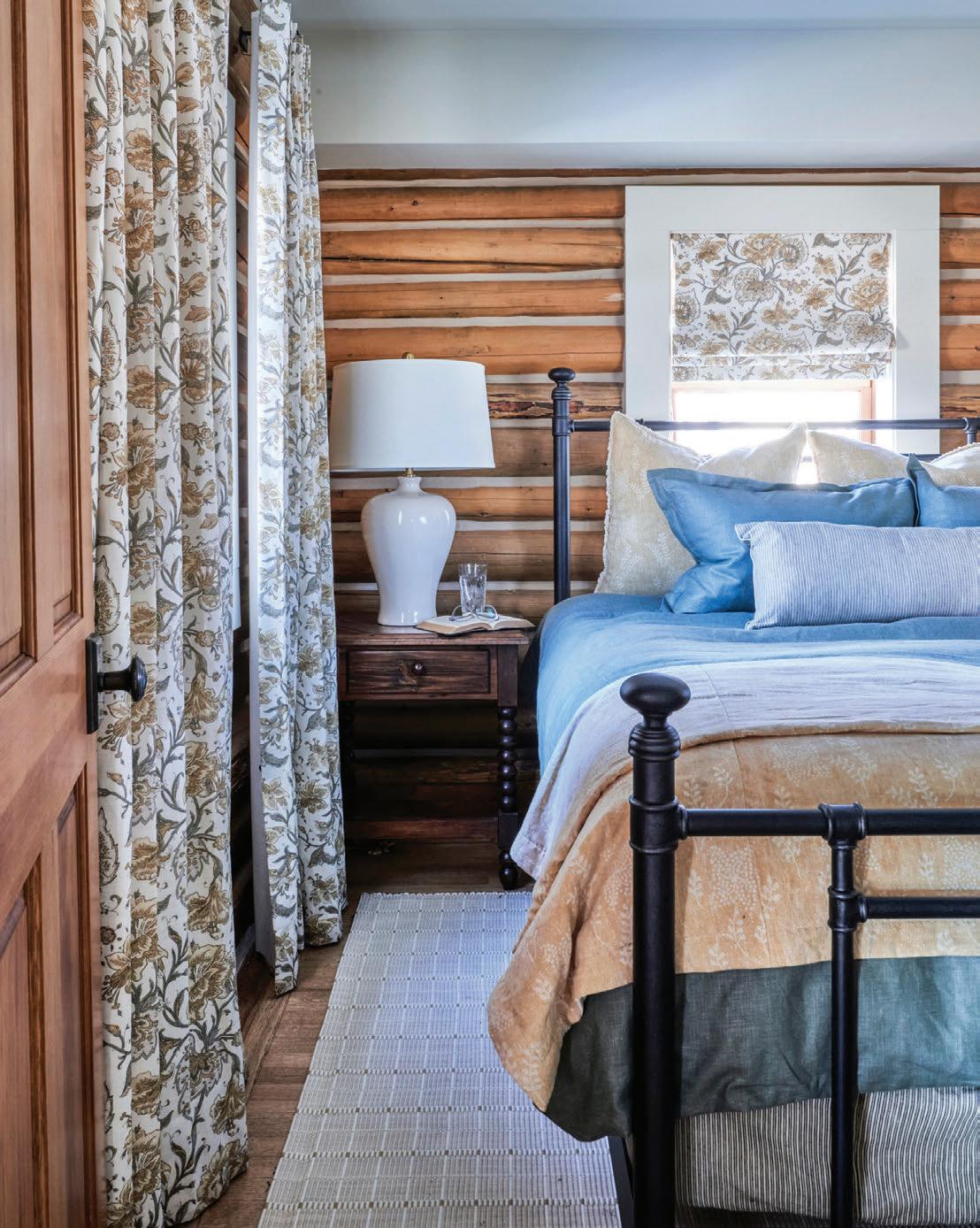 Each of TJHCo’s projects has bespoke details created by the company’s artist-in-residence, Fitzhugh Karol. In this home, Karol c a rved custom mantels for the indoor fireplaces in the great room and primary bedroom. He also carved distinctive wooden handles for interior barn doors. A medicine cabinet he customized in the primary bathroom is unique but still highly functional. “I like to add at le ast two or three touchpoints in every home we design. It provides a chance for us to enhance the basics with sculptural elements,” says Karol. “It’s nice to have a touch of handmade in a mostly manufactured environment, and ties into our overall ethos of bringing timeless materials into the homes we design.”
