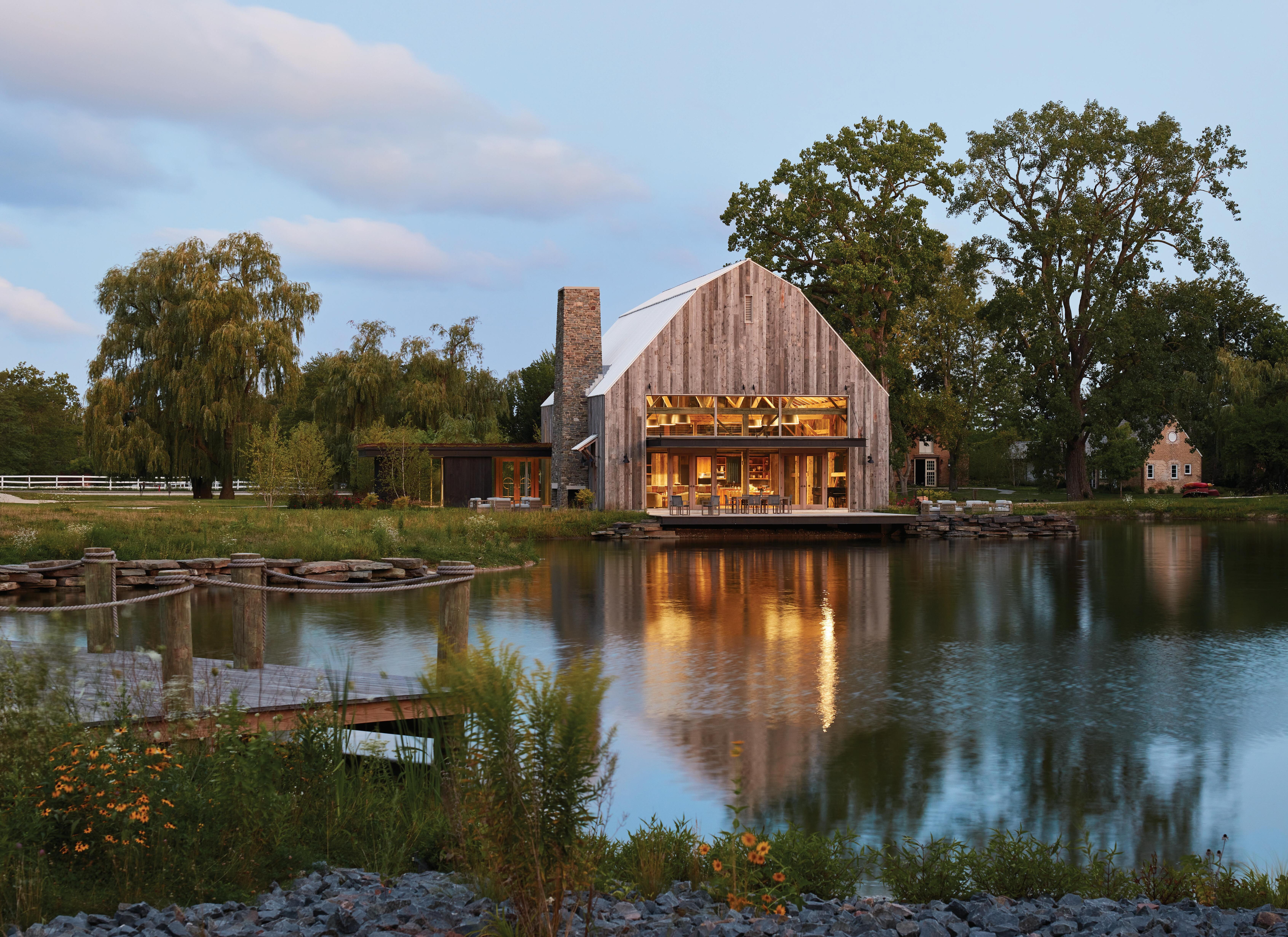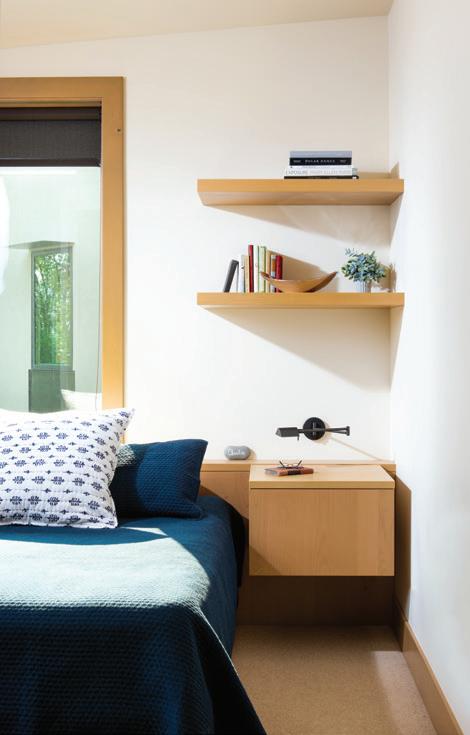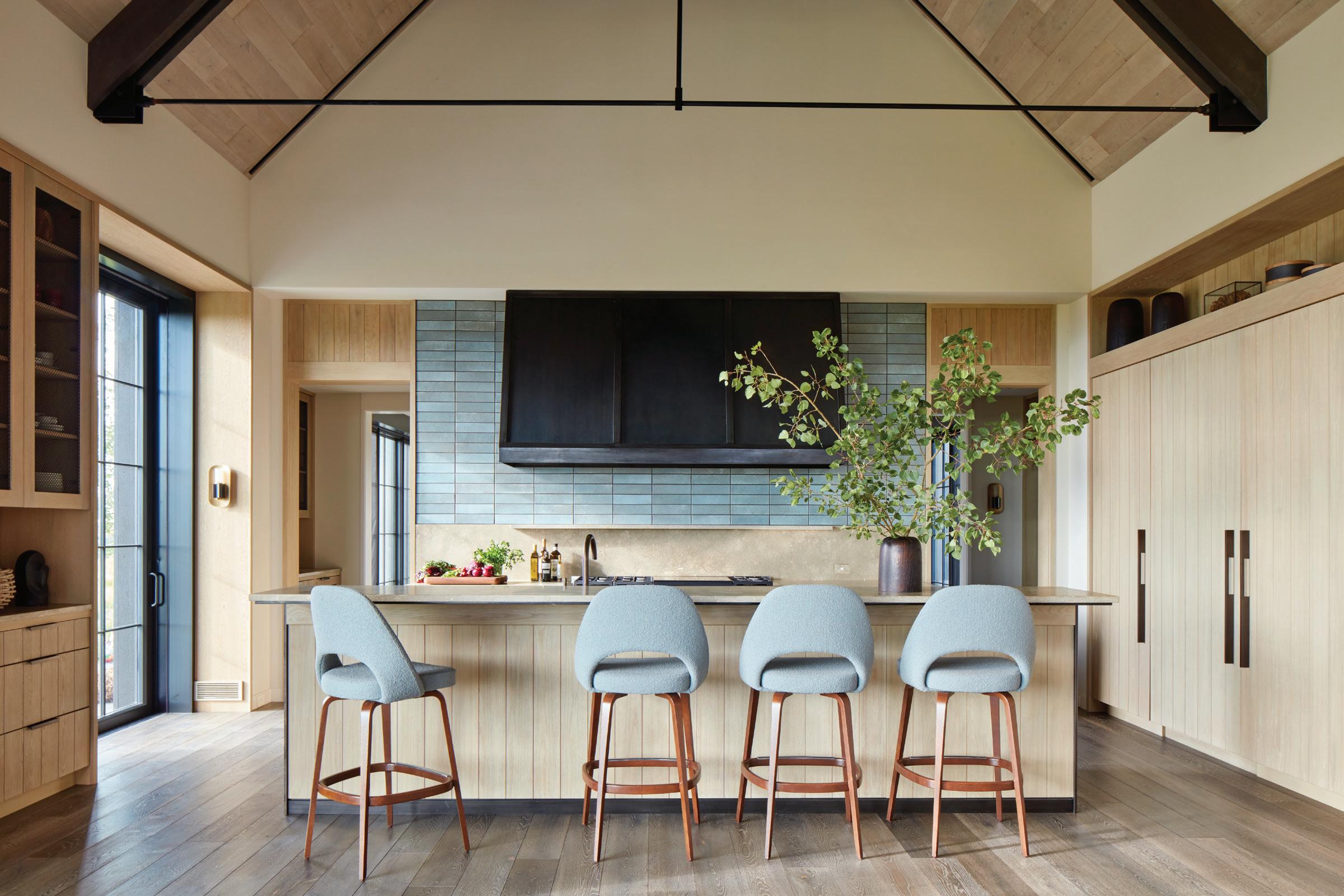 The home’s two gable-roof structures are connected by a doubleglass breezeway that serves as the entrance, with views through the house to the landscape beyond. One structure contains dual levels of bedrooms and other private areas, and the other consists of the main living and entertaining spaces.