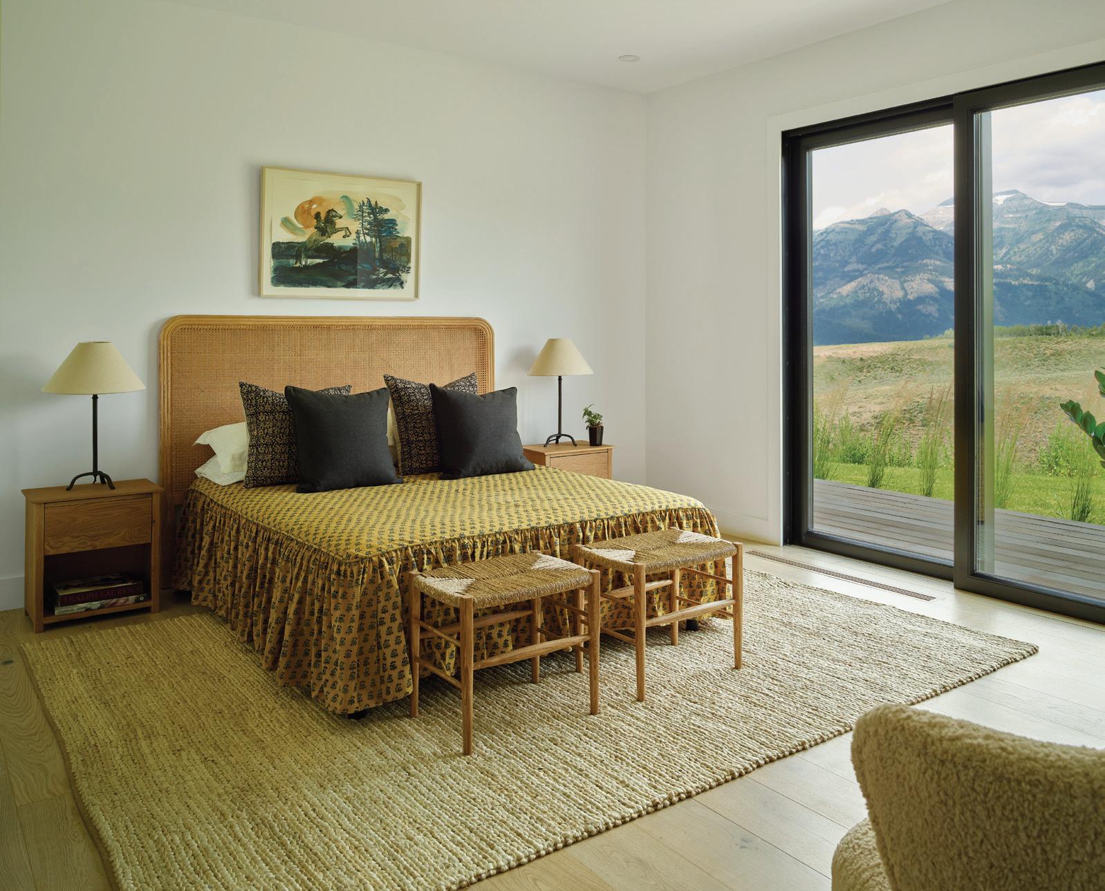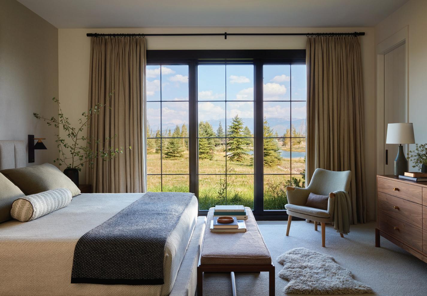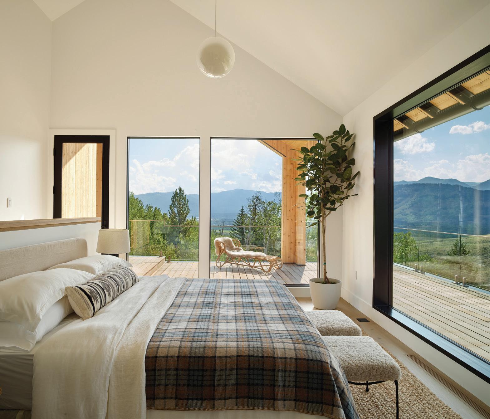 CLOCKWISE FROM LEFT: Every morning’s view is different when waking up in the primary bedroom, where Mother Nature paints the first scene of the day. • Dual levels of outdoor living space face Teton and conservation-land views, while an extended roofline provides coverage for outdoor dining. • The reading nook in the bedroom offers a spot for quiet relaxation with its own special views.