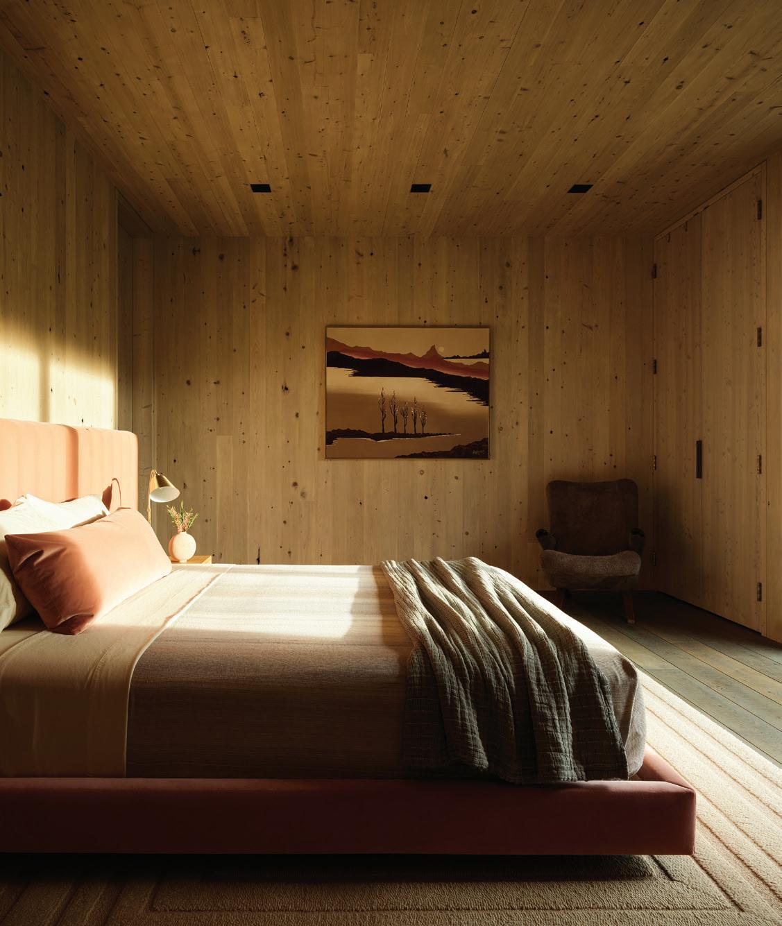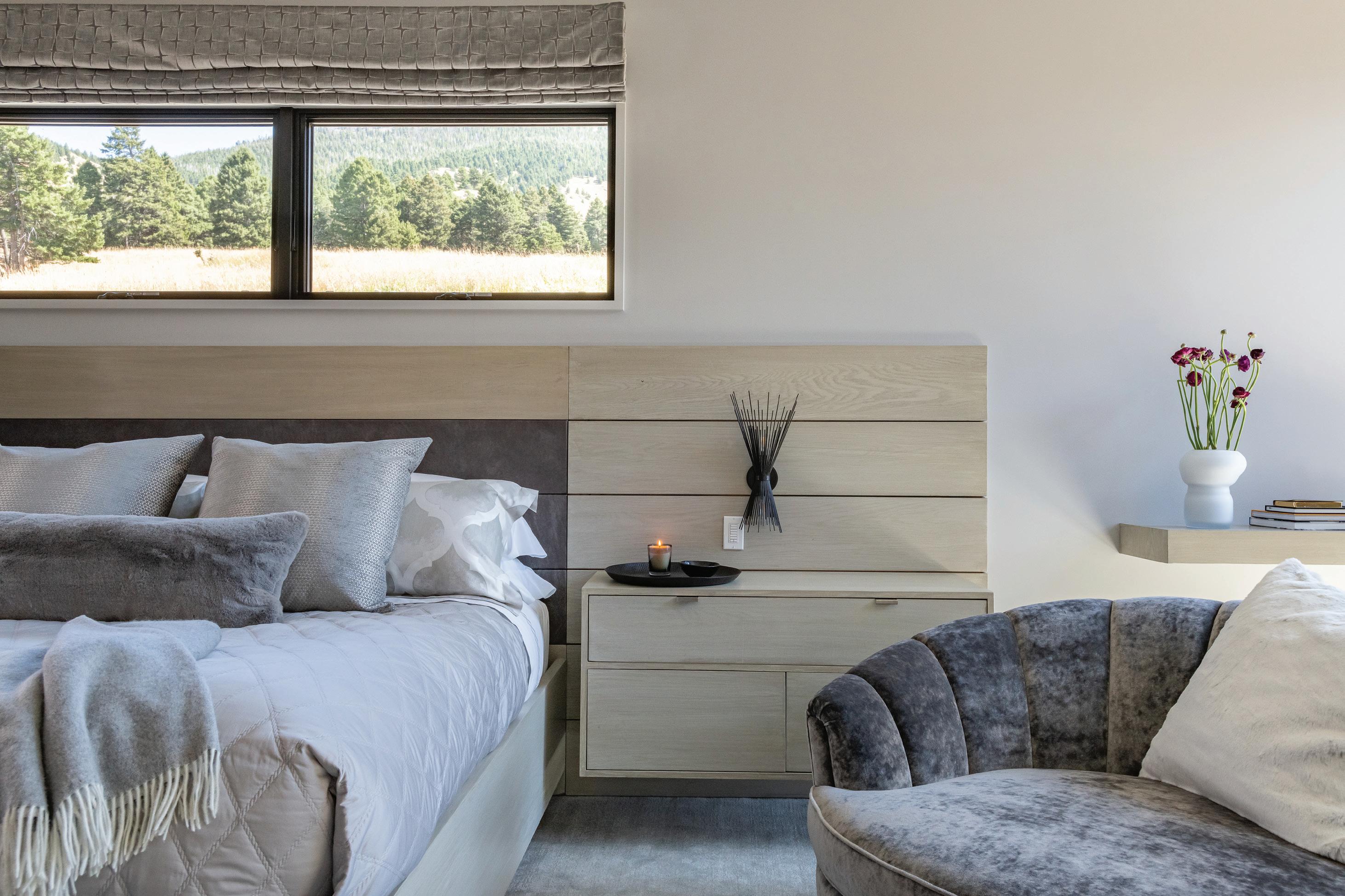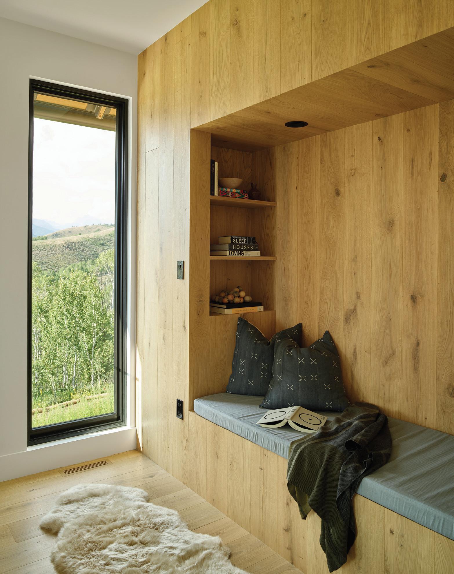 CLOCKWISE FROM LEFT: Every morning’s view is different when waking up in the primary bedroom, where Mother Nature paints the first scene of the day. • Dual levels of outdoor living space face Teton and conservation-land views, while an extended roofline provides coverage for outdoor dining. • The reading nook in the bedroom offers a spot for quiet relaxation with its own special views.