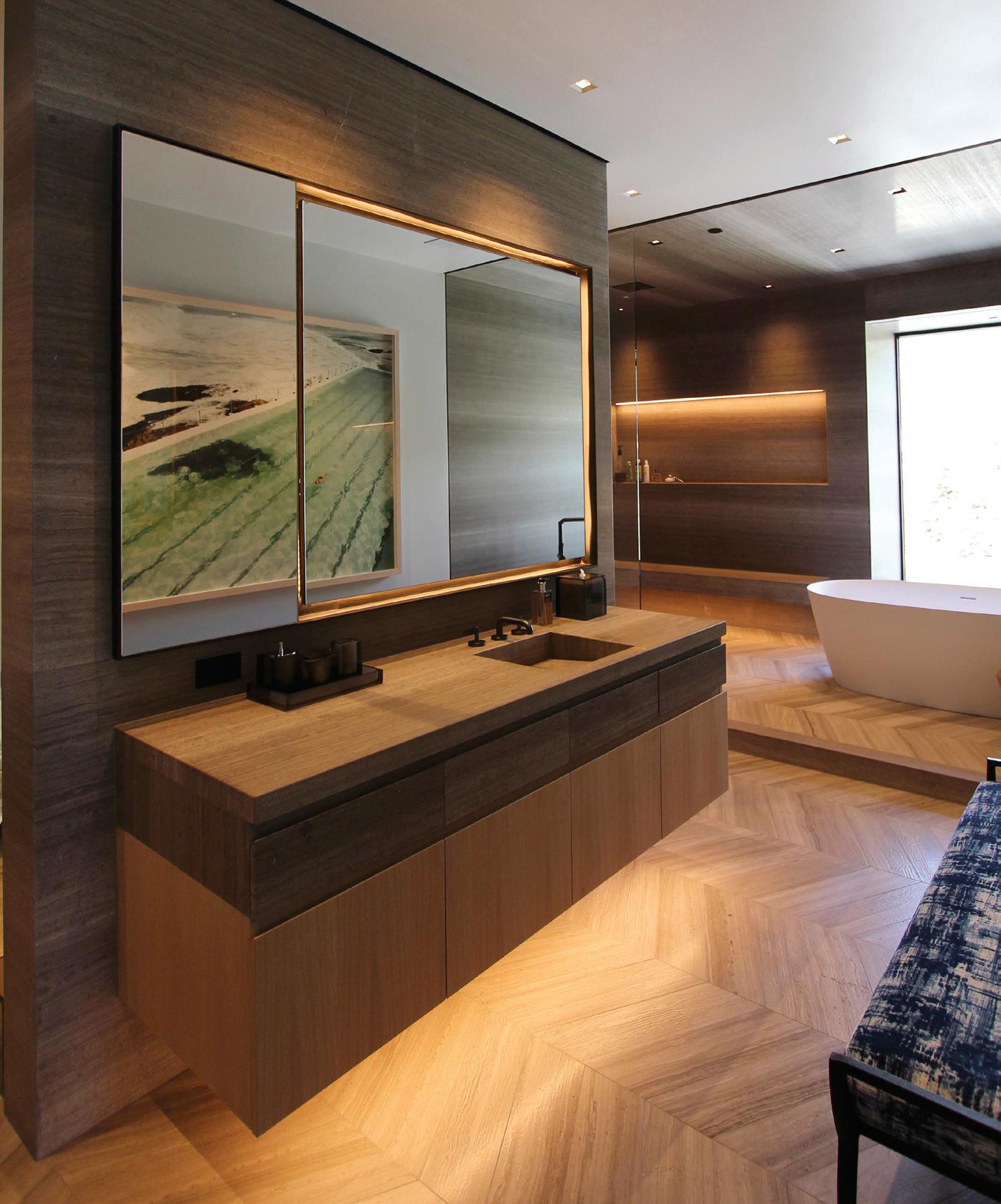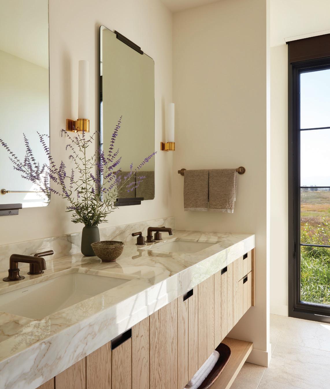 CLOCKWISE FROM TOP LEFT: The design team ensured even guest quarters have amazing views. • The primary bathroom has double vanities in custom white-oak cabinetry, double showers, and a freestanding tub. • The main entrance is in a double-level glass breezeway that connects the home’s two wings.