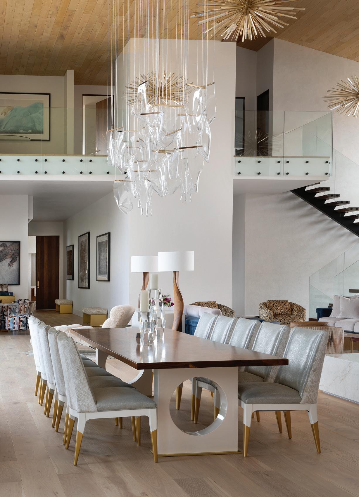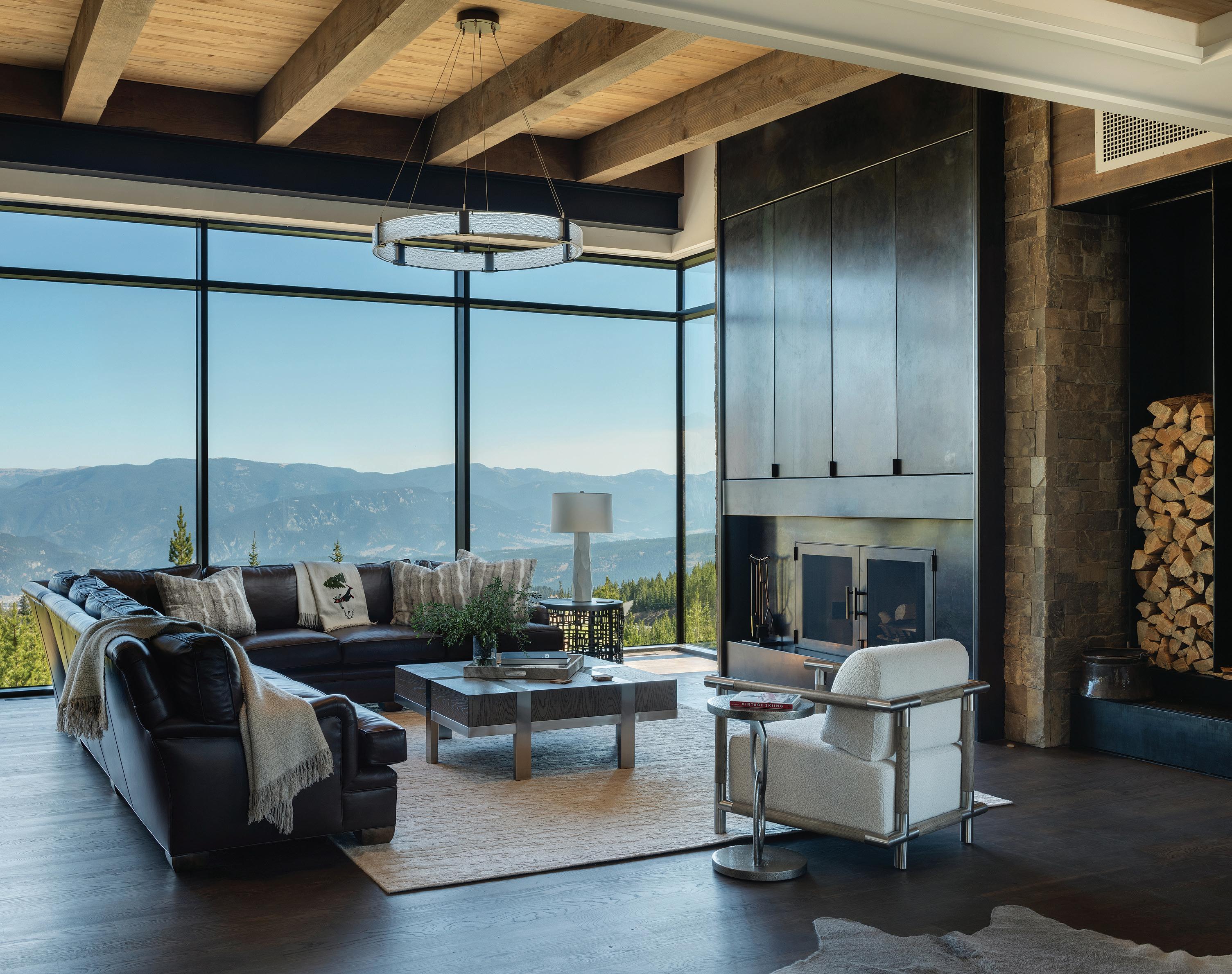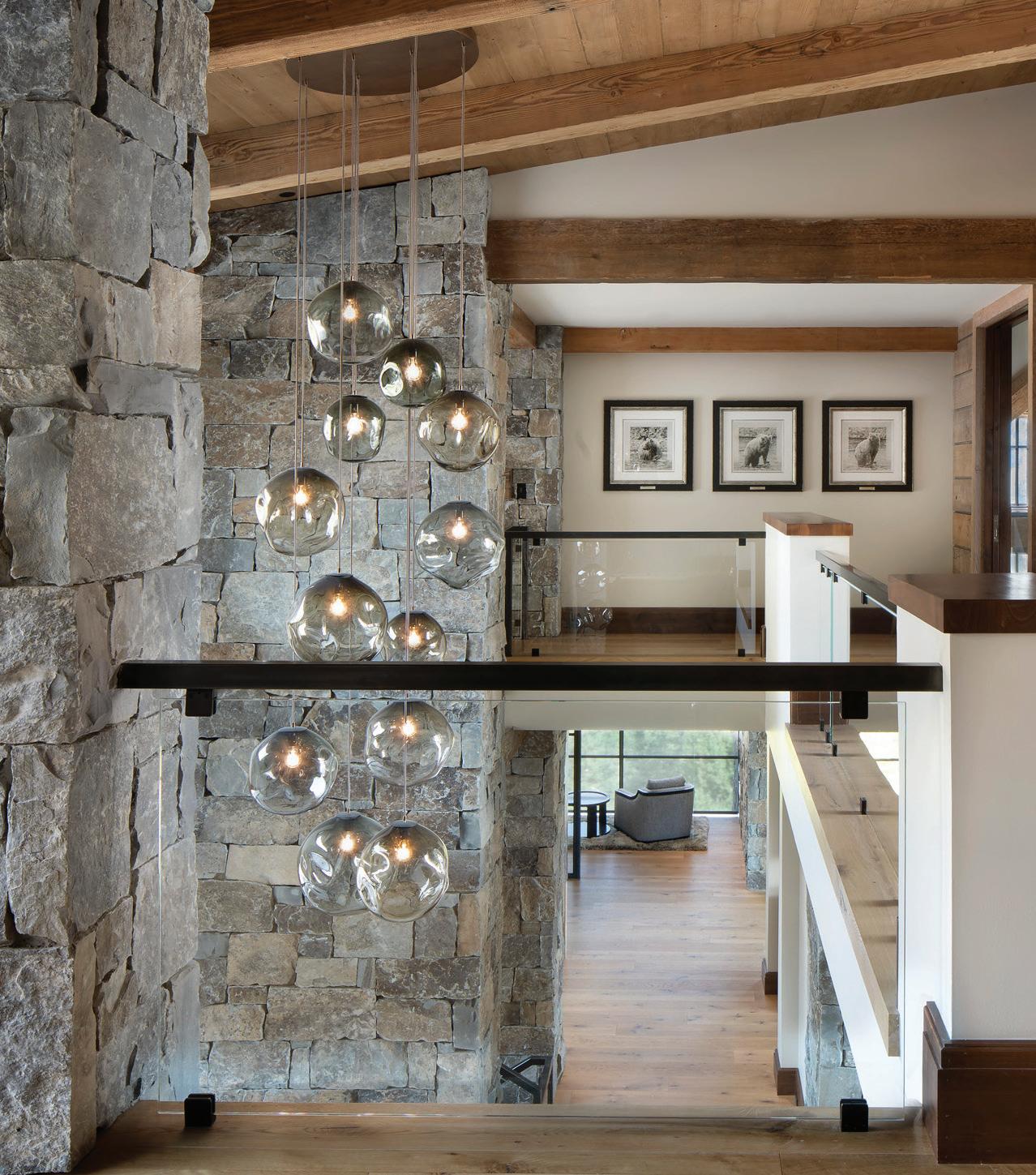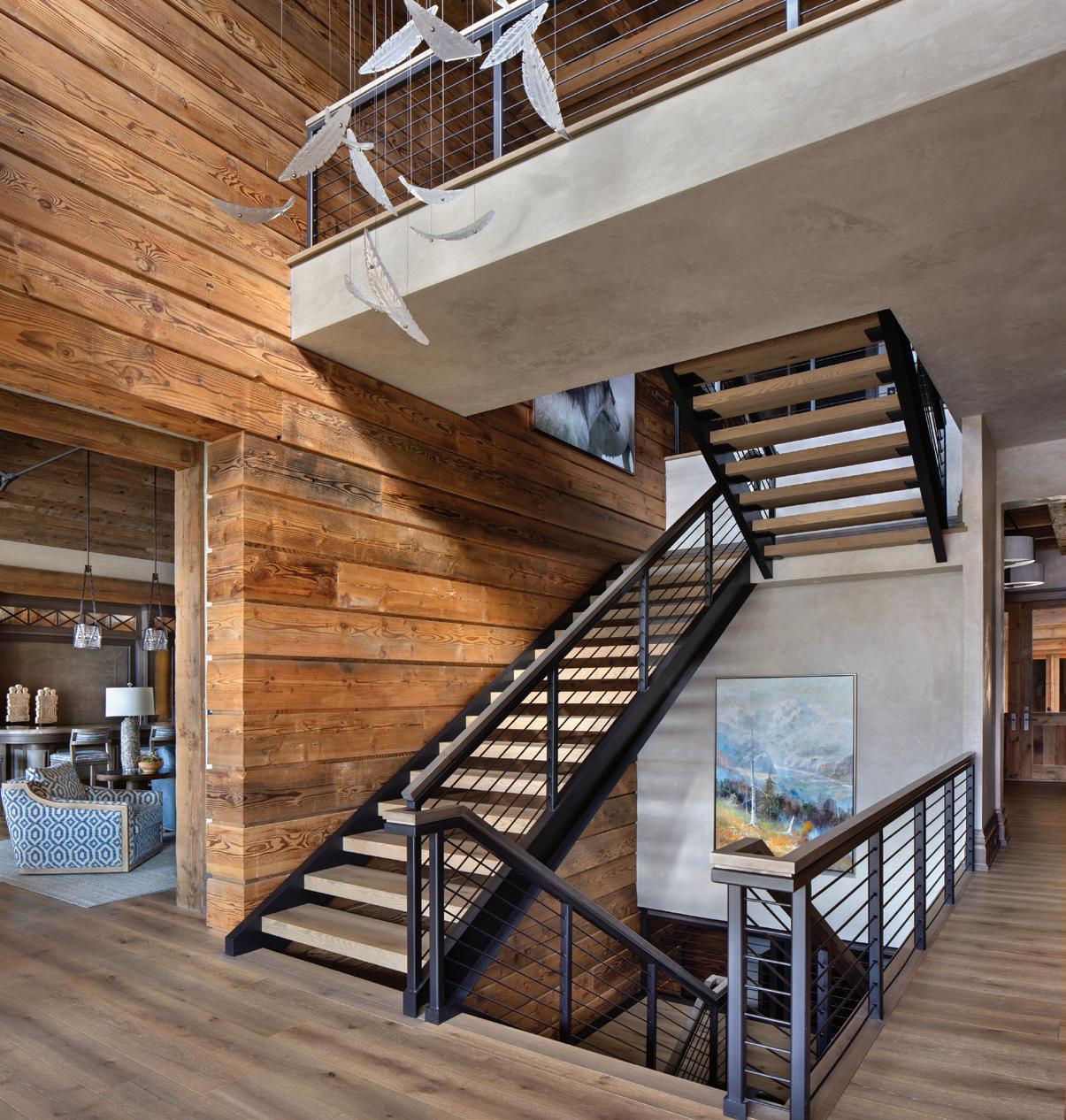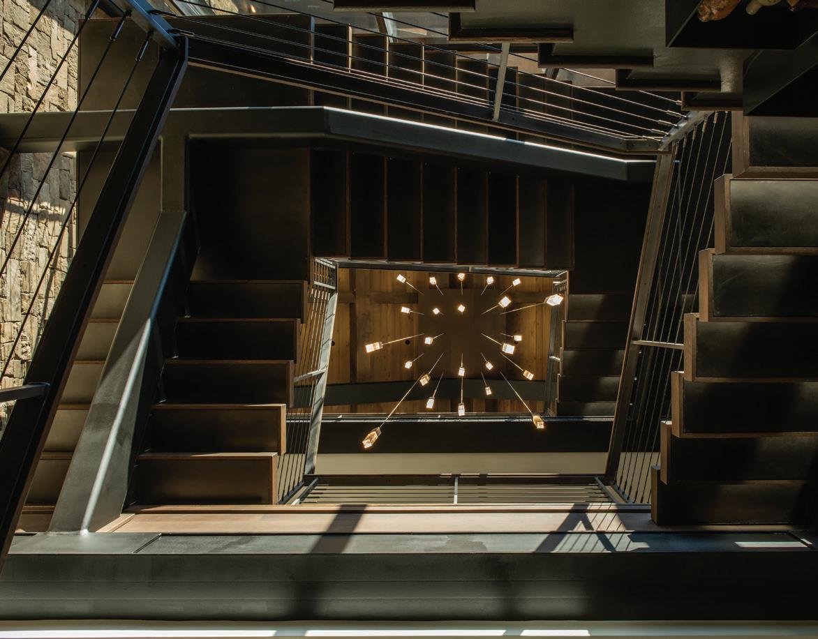 FROM TOP + OPPOSITE: The eight-bedroom home provides ample space for large gatherings while maintaining private retreats for individual family members. The house is located on the highest point amid 300 acres, ensuring exceptional views of the surrounding mountain landscape. • DeLeo & Fletcher sourced the chandelier adjacent to the stairway, which was designed to resemble floating feathers, from Fine Art Handcrafted Lighting. • The material palette represents a more traditional mountain home, explains architect Steve Locati. Some 35 tons of structural steel are concealed within wooden beams to achieve this aesthetic.