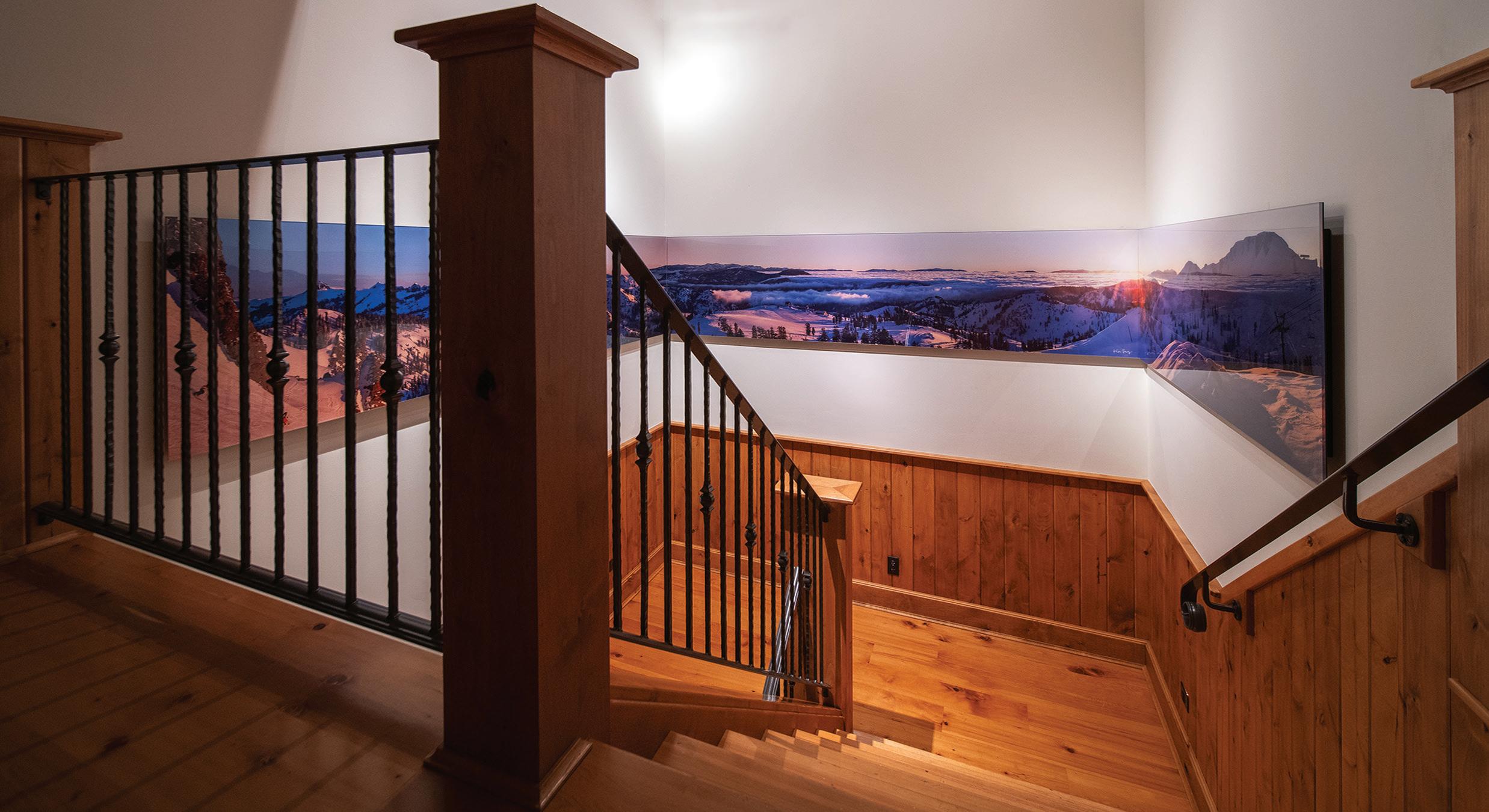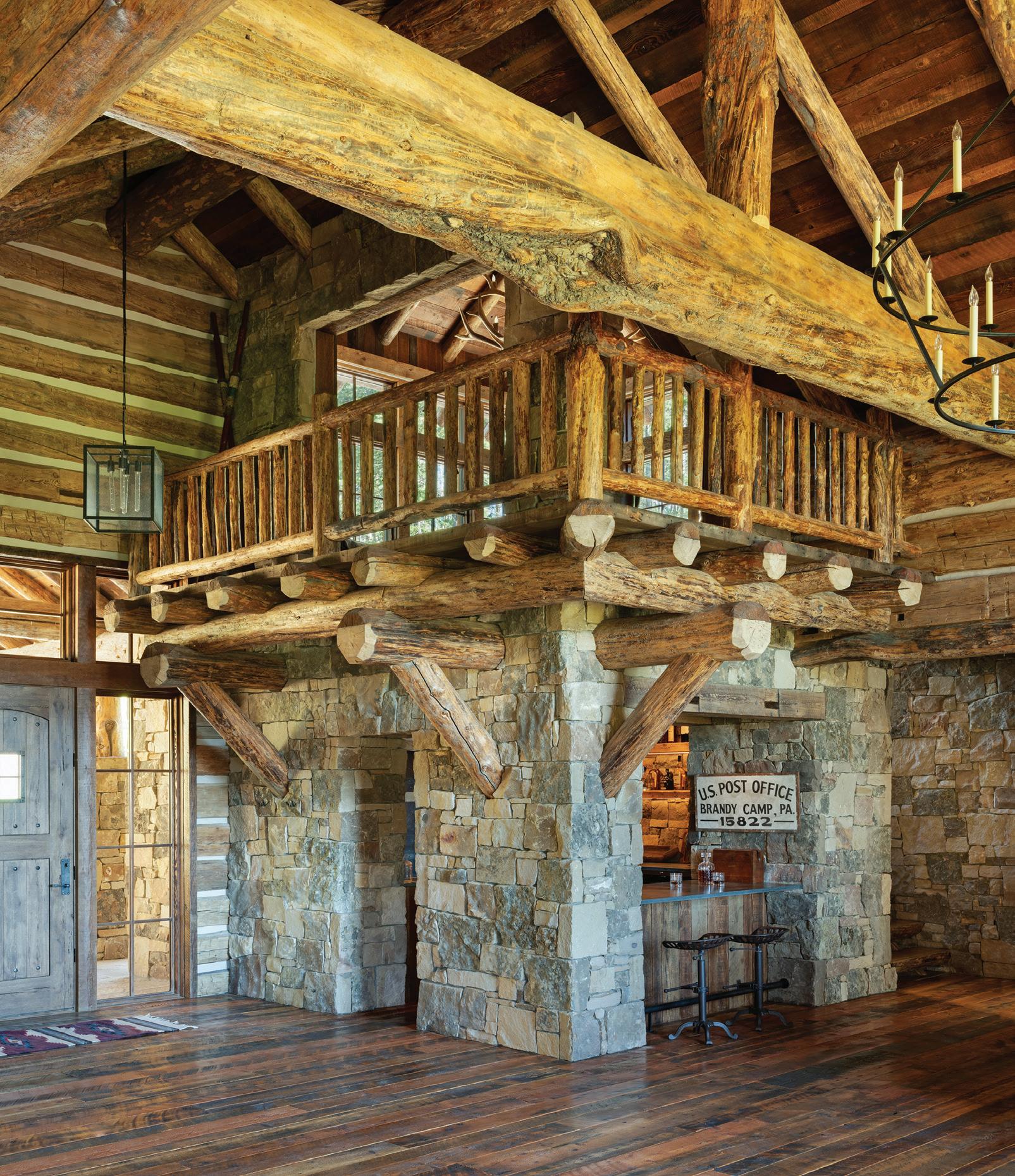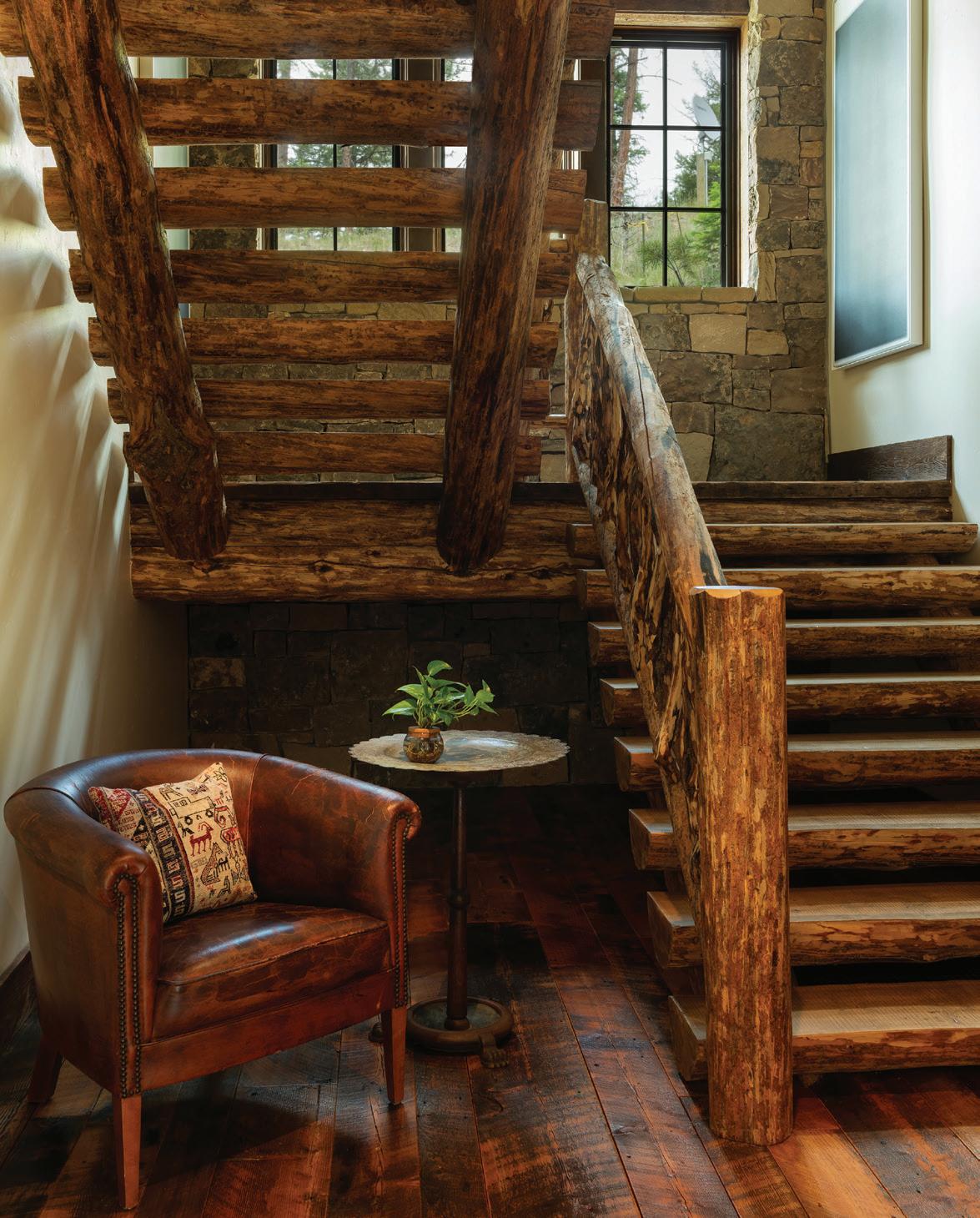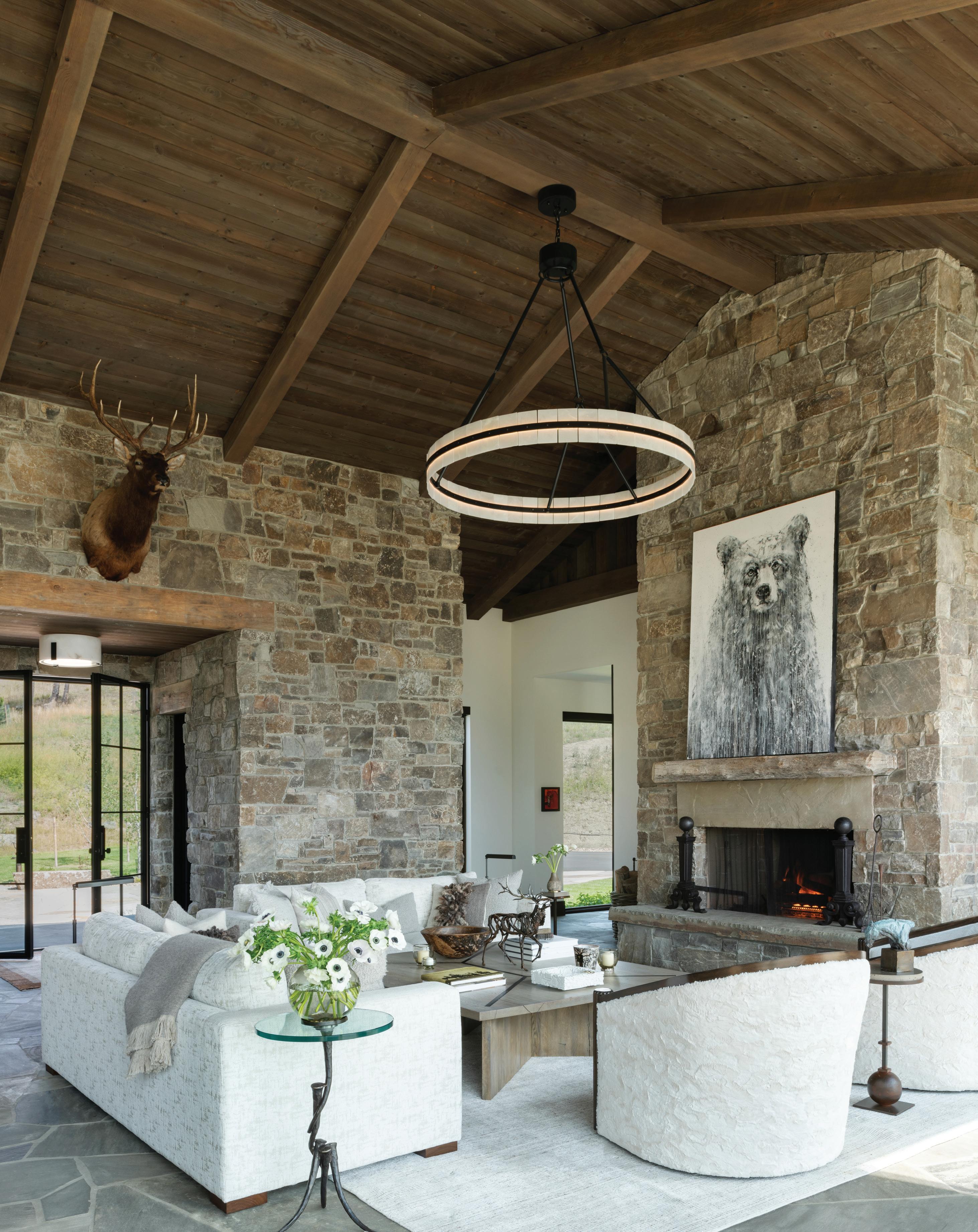 FROM TOP + OPPOSITE: The eight-bedroom home provides ample space for large gatherings while maintaining private retreats for individual family members. The house is located on the highest point amid 300 acres, ensuring exceptional views of the surrounding mountain landscape. • DeLeo & Fletcher sourced the chandelier adjacent to the stairway, which was designed to resemble floating feathers, from Fine Art Handcrafted Lighting. • The material palette represents a more traditional mountain home, explains architect Steve Locati. Some 35 tons of structural steel are concealed within wooden beams to achieve this aesthetic.