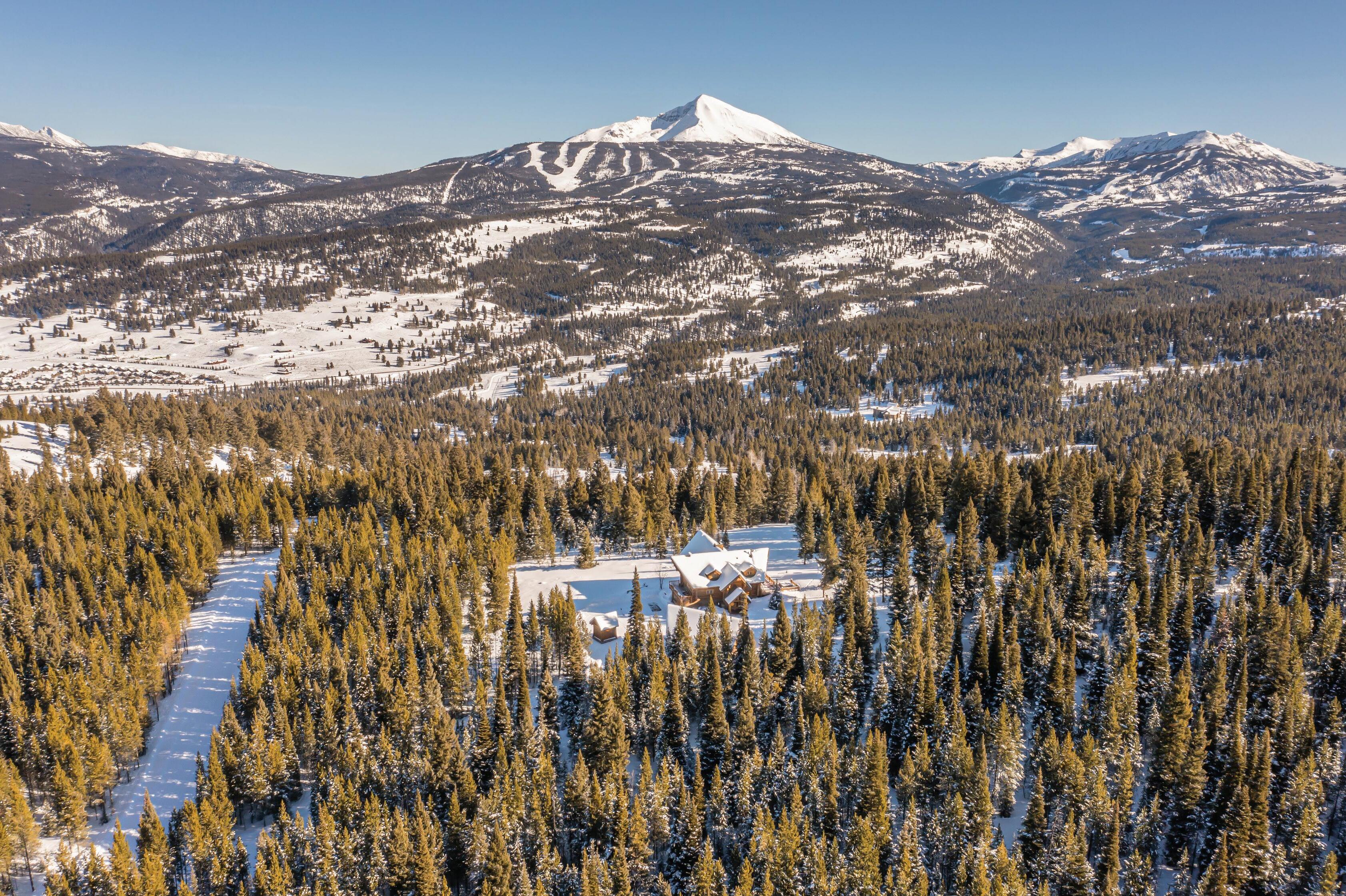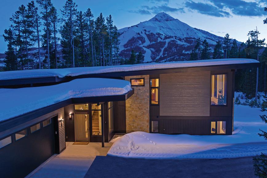 Contemporary mountain retreat featuring floor to ceiling windows framing Lone Peak with ski access to Big Sky Resort.
