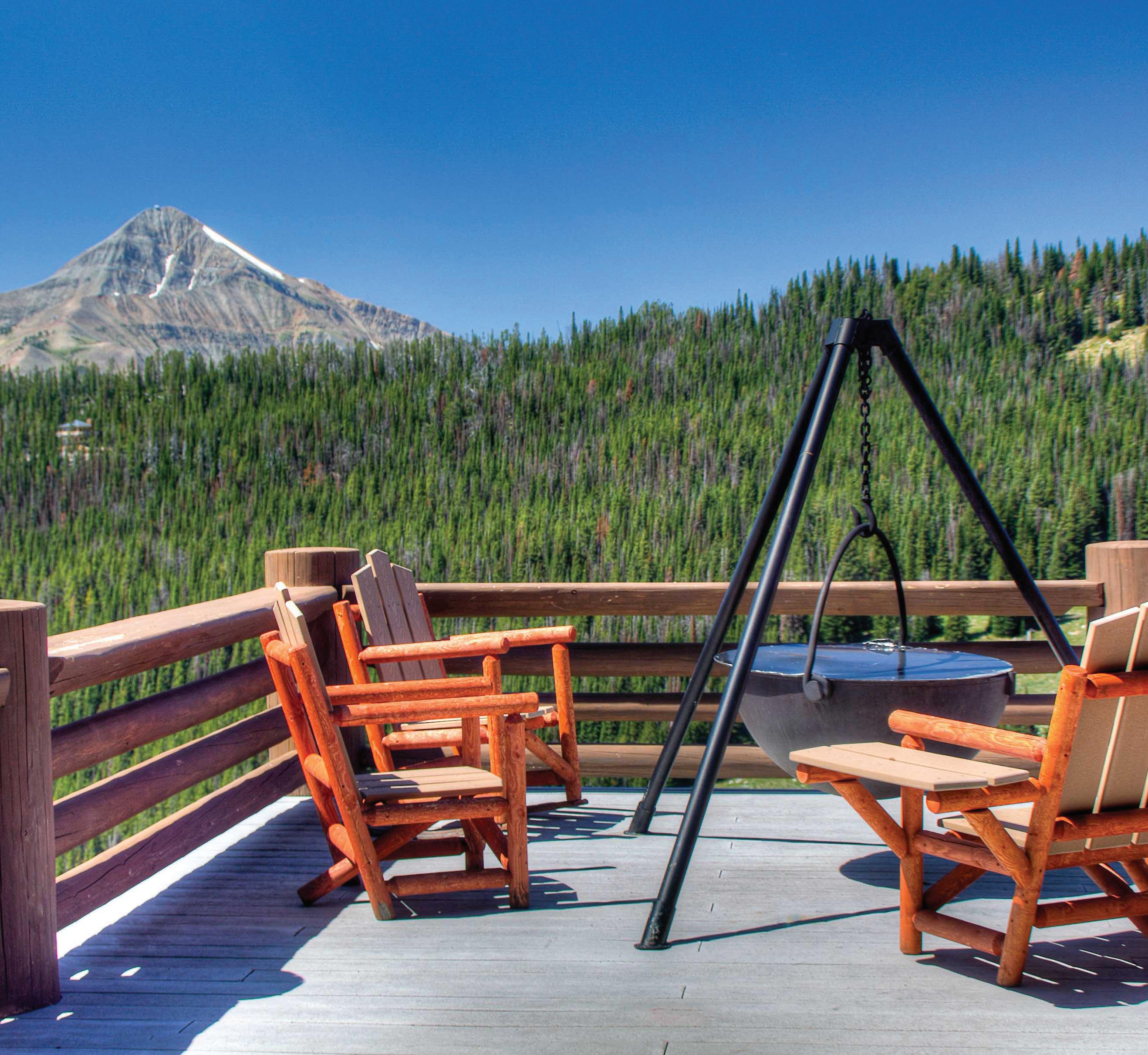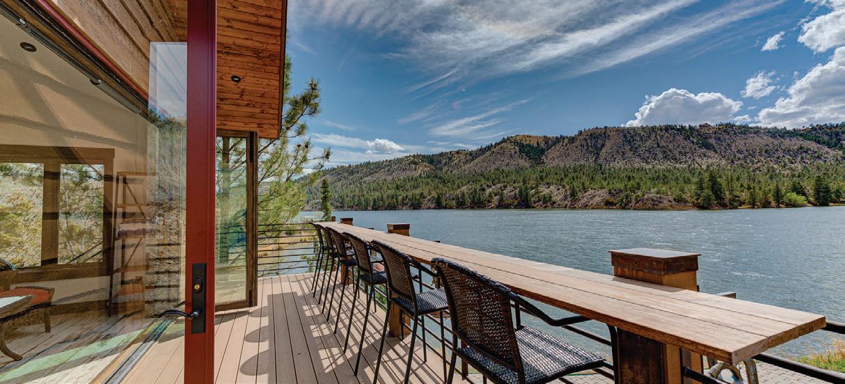 WITH A HOME SITUATED IN such a robust alpine setting, it’s imperative that the outdoor living rivals the interiors, and this home doesn’t disappoint. Two levels of wraparound decks with glass railings provide uninterrupted views and multiple entertainment areas. A home office near the primary suite features another private deck for an alfresco meeting or quiet reprieve.