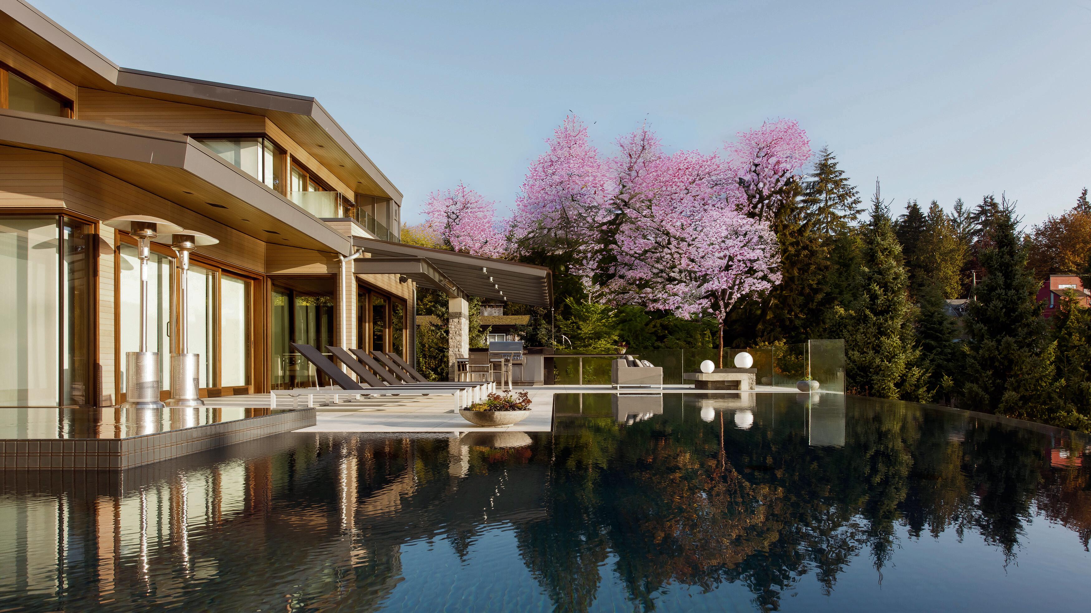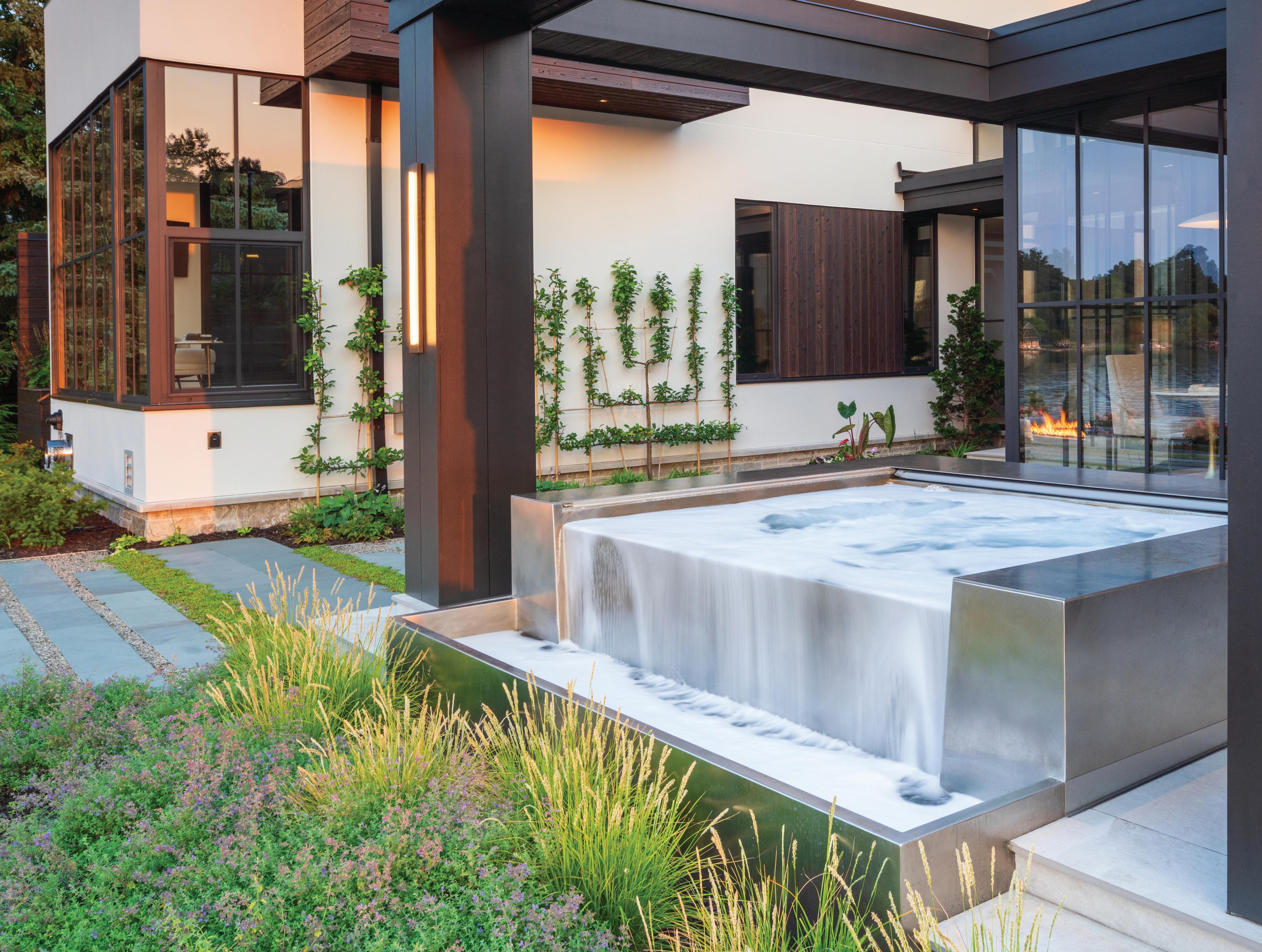 The home has a strong wellness component, as well. “We added fine finishes and features, such as a double outdoor shower, teak soaking tub, and Carrara marble in the bathrooms,” says Mumford. On the lower walkout level, the family can enjoy all of the pleasures that a commercial spa might offer. There’s a Himalayan rock sauna and rain shower, a gym with a rubberized floor and direct outdoor access, and a deck with an eight-person hot tub. When the workout is done, a nearby recreational game room with a bar awaits. “The lower level is a highly versatile space,” adds Slater.