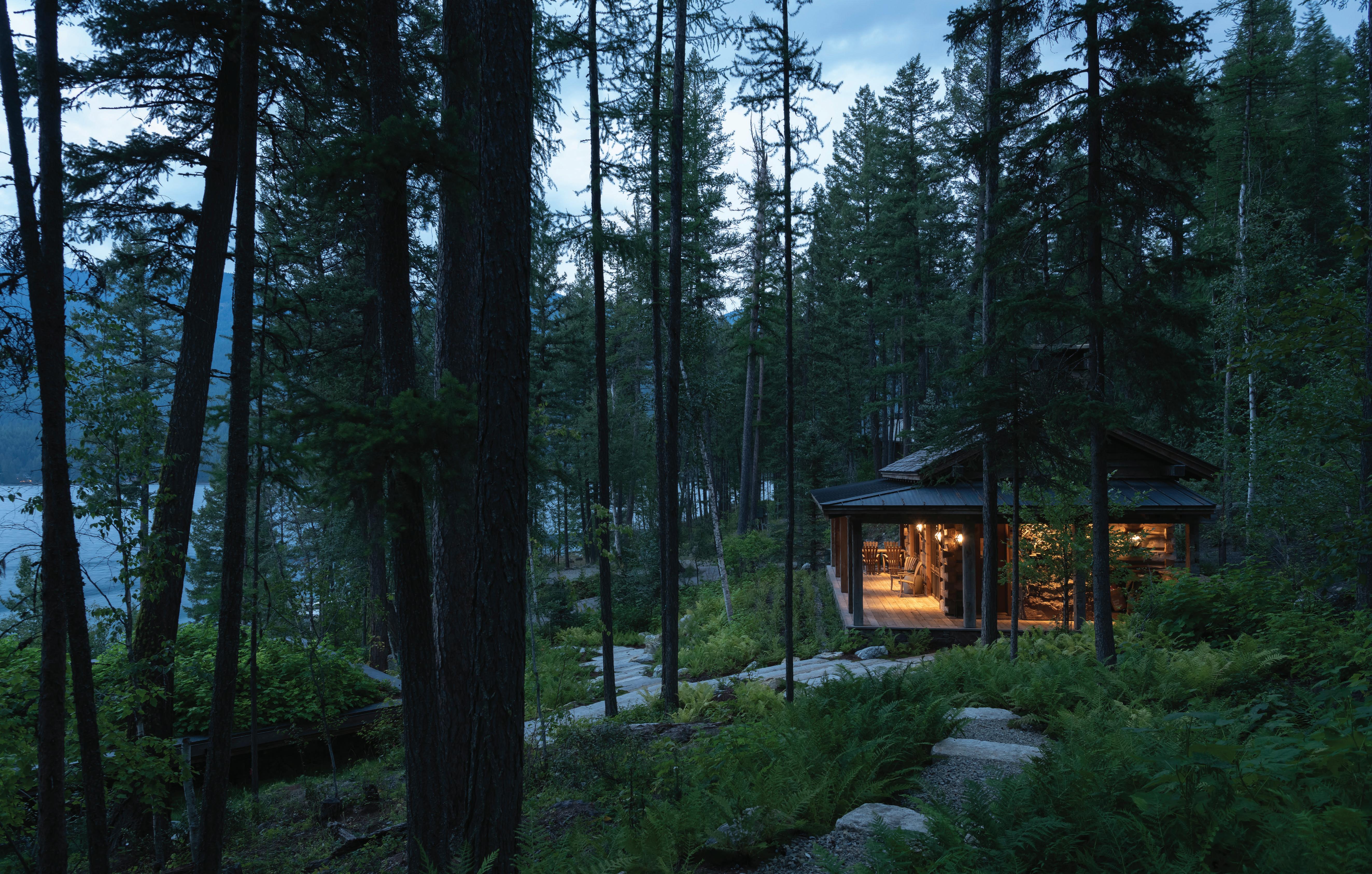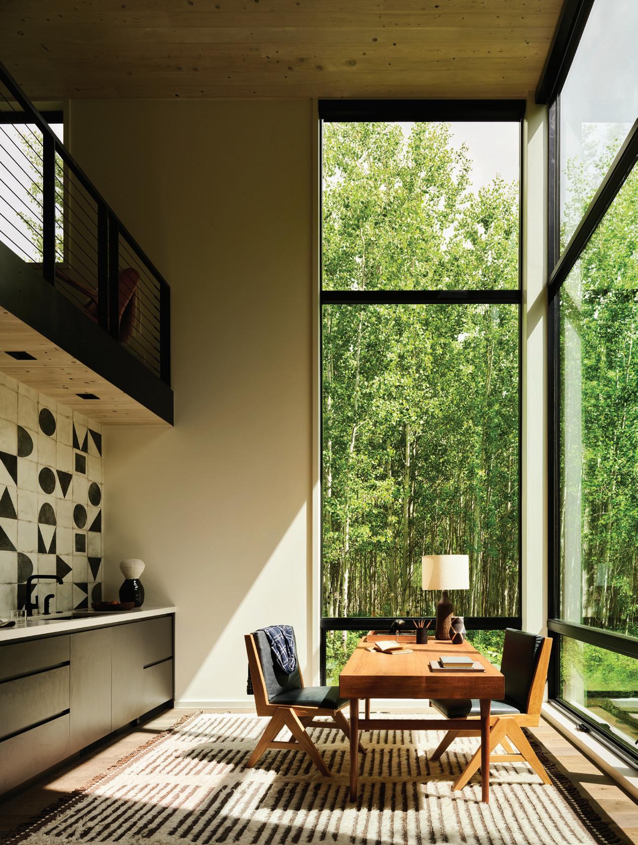 CLOCKWISE FROM TOP LEFT: Above the homeowner’s office, a lookout tower is a popular place of reprieve to watch the sun rise or set. It references a U.S. Forest Service fire tower that was once on the property. • In the homeowner’s office, floor-to-ceiling glass walls bring the outdoors into the interior. “I do my best thinking and my best creative work here because it’s just so peaceful, so beautiful, so conducive to opening up your mind to the fullest extent that you can,” says the homeowner.