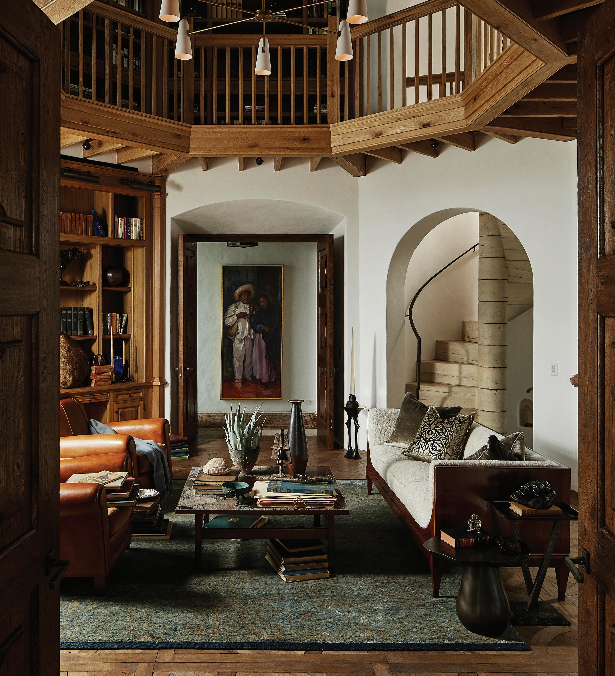 This wing also includes a glass-enclosed lookout tower that Locati designed in homage to a U.S. Forest Service fire tower that was once on the property. The tower is the house’s highest point and serves as a peaceful retreat with a fireplace, comfortable seating, and a telescope for stargazing.