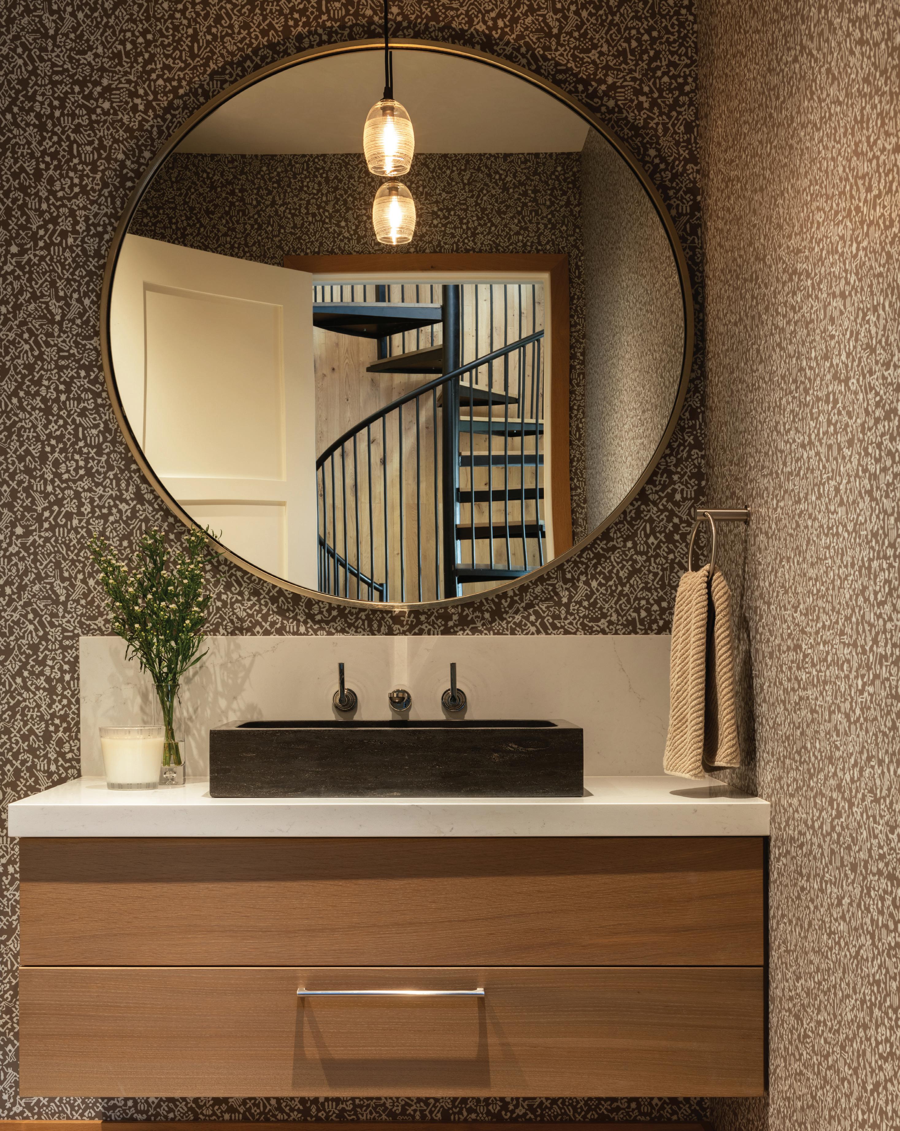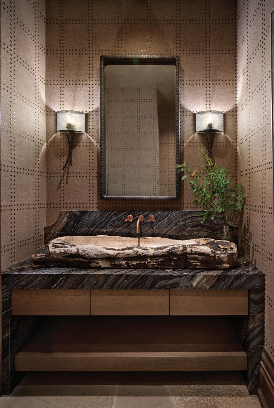 DeLeo & Fletcher, who have designed more than 10 residences for the homeowners over the years, incorporated a variety of organic textures in this powder room to play off the theme of nature.