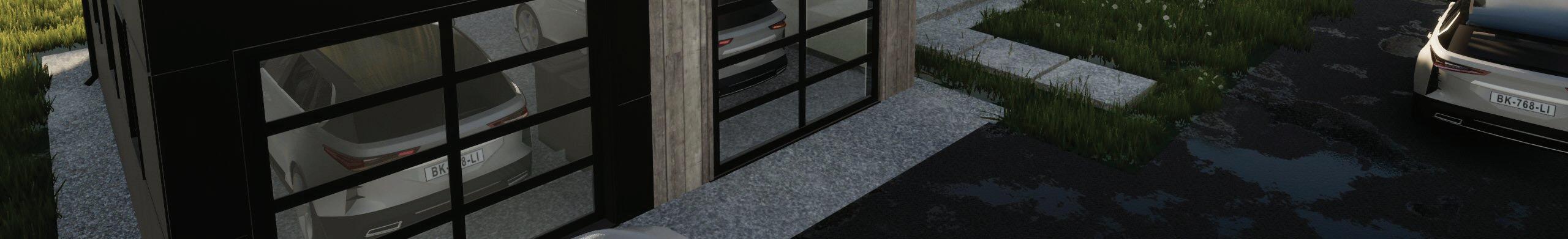 FROM TOP: The 1,500-square-foot garage with a living roof is customizable for the homeowner’s specific needs, with plenty of space for multiple vehicles, recreational equipment, a workshop, and more. • Surrounded by glass and situated in the middle of two wings that separate the private and public rooms, the foyer has an atrium feel.