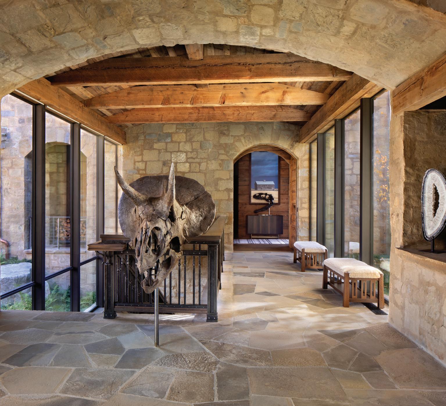 CLOCKWISE FROM TOP LEFT: A rare fossilized triceratops skull in the front entry retained much of its original material during excavation. “Everyone likes to get the picture taken in front of the triceratops skull,” says the homeowner. In the background, a fossilized allosaurus marks the entrance to the homeowners’ wing • DeLeo & Fletcher created this vanity from a single piece of natural stone, keeping with the theme of elevated natural forms. • Tucked away behind the kitchen is a butler’s pantry, ensuring that both beauty and functionality play a role in the main living areas.