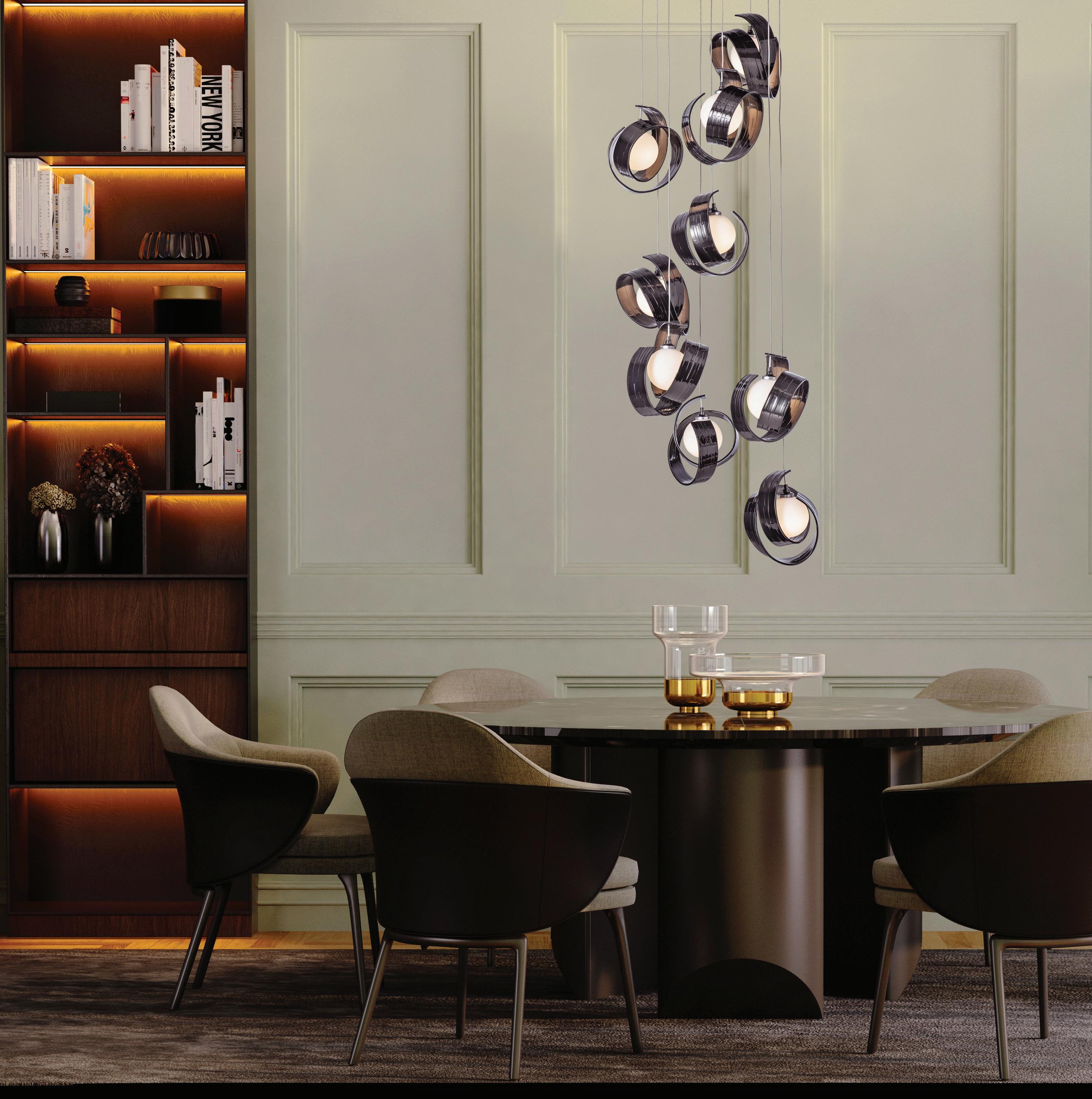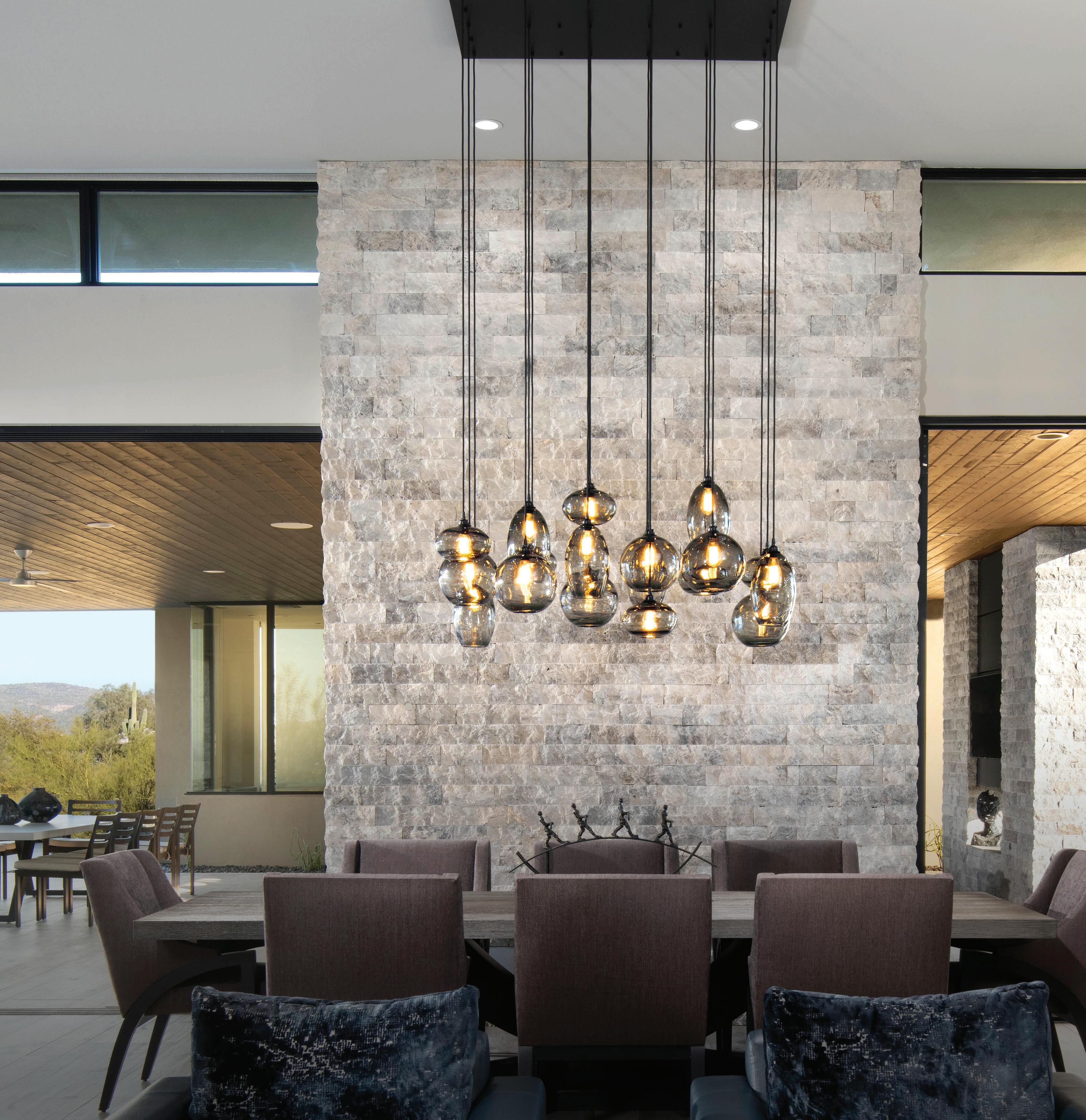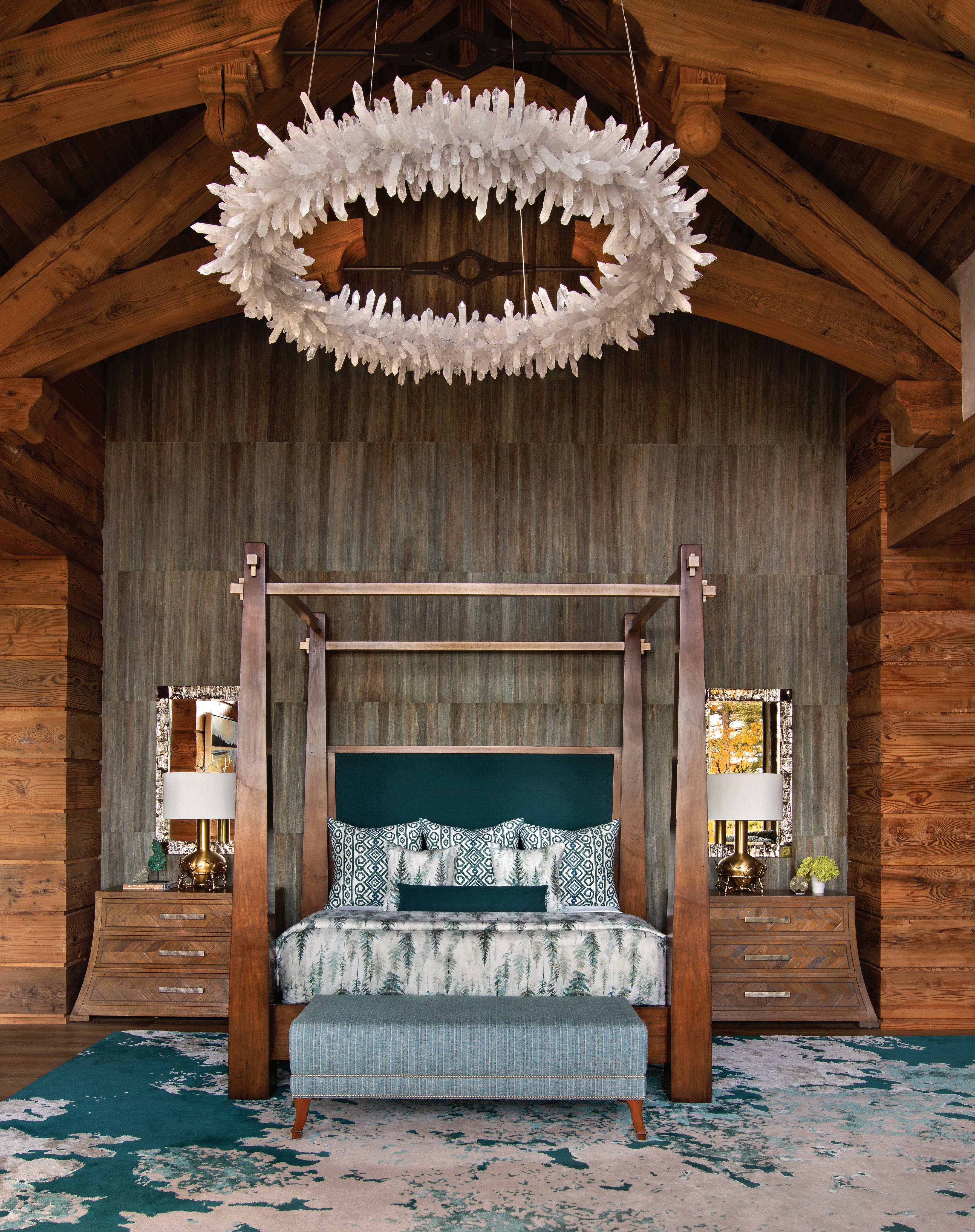 In the primary bedroom, a floating chandelier that recalls precious minerals adds drama and ties in with the other natural history objects found throughout the home.