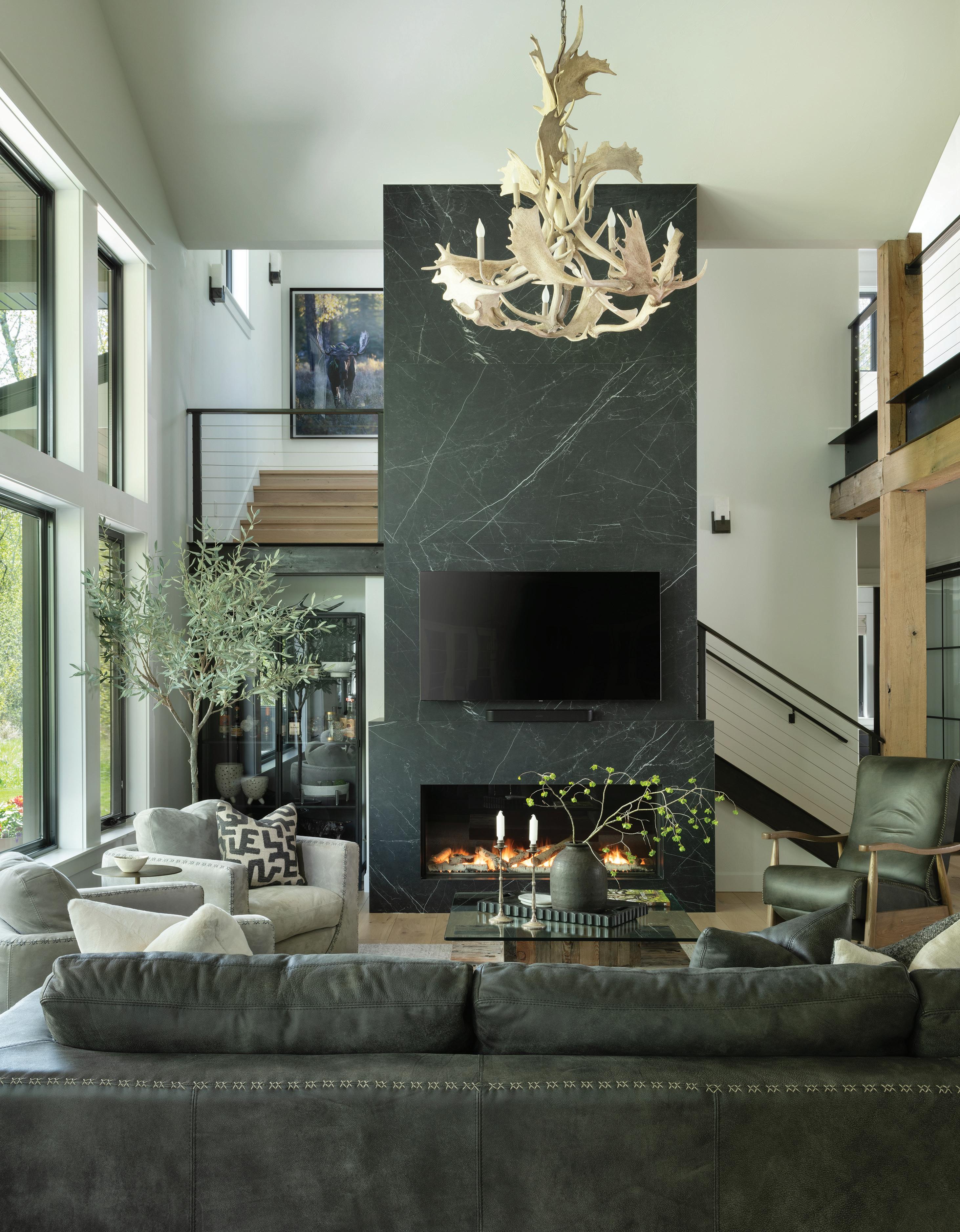 The material palette is compatible with its alpine location. Timeless, organic materials on the exterior — Western red cedar, Ipe decking, and charcoal quartzite — converge with contemporary glass and blackened steel. Living finishes continue inside, with marble, sandstone, and European white oak. Charcoal quartzite repeats on the main-level great room’s fireplace, where the vaulted ceiling is paneled in warm wood.