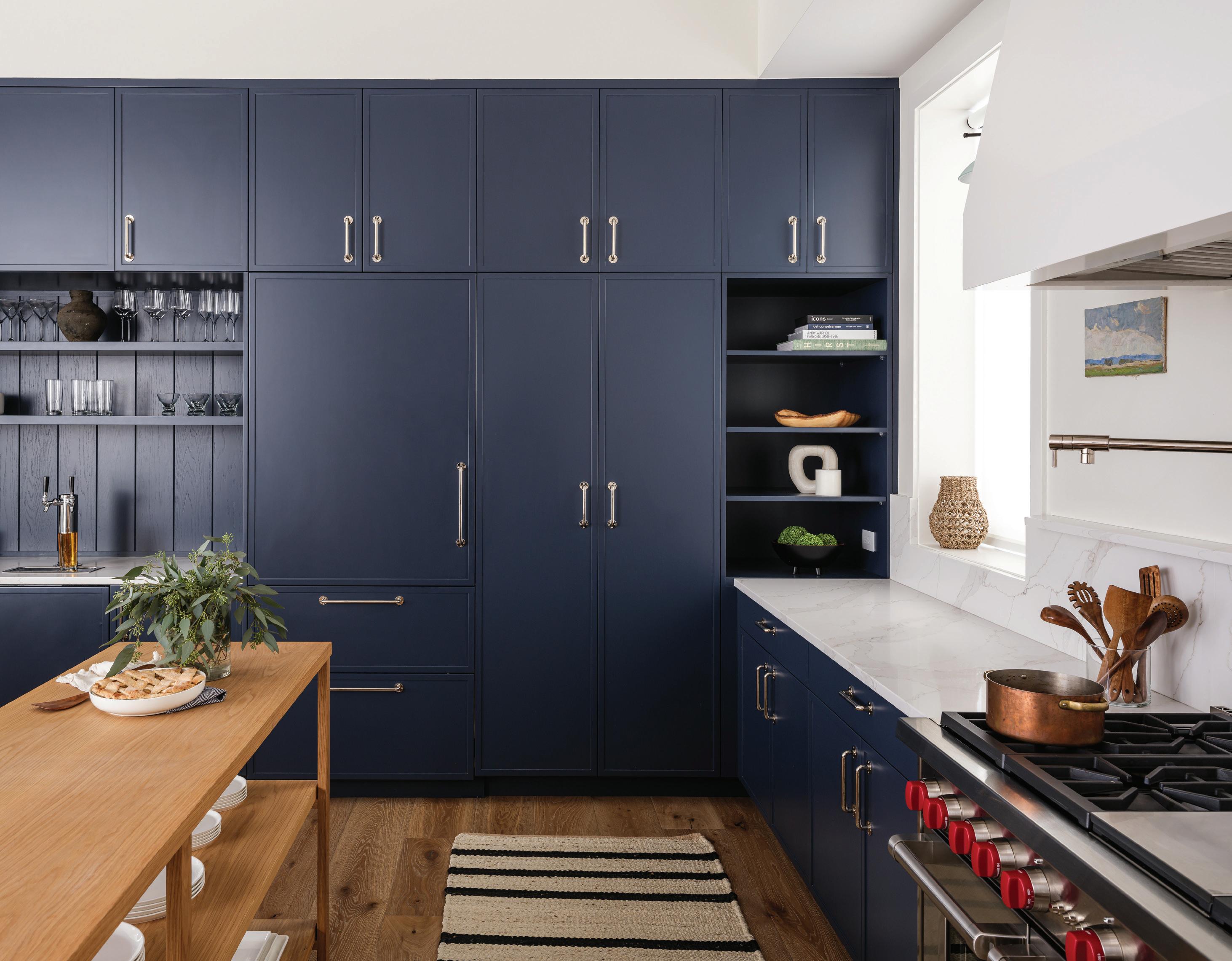 Thoughtful design in the kitchen includes entertainment-centric details, such as hidden storage to the left of the range designed to mimic a vintage English pantry. Two double-door refrigerators on the right side of the room are concealed behind paneled doors. Waterworks fixtures and a honed Pietra Cardosa stone countertop elevate the look.