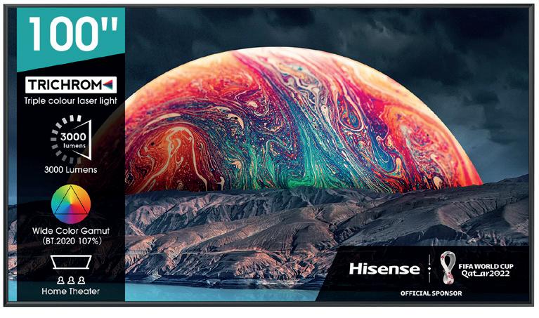 PG 60 LASER TV’S 100” Laser TV-100L5F • 4K UHD Picture Quality • Tuner Built- in • X-Fusion™ Laser Light Source • 100” Ambient Light projection Screen • HDR Compatible • HDMI *4 • 3 Year Warranty • (10132004) USB X2 X4 SMART LAZER TV 100” Smart 4K Laser TV-100L9G • 4K UHD Picture Quality • 100” Ambient Light Projection Screen • Eye-friendly Design (No eyestrain) • TUV Low blue Light Content Certified • Built- in Tuner • Pure Tricolor Delivered from Laser Light • HDR Compatible • Smooth Motion • (10279328) USB X2 X3 SMART LAZER TV 120” UHD Laser Smart TV-120L5F • 4K UHD Picture Quality. • 120” Ambient Light Rejection Screen. • Eye-friendly Design (No eyestrain) • TUV Low blue Light Content Certified. • Tuner Built- in • X-Fusion™ Laser Light Source • Dolby ATMOS Audio • Powered by VIDAA with Plenty of Apps • (10250525) USB X2 X4 SMART LAZER TV 100” 4K 120” 4K 100” 4K LASER TV The ultra short throw Laser TV projects a colourful and bright 4K image onto an ambient light rejecting screen designed for watching in any room in the house. The picture is bright and detailed in all types of lighting, letting you enjoy the ultimate big TV viewing experience in a variety of room conditions. Pricing & product available in-store and online at www.hificorp.co.za