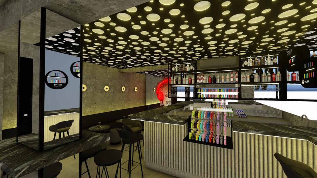 El espacio interior se conforma al rededor de la barra en “L” dónde se exhiben tanto licores, cómo los “Vapes”.