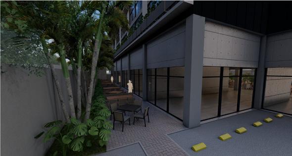 En el primero se encuentran siete (7) locales comerciales, cada uno con su terraza en el exterior cubierta, parqueaderos y bloque donde se sitúan los baños y la zona administrativa