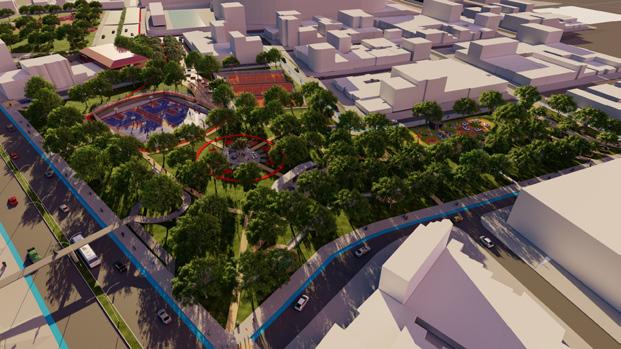 Esto mediante la redensificación de la masa arbórea de la zona y dejandóle al barrio un nuevo espacio para la recreación pasiva (respondiendo a necesidades de establecimientos vecinos) y espacios de recreación activa (manteniendo la conexción con los equipamientos mas próximos que hay en la zona.