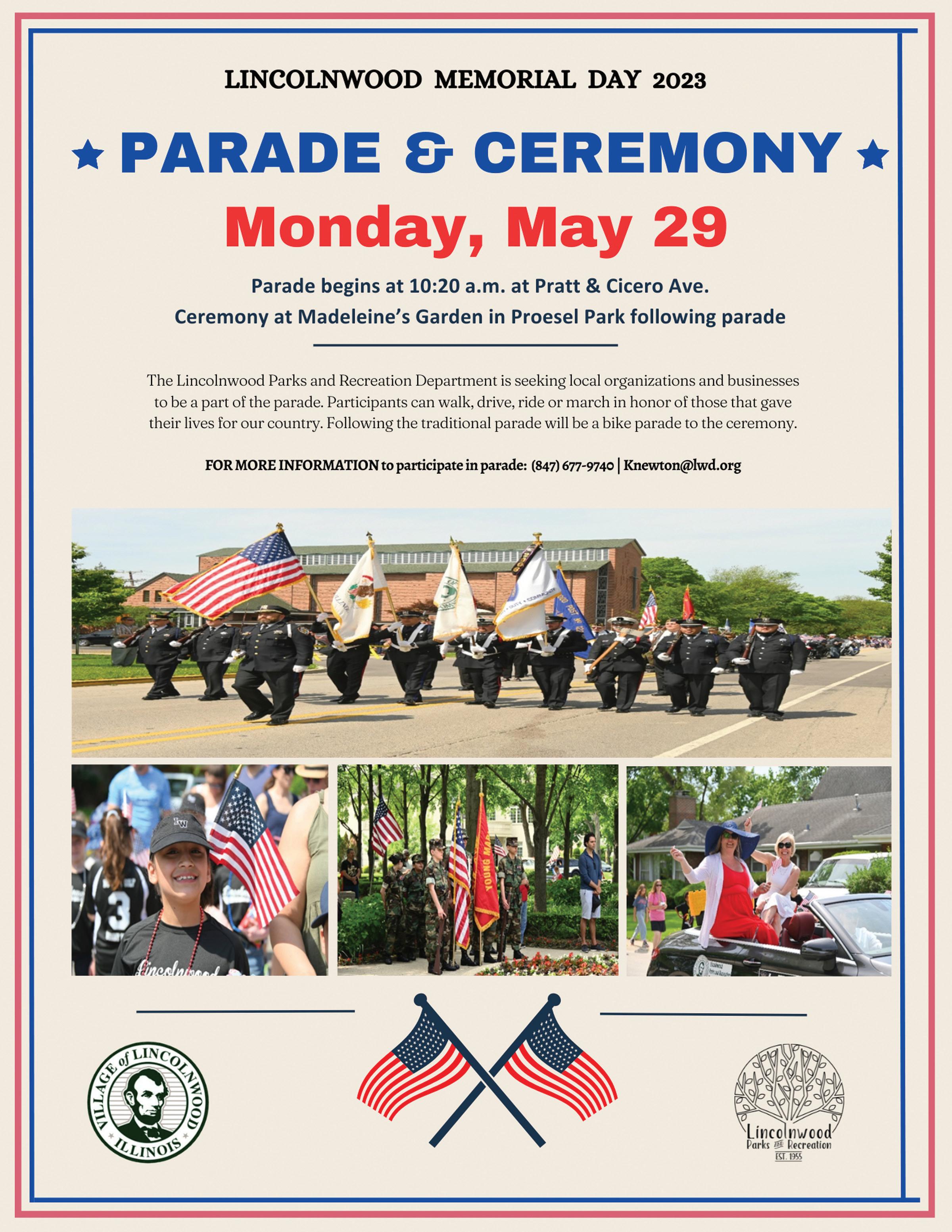 The Lincolnwood Parks and Recreation Department is seeking local organizations, businesses, and residents to be a part of the parade. Participants can walk, drive, ride, or march in honor of those that gave their lives for our country. If you are interested in participating in the parade, please email Kandice Newton, Recreation Supervisor at knewton@lwd.org.