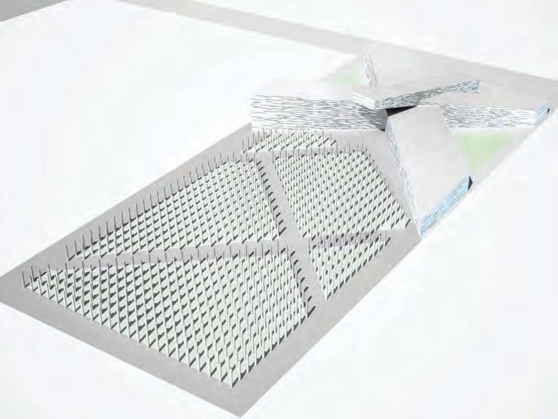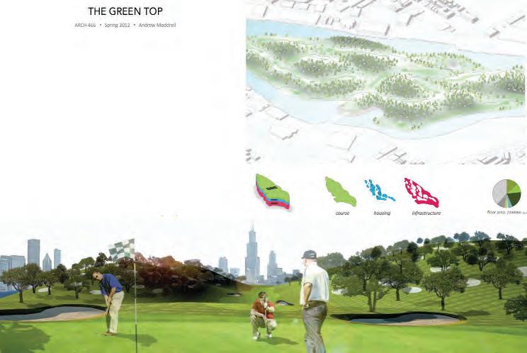 Designing a golf course inside an urban environment required extensive research and visitations, which led to a field trip to Biloxi, Mississippi. Since golf courses are known for predominantly flat landscape, the design strategy was to create a mountainous surface divergent of the city’s grid. This provides the opportunity of integrating residential and commercial spaces subsided beneath the extruded mounds of land. The housing units, although subterranean, contain openings onto the course to allow an interaction between the landscape and the home. In the end, an urban agenda is presented by having a community operate independently and peacefully