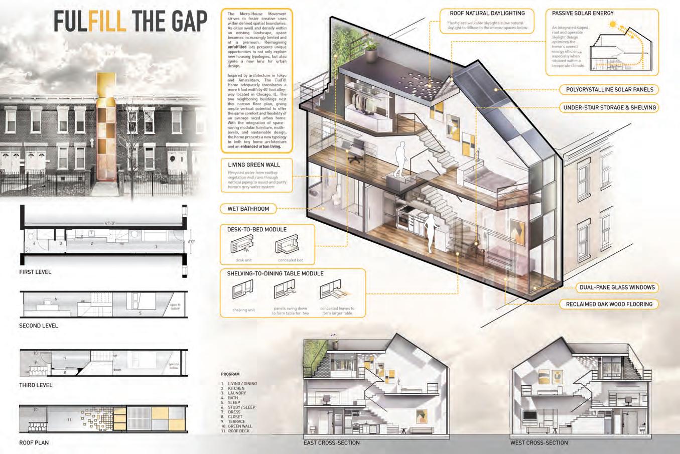 Inspired by architecture in Tokyo and Amsterdam, The FulFill Home adequately transforms a mere 6 foot width by 40‘ foot alleyway located in Chicago, IL. The two neighboring buildings nest this narrow floor plan, giving ample vertical potential to offer the same comfort and flexibility of an average sized urban home. With the integration of spacesaving modular furniture, multilevels, and sustainable design, the home presents a new typology to both tiny home architecture and an enhanced urban living.