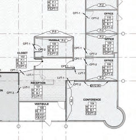 LVT: Tarkett - Sumac - Terrain Location: Break Room, Reception, Copier Areas CPT: Mohawk Group- Tactile - Granite Location: Open Office CPT: Mohawk Group - Tactile - Soladite Location: Conference Rooms & Offices P3 Paint 1: (Main Paint): Benjamin Moore - Ice Mist Paint 2: (Accent Paint): Benjamin Moore - Graystone Paint 3: (Accent Paint): Benjamin Moore - Blueberry Paint 4: ( Accent Paint): Benjamin Moore - Champion Colbat Paint 5: (Accent Paint): Benjamin Moore - Cabana Green Countertop: Formica Bleached Concrete Plastic Laminate: Wilsonart - Snow Geo Location: Milwork Tile: Ceramic Technics Subway Tile Restroom walls and backsplash P4 P2 P1 P5 CPT: Shaw - Common Tile - Cyan Location: Collaboration Areas Tile: Ceramic Technics Porcelain Tile - Silver Matte Flooring OPEN OFFICE RESTROOMS WALL PAINT Wall Base - Johnsonite - Gateway