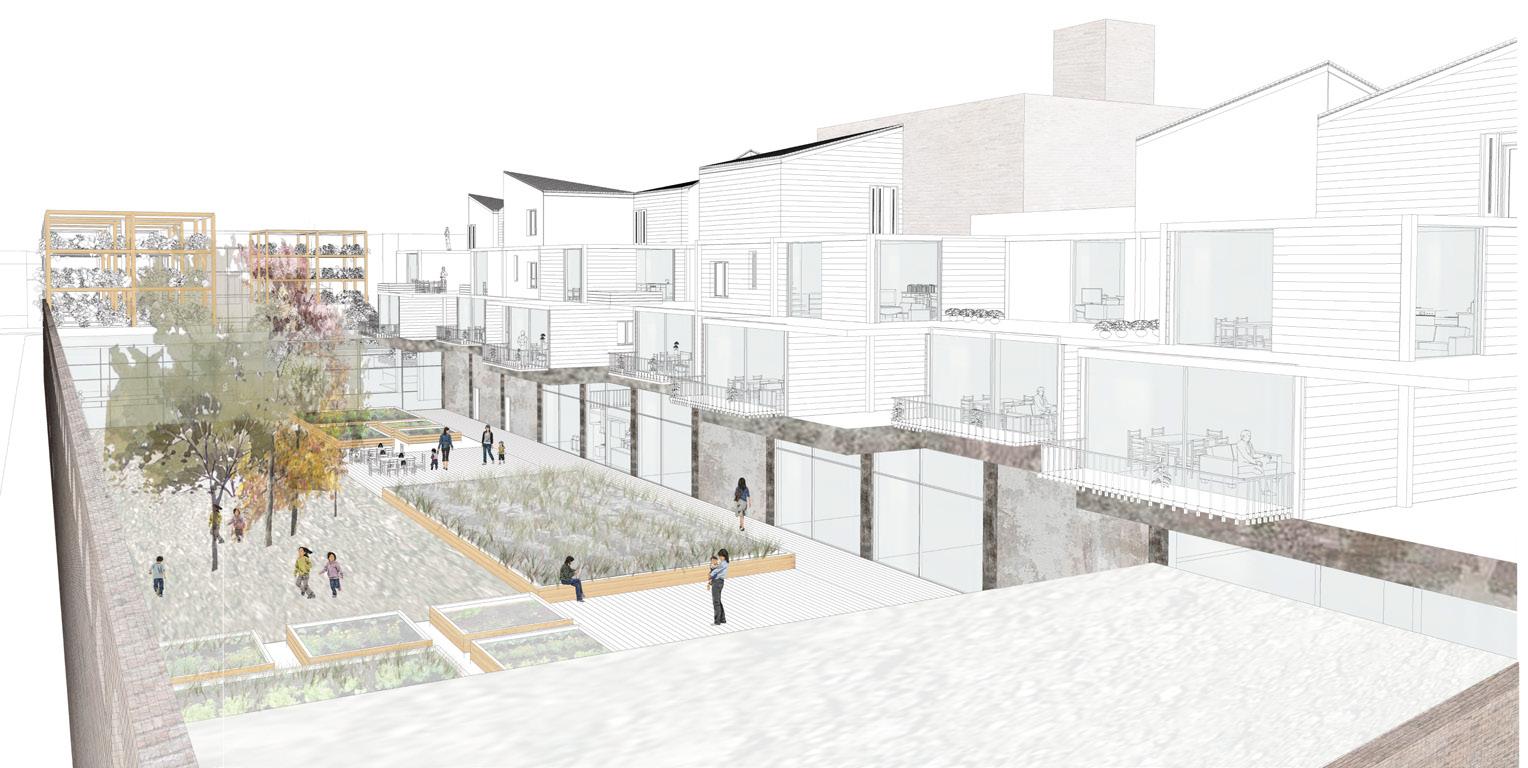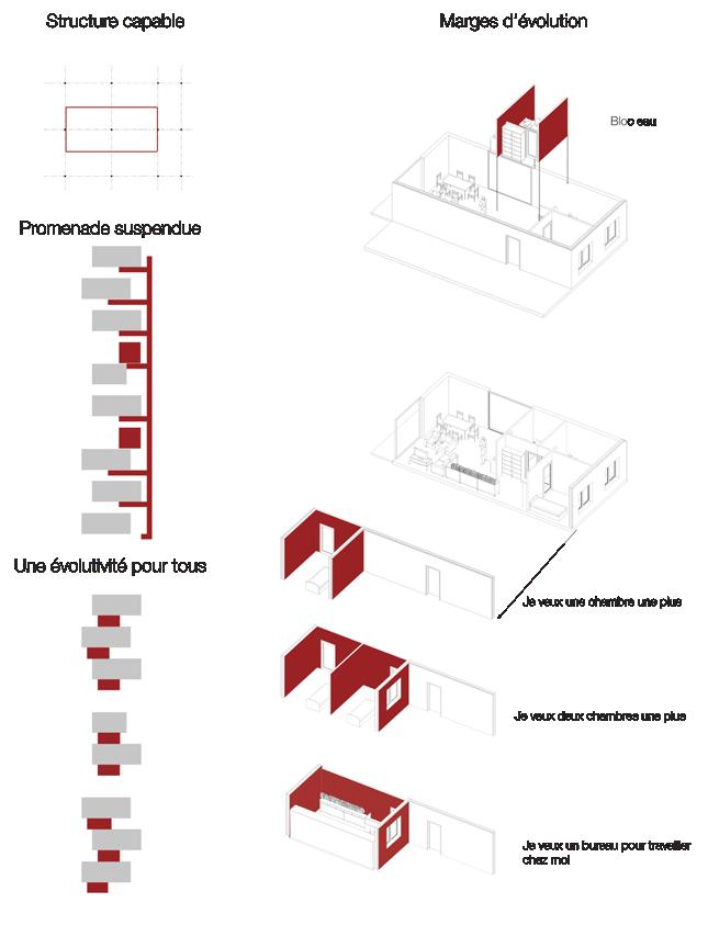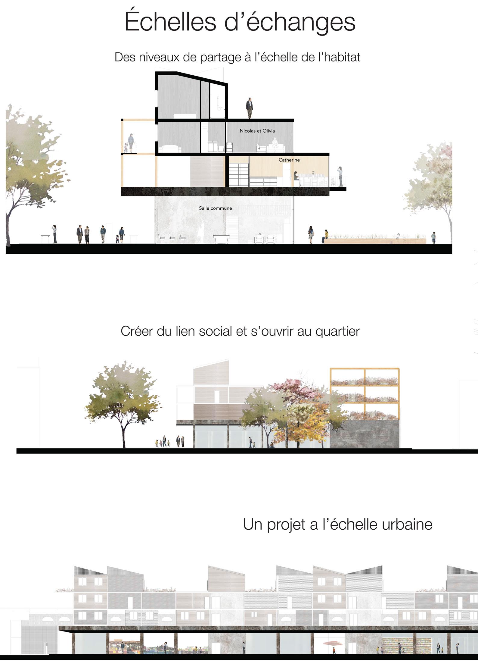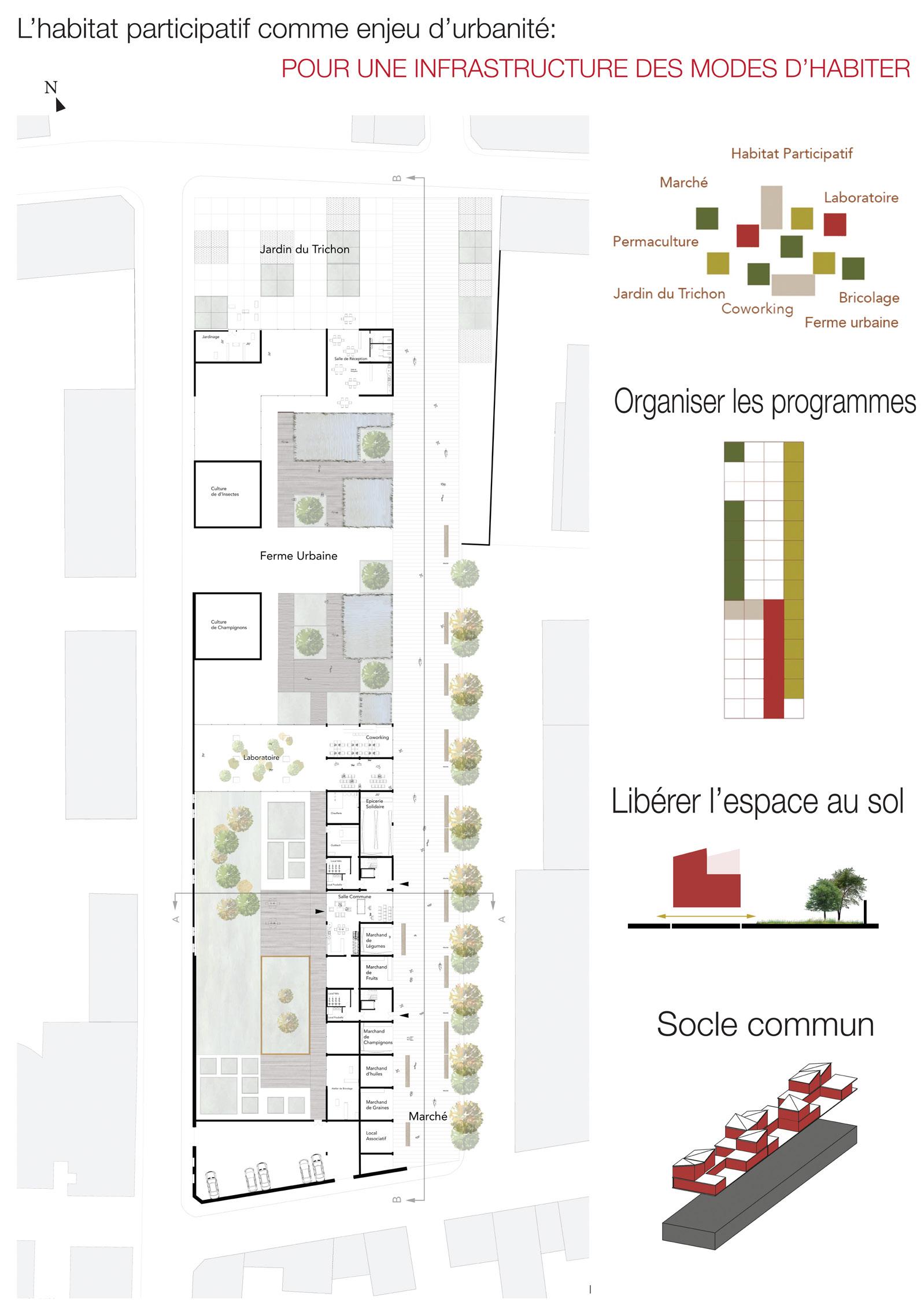 Ce projet fut conçu avec un groupe d’habitants réel, en relation avec la mairie de Roubaix. Un projet étudiant qui visait à donner des pistes pour une future réalisation du L’objectifbâtiment.de ce projet était de réaliser une structure capable au quelle les habitants pouvaient insérer leurs habitations et leurs désirs d’aménagement plus personnels. Un sentiment d’appropriation de leur espace par leur participation à la conception. Ce projet s’accompagnait d’une ferme de permaculture, que les habitants avaient déjà entrepris en plein milieu Roubaisien. Créer du lien social et s’ouvrir au quartier par les pratiques collectives et en même temps, garder une distance nécessaire entre l’espace public et celui de l’habitat, constituaient l’accroche du projet. Une négociation qui invite aussi quant à la réflexion de la liberté laissée aux habitants.