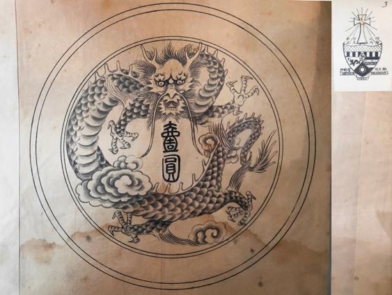◎ 宣統三年壹圓銀幣設計師L.GIORGI手稿一套三張,包括:(1)第一次行龍樣,面朝外,背面有邱文明收藏標籤和用于系至奏摺的系帶;(2)第二次行龍樣,立龍,面朝左, 右側貼有邱文明收藏標籤,龍面後用于壹角、貳角及伍角幣;(3)第三次行龍樣,面朝右,龍右側貼有邱文明收藏標籤,皆為邱文明藏品。