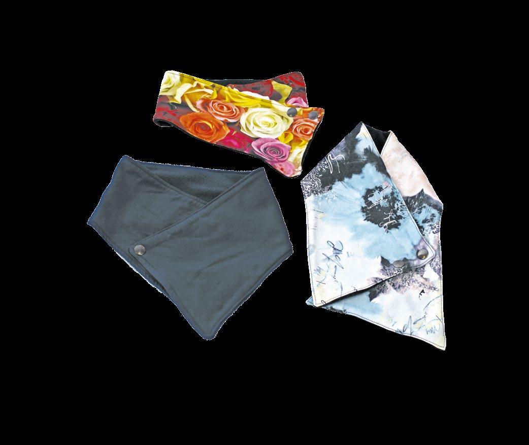 Som udgangspunkt leveres Venture-smække med tryklåse, men de kan efter ønske også leveres med velcro-lukning. Venture-smække kan også bruges til at skjule tracheostomi eller som almindeligt tørklæde.