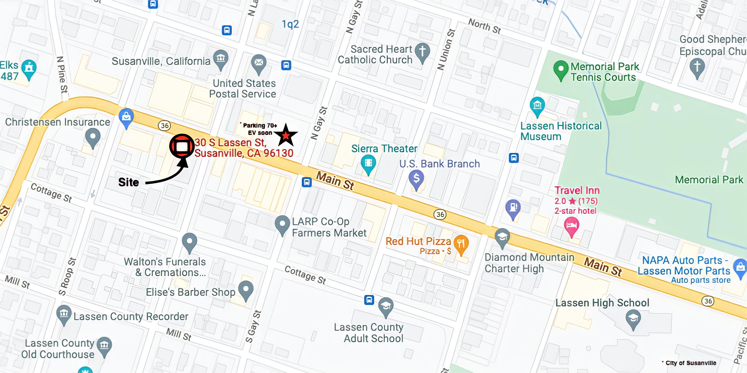 The property is strategically located downtown on the corner of South Lassen and Main Street (California Hwy 395) in Susanville, Ca , the County seat of Lassen County