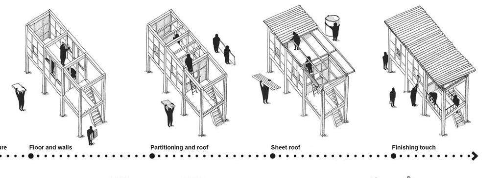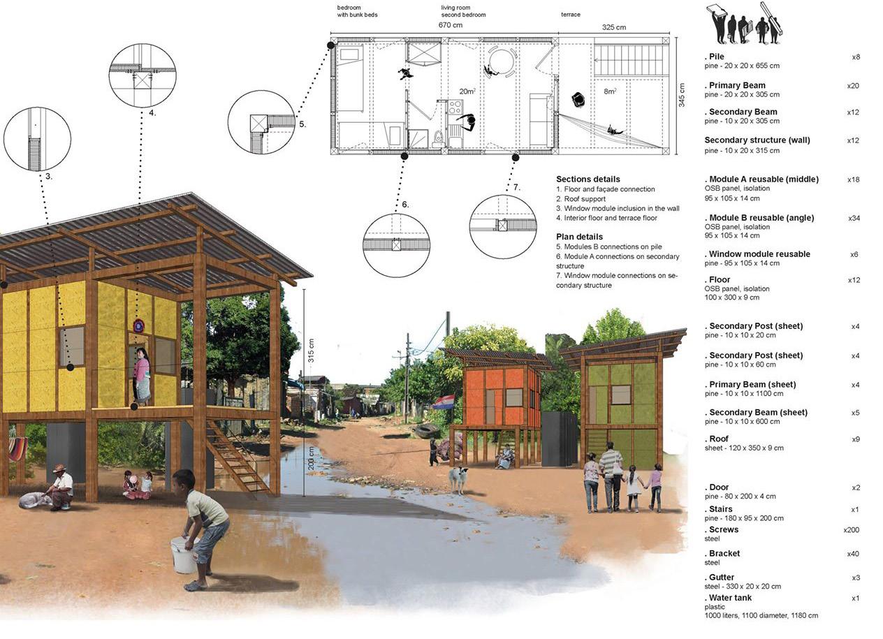 Au Paraguay, 1 400 000 habitants vivent dans les logements informels, étant ainsi les plus vulnérables au fréquentes et violentes innondations touchant le pays. Les logements devaient donc être faciles à être monter et démonter pour offrir de manière temporaire un lieu de vie confortable, avec des qualités architecturales permettant une évolution et une appropriation de leur logement par les habitants. Construits sur pilotis, nous avons cherché à standardiser le plus possible d’élements les composants, permettant d’une part de réduire le plus possible le coût, et d’autre part faciliter une construction rapide par les habitants. La trame structurelle est régulière et le remplissage se composent de panneaux d’OSB isolés, assemblés avant la construction. Leurs dimensions permet à une personne seule de les porter, et leur facilité d’assemblage permet une construction rapide. Les habitants peuvent choisir où placer les ouvertures, et comment cloisonner l’espace intérieur. La toiture en pente permet de récupérer les eaux de pluies, filtrées et sauvegardées dans un reservoir d’eau, pouvant étre connecté à un ou plusieurs logement.