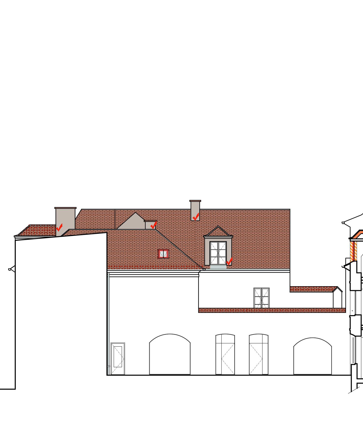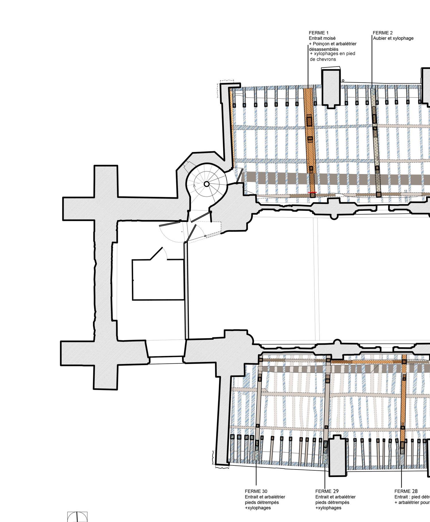 La stratigraphie historique met en lumière les bâtiments les plus anciens et leur supposée typologie, afin de comprendre l’évolution et les modifications du bâti, et de pouvoir rétablir aux mieux les dispositions d’origine, notamment ici les couvertures et lucarnes.