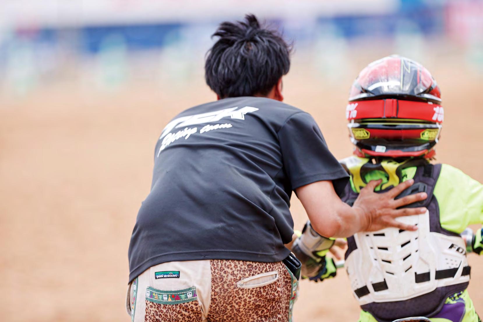さて、モトクロスは横一列で大迫力の一斉スタートを切り、定め られた時間 +1 周の間、どれだけ速く走れるかを競います。会場の 新千歳モーターランドは、日本では珍しいサンド質のコースです。路面 が荒れやすいため技術差が出やすく、さらに低速区間から高速区間 までのスピードレンジが大きくアップダウンもあり非常にテクニ カルで、体力の有無が試されるコースとなっております。