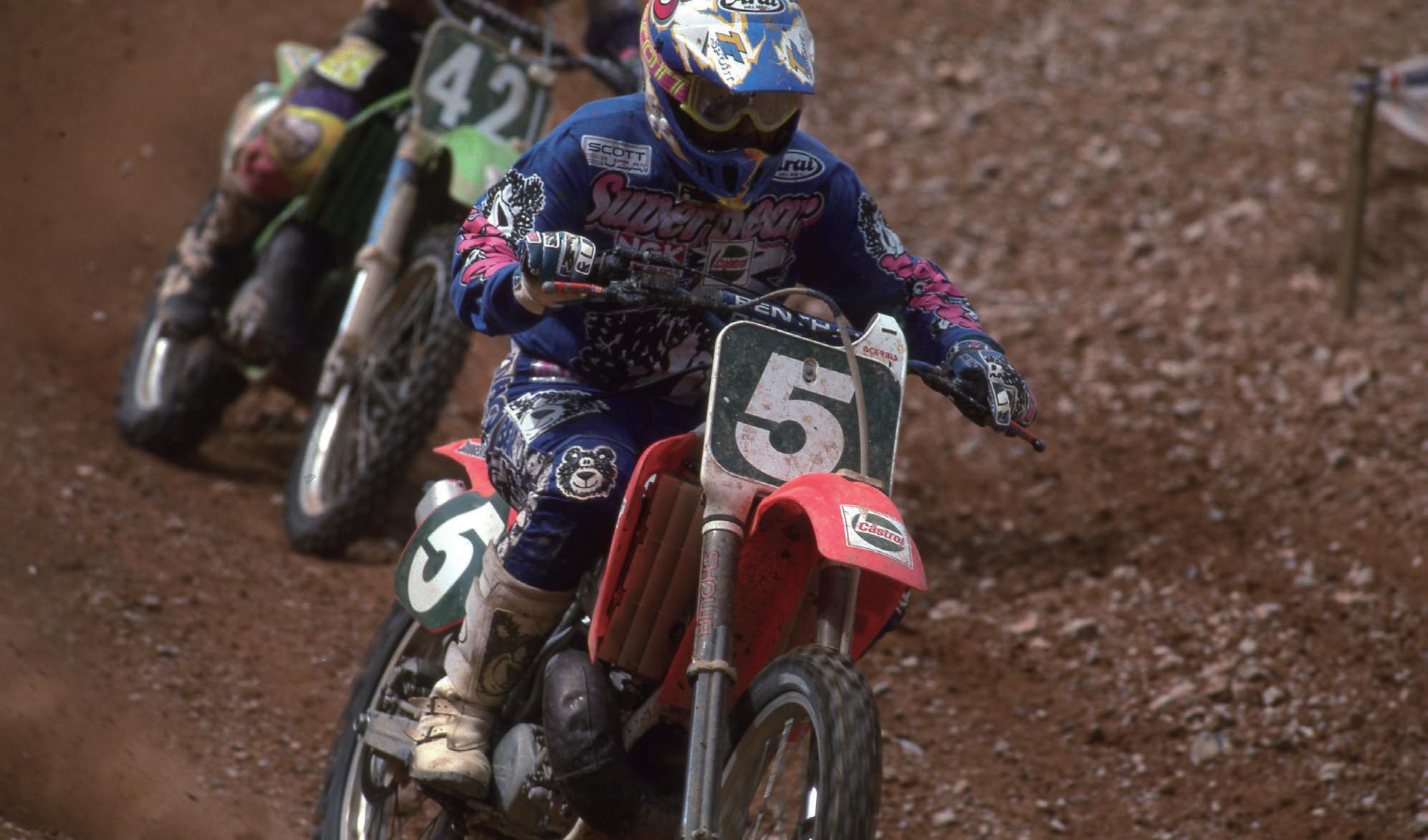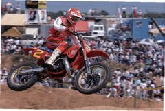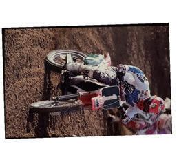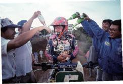 岡崎和美:北海道大会で、ダブルプロリンク乗った時。実はね、ダブルプロリンクは彼が最初から使ったんじゃなくて、佐藤健二さんと僕がセッティングをした んです。最後の最後に彼が乗って「これで今回走る」ってなったんです。何でかというと、どこか怪我をしていたんですね。ダブルプロリンクって全伸びが1番 剛性が高くて、サスペンションが縮むと剛性が低くなるんです。ギャップで振られたり、いろいろあったと思うんだけど「吸収性」が良いところをとって彼は使った んだろうと思います。そのレースの決勝ヒート2をゴールした際に、倒れ込んだと思うんだよね。レース中は体力的に相当キツかったんだと思う。そこまでレース をできるライダーってなかなかいない。その時の光景は、いまだに印象的で脳裏に残っています。 甲哲男:「やられたら、やり返す」。決勝ヒート1でやられ、ヒート2にパドックを出る時に「行ってくるからな」って。その言葉が出た時は、必ずやり返す時なんです。 で、僕が「やめてください」っていう事が何度かありました。笑