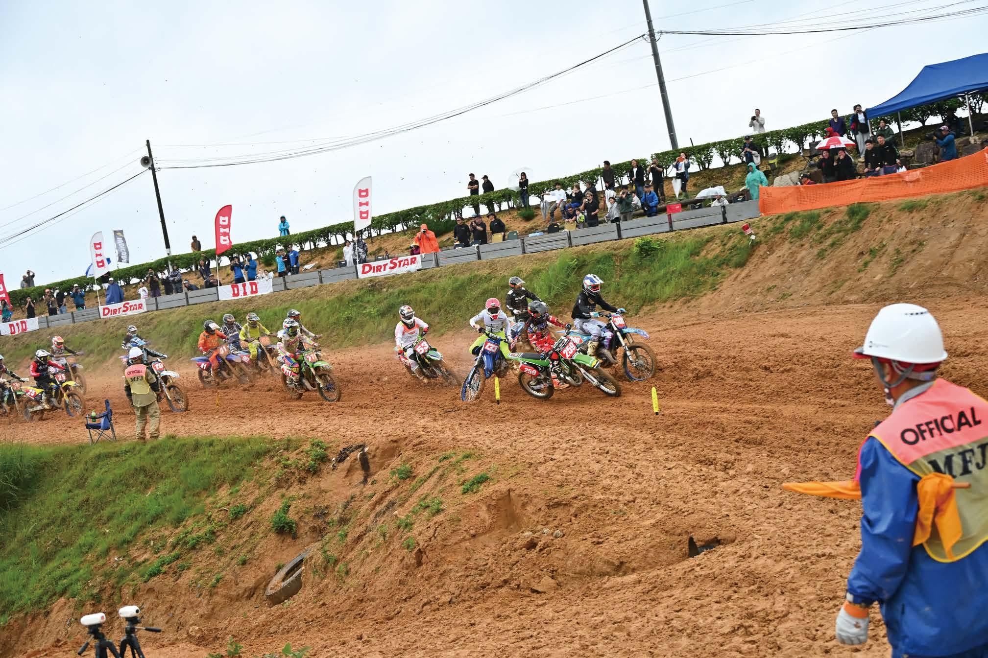 モトクロスは、横一列で迫力のある一斉スタートを切り、定められた時間 +1周の間、どれだけ速く走れるかを競う競技です。