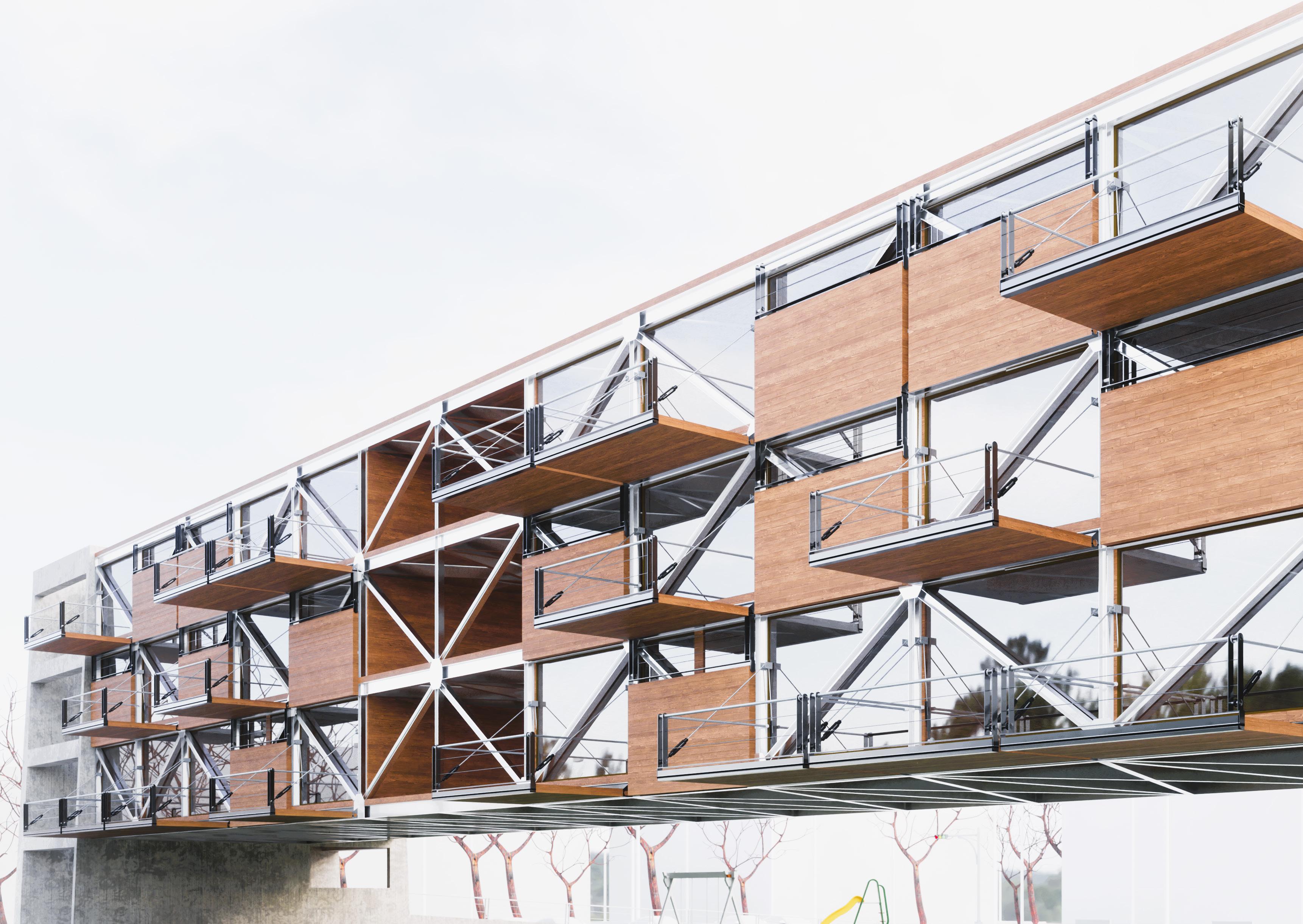 The design's objective was to establish a universal timber building system, emphasizing a structural framework with minimal ground footprint. Achieved through the placement of steel trusses atop structural shafts, which concurrently facilitate circulation between levels, this approach redefines the park's boundaries. Accommodating three levels with timber walls and floors, the steel truss configuration enhances park views, complemented by foldable balconies for an enriched spatial experience. Modular configurations were developed using CLT accommodate units of differrent sizes