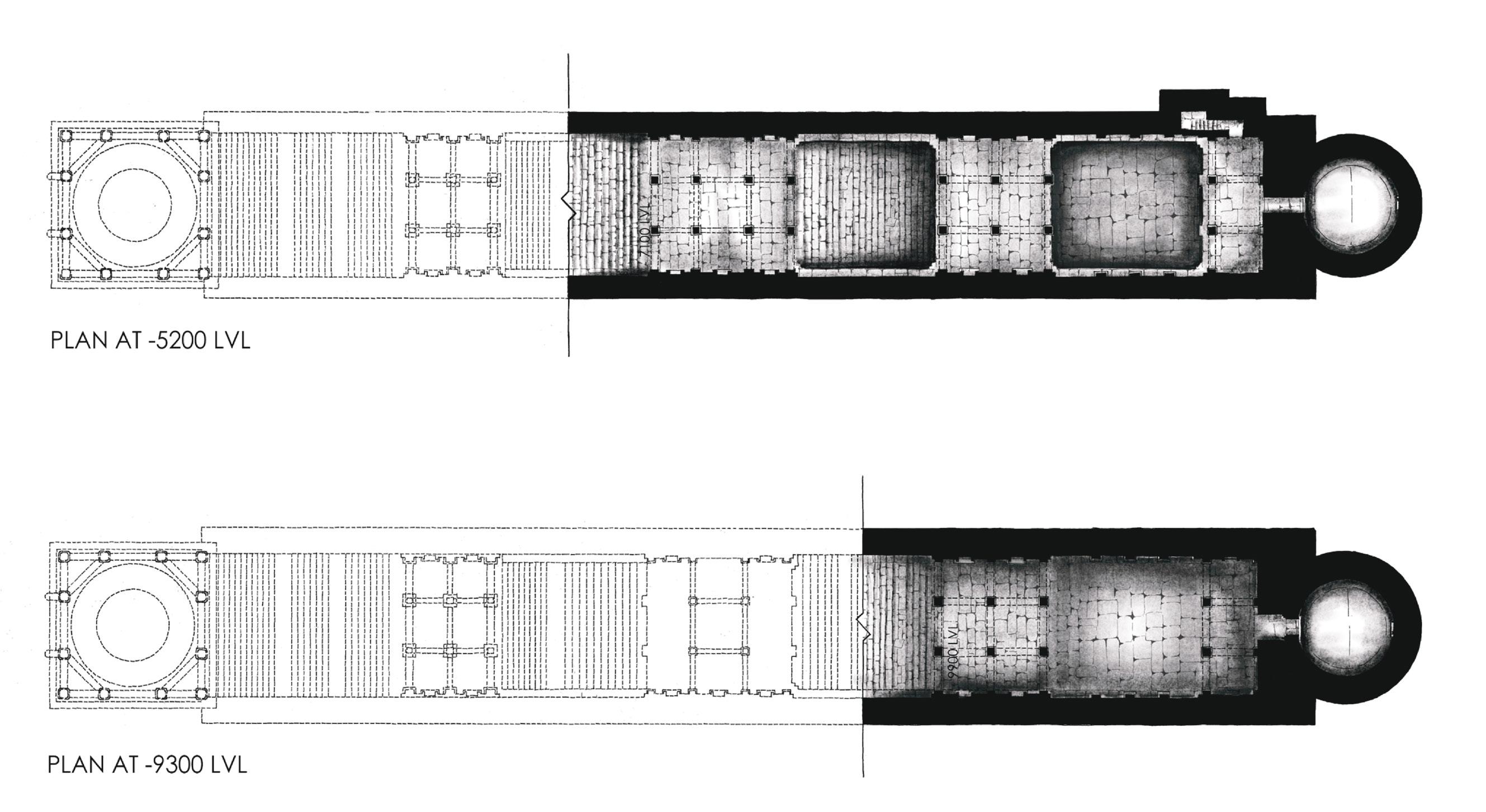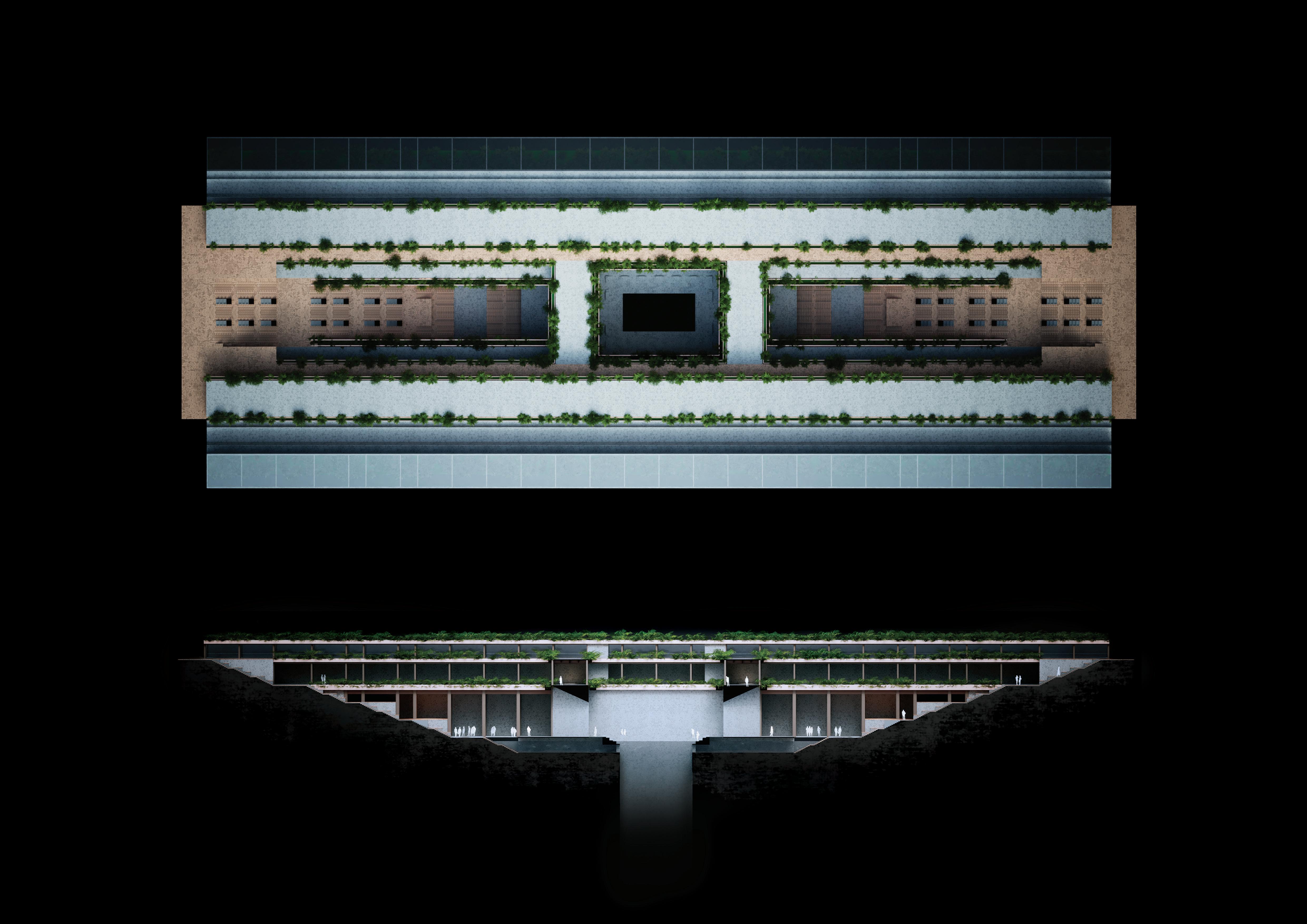 The lower level encompasses an Exhibition Hall distinguished by dedicated niches formed through structural elements. Additionally, it harnesses natural light from the sloping roof above, which doubles as an accessible green space, ensuring a symbiotic relationship between architectural function and environmental integration.