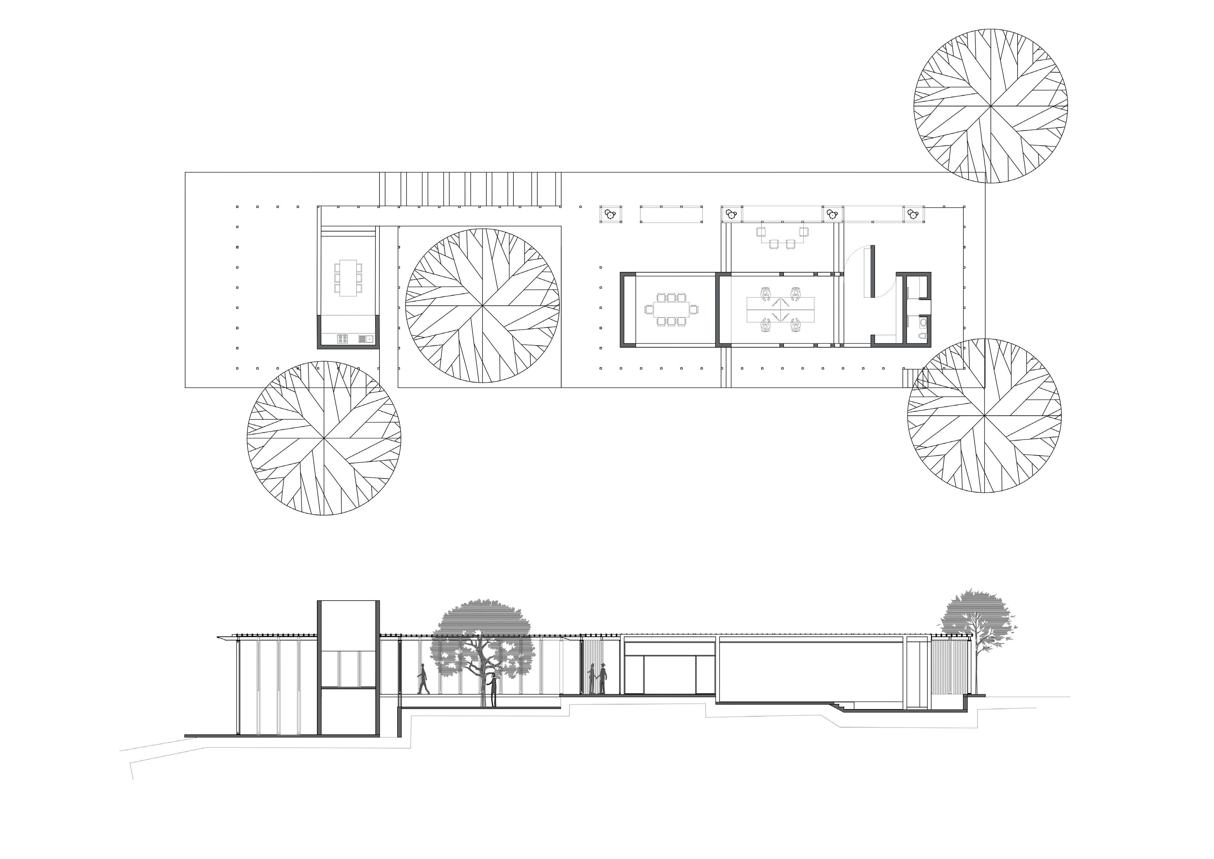 The latter phase of the design process centered on exploring the impact of material selection and construction methodologies on the spatial experience. The central workspace is a concrete structure which provides good thermal insulation.The shaded verandah, composed of timber elements supported by surrounding columns, preserves the volumetric expression of the structure. The outermost volume, features a timber canopy atop its structure, serving to uphold its architectural integrity while also presenting a potential opportunity to cultivate creepers.