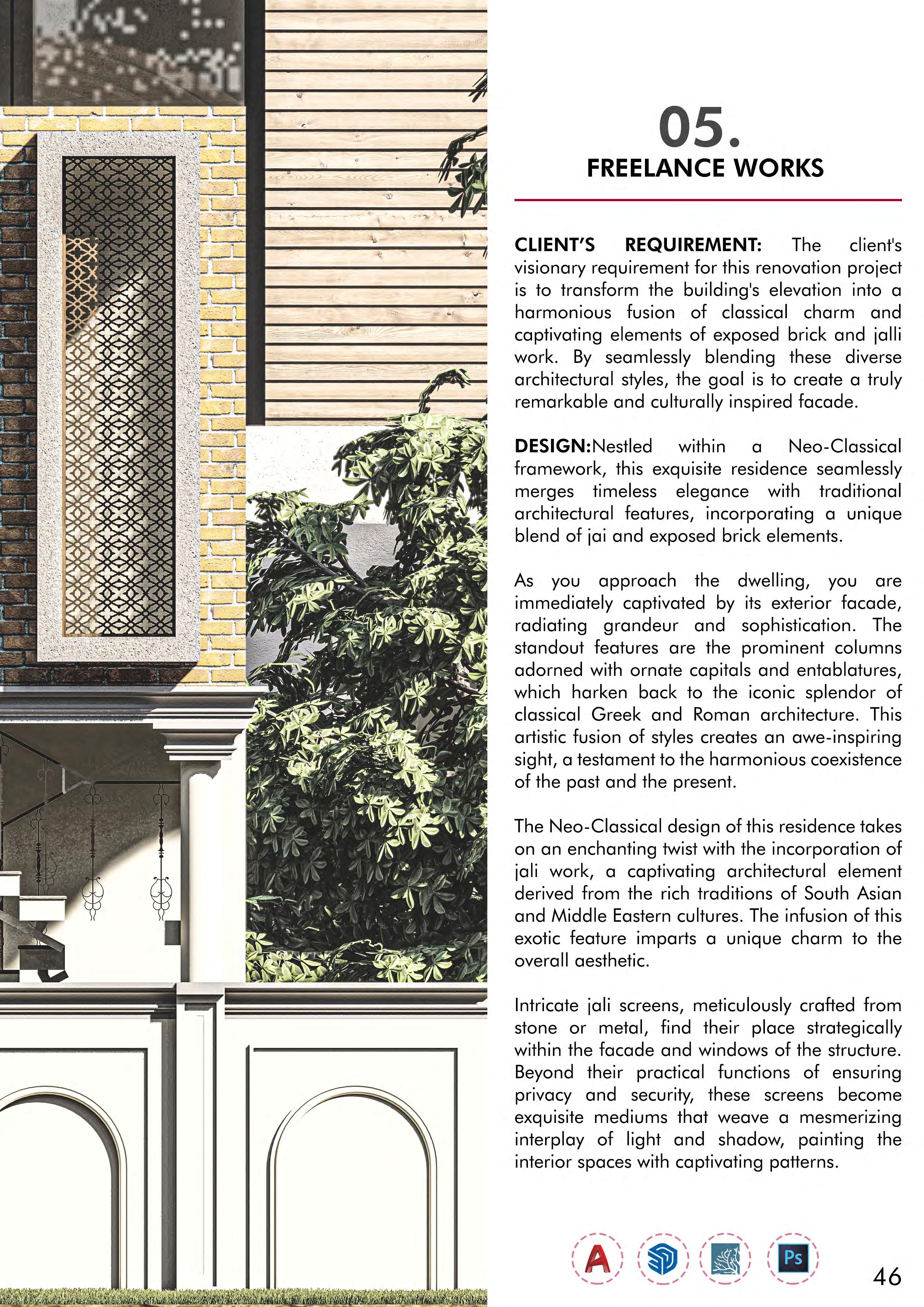 Welcome to my Architectural Portfolio, a curated collection of my finest designs and creations. With a keen eye for detail and a passion for innovative design, I strive to transform spaces into captivating experiences. From sleek urban structures to harmonious residential havens, each project reflects my commitment to functional elegance and sustainable solutions. Explore the intersection of artistry and functionality as you journey through my portfolio.