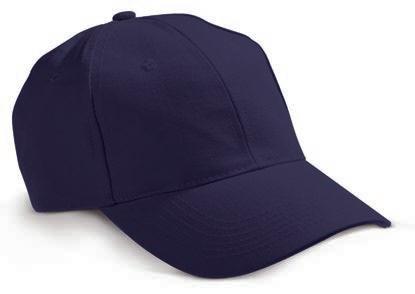 Baseball 100% cotone pesante. Visiera precurvata. Regolatore tipo B con cinturino in tessuto e fibbia. 6 pannelli. TAGLIE: misura unica 58. COLORI: rosso, blu, bianco, nero.